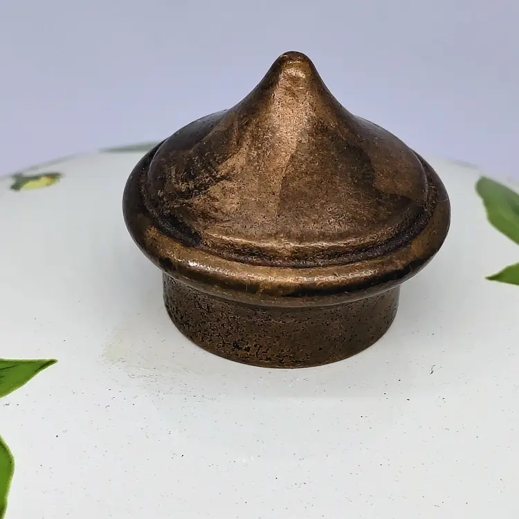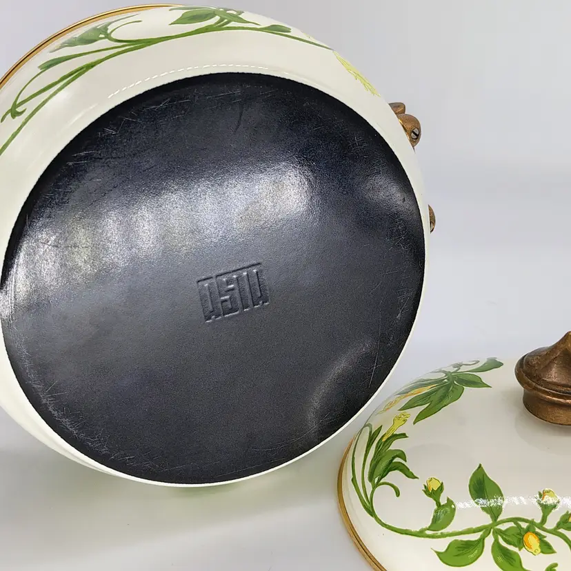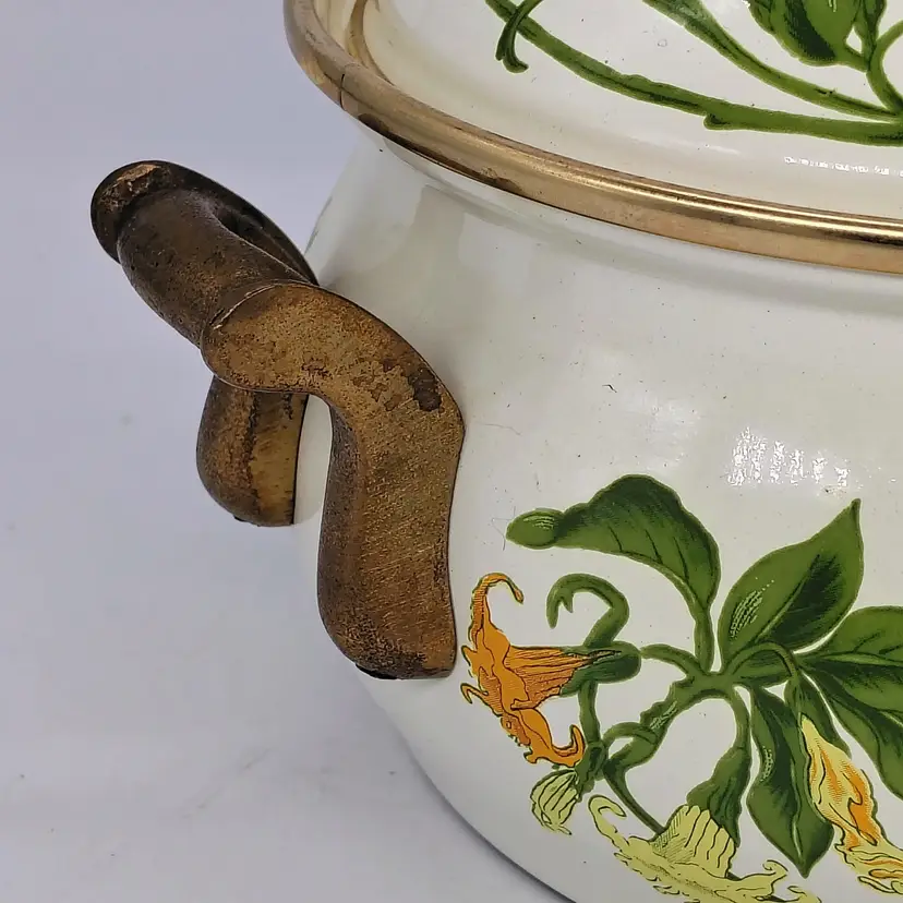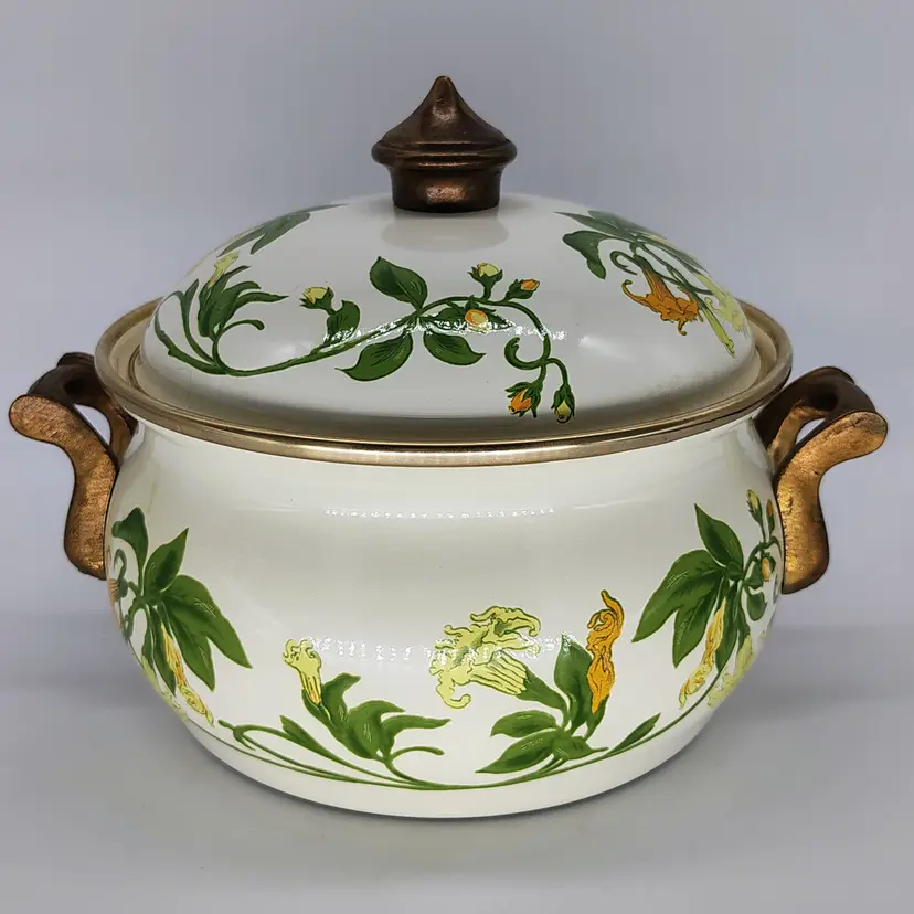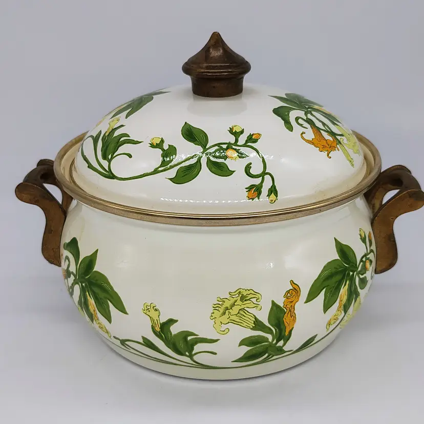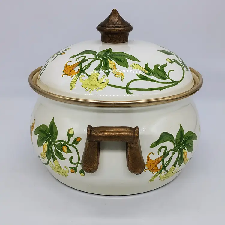 The Vintage Asta Villeroy & Boch Enamel Covered Casserole Dish with brass hardware is a charming addition to any kitchen. This multicolor dish features a durable enamel surface coating, making it perfect for slow cooking and serving dishes like stews, casseroles, and roasts. The set includes a pot and lid, providing a convenient and stylish option for cooking and serving meals in style.