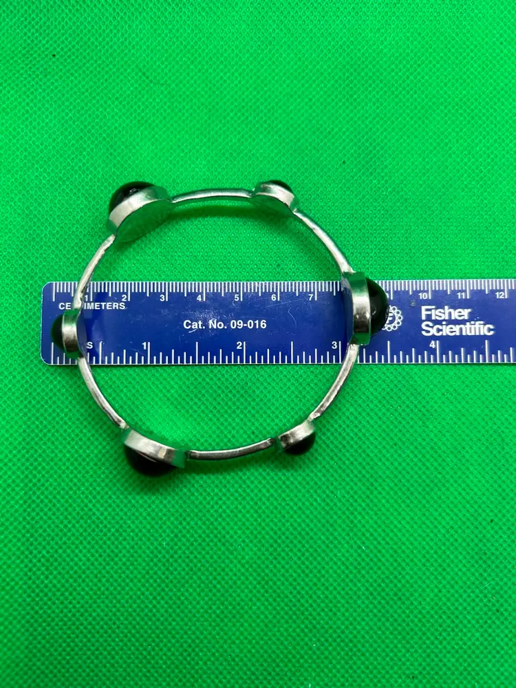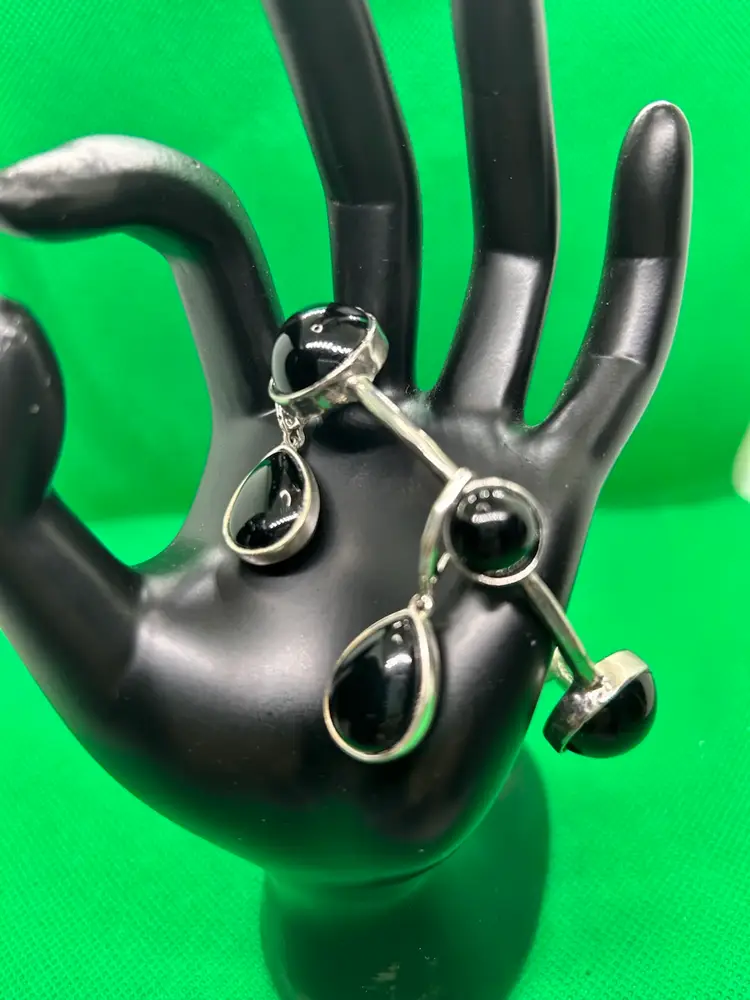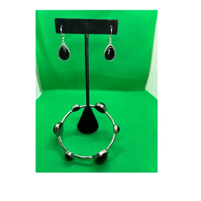 Groovy atomic style bangle bracelet with silver tone and black faux onyx stones. Earrings are teardrop shaped faux black onyx with silver tone backing and lever back piercing. There is a very small nick on the top of one of the stones. Please see photos as they are part of the description. Thank you for looking!