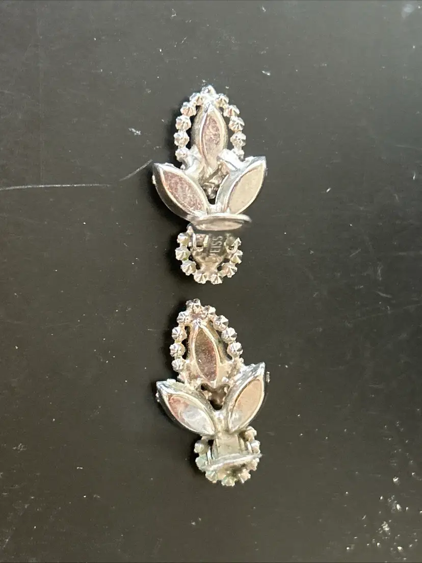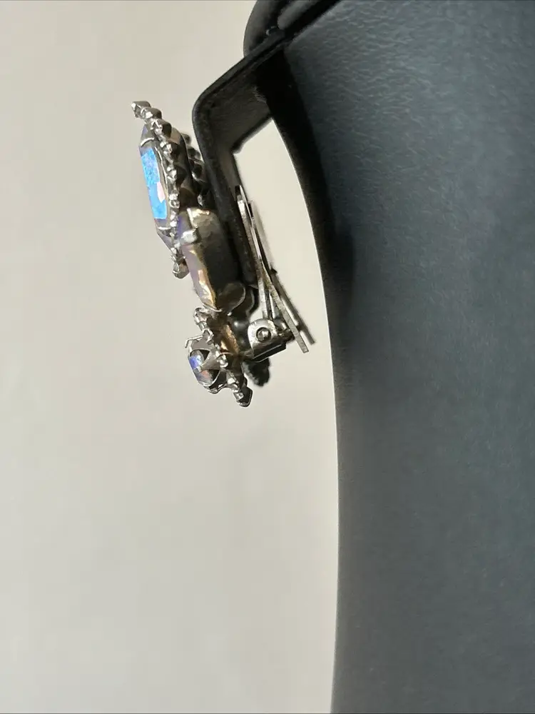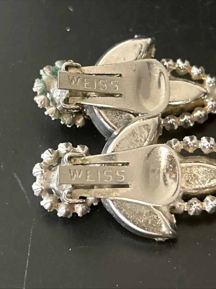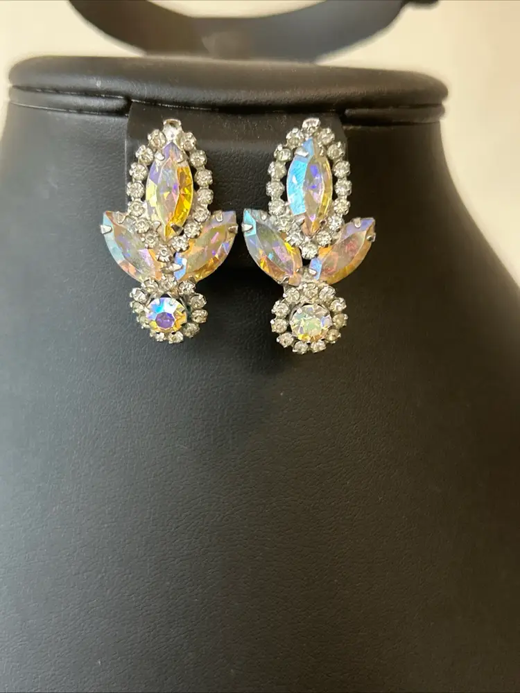 Vintage aurora borealis clip on earrings by Weiss. Excellent used condition. Please see photos. 1-1/3 inches long. Please let me know if you have any questions. Single item offer and bundle item offer for seriously considered. Thank you for stopping by.