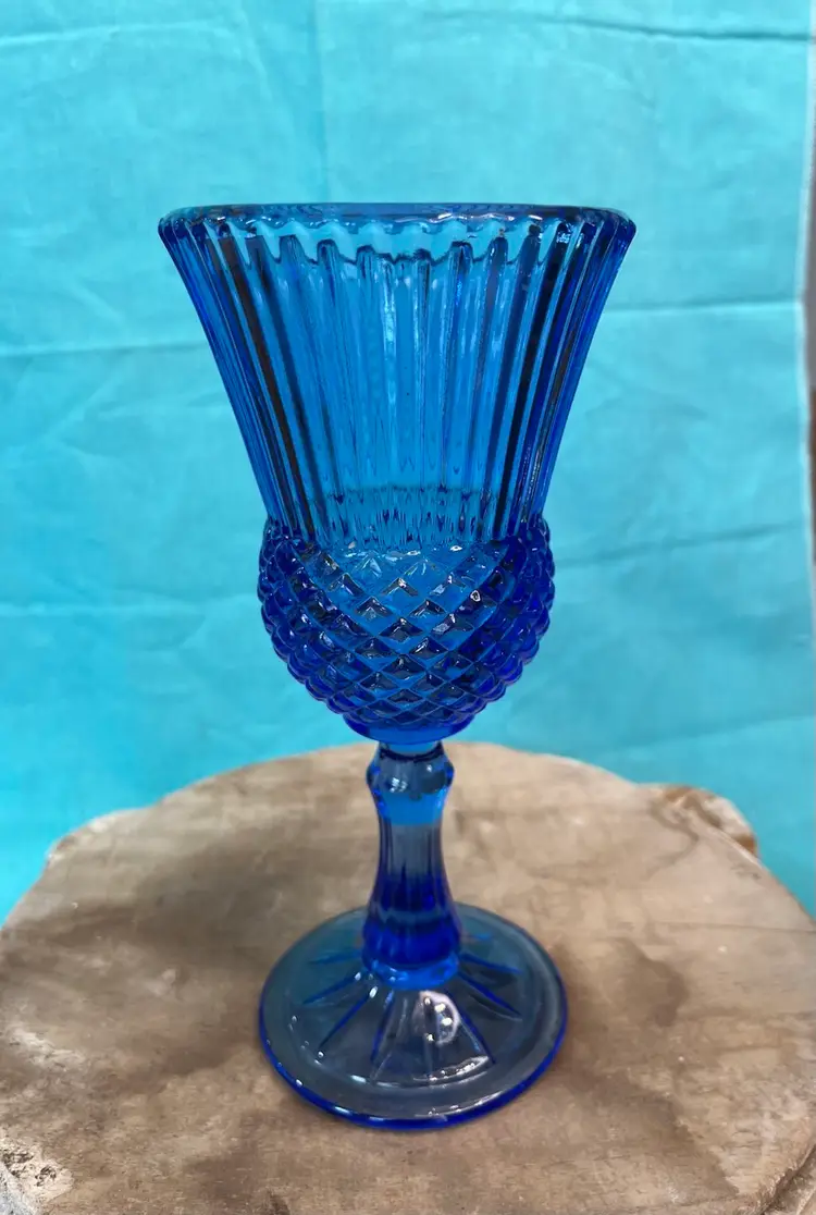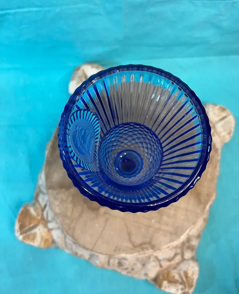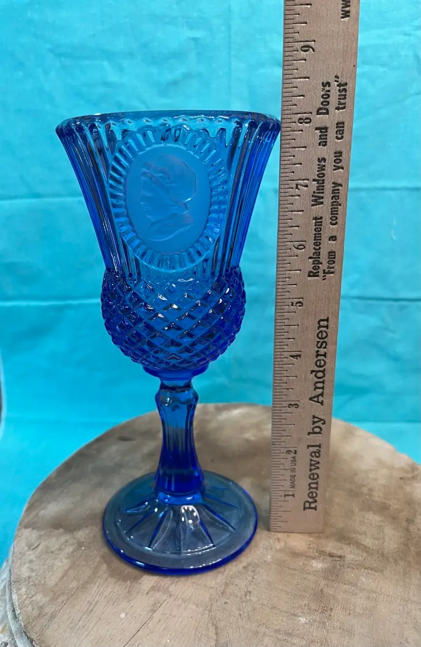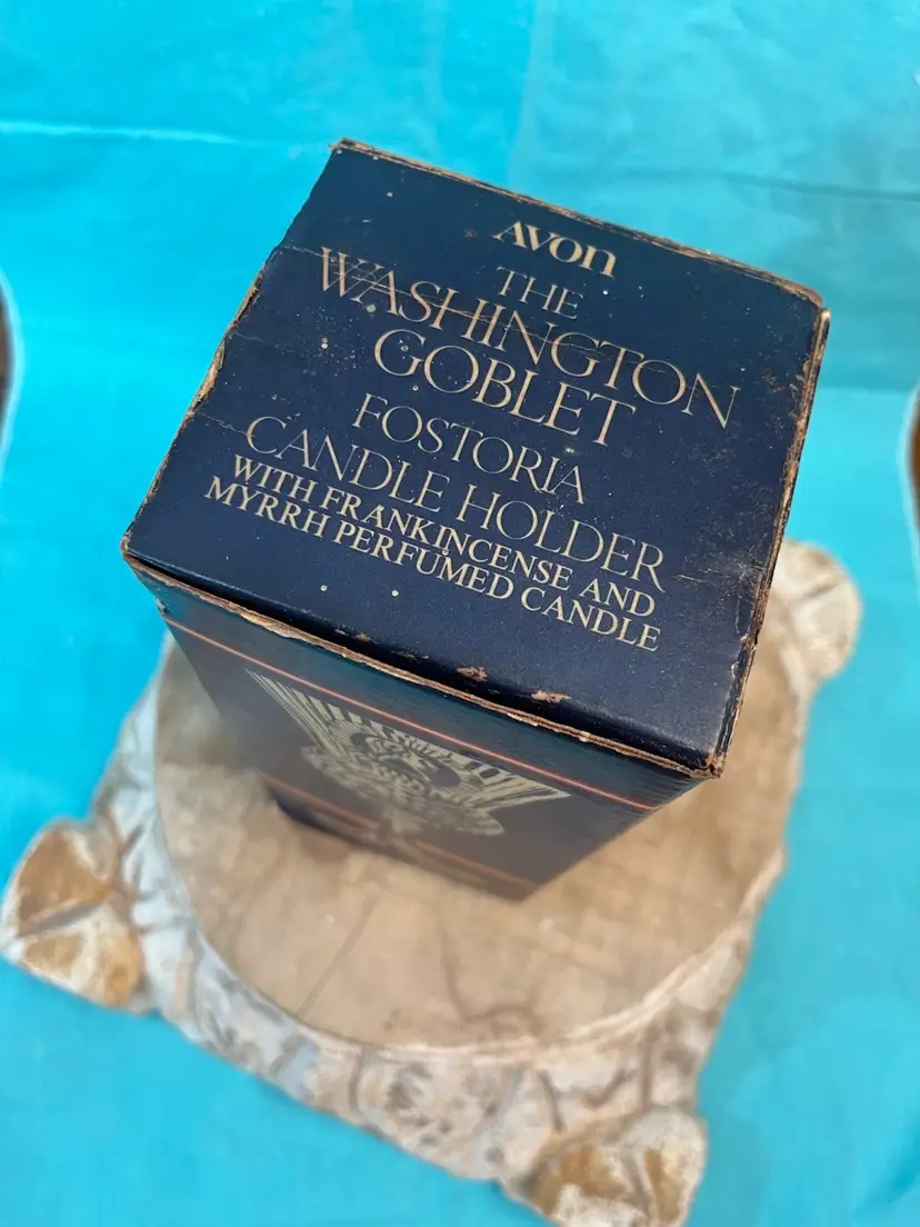 #815 VTG Avon 1976 Fostoria Glass Cobalt blue With Martha Washington goblet/candle Holder with box. (No candle) Measures 8” tall and 3.5” opening. No chips or cracks.