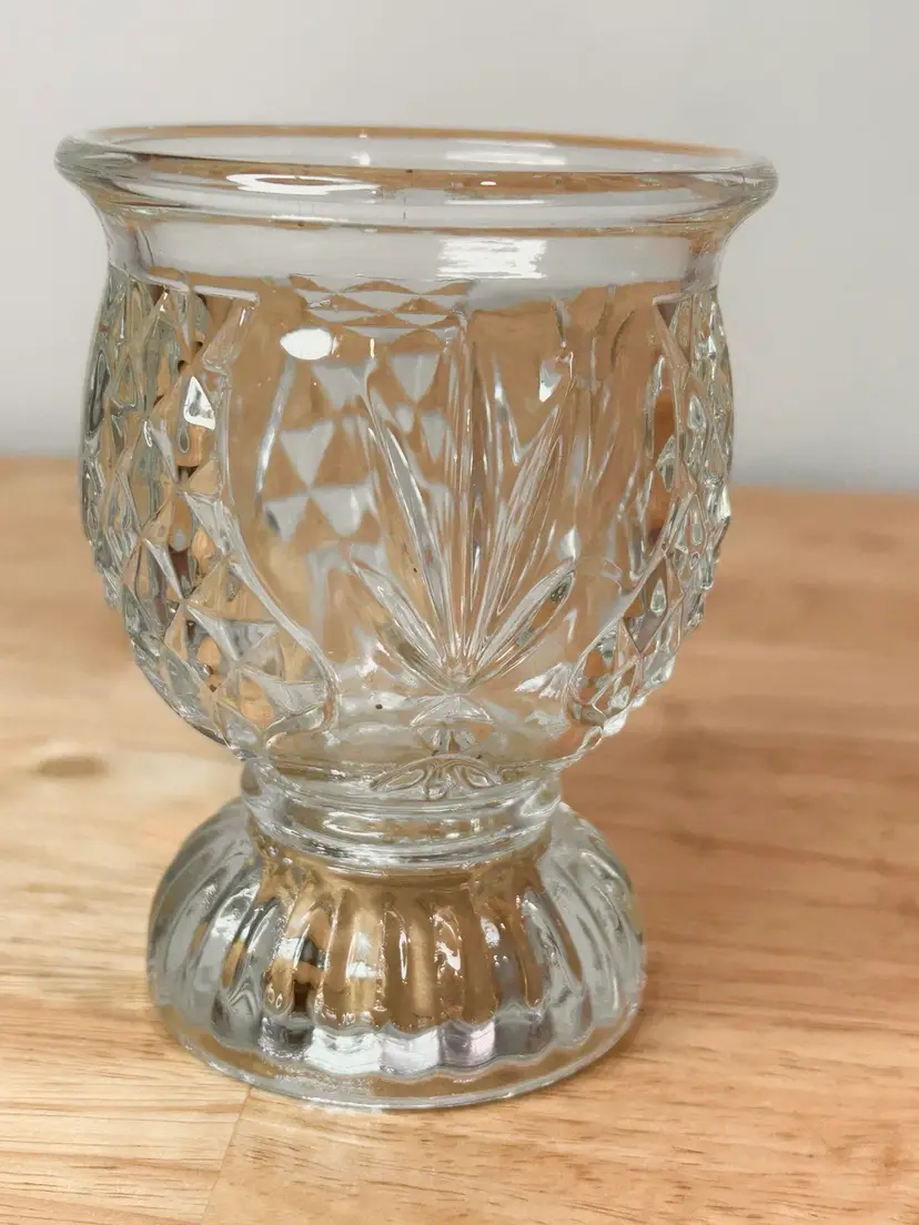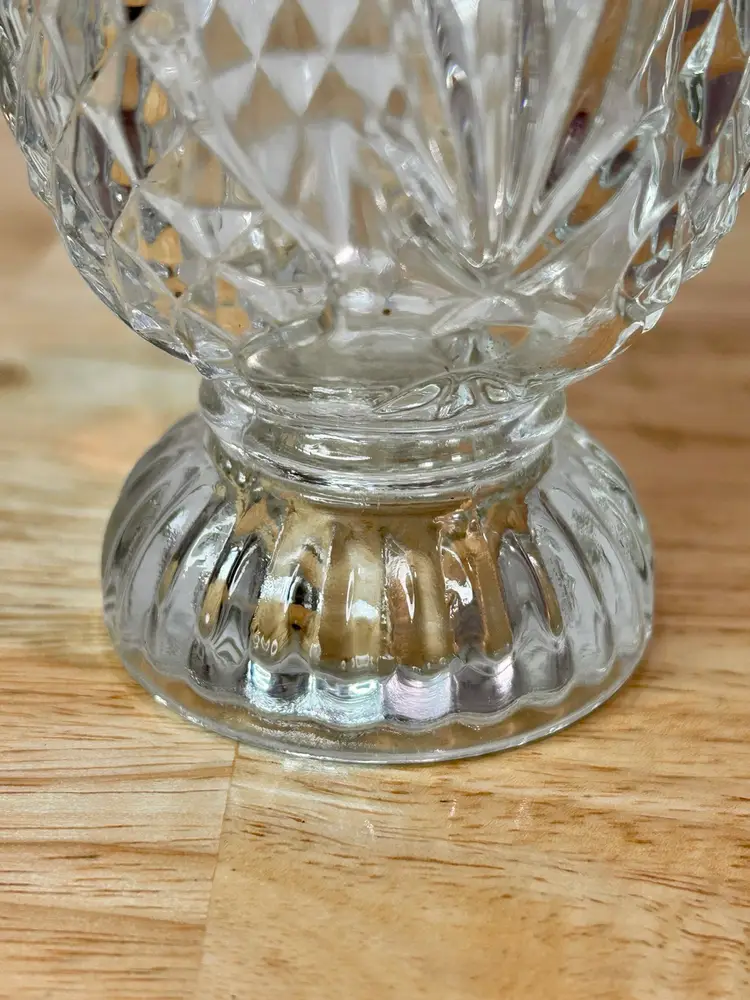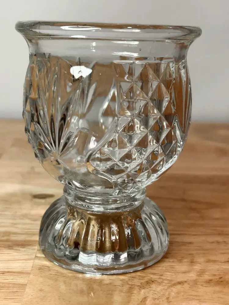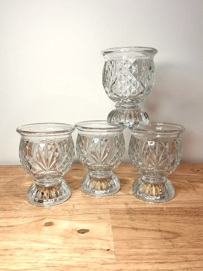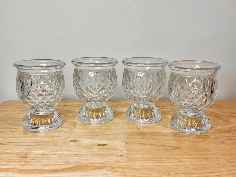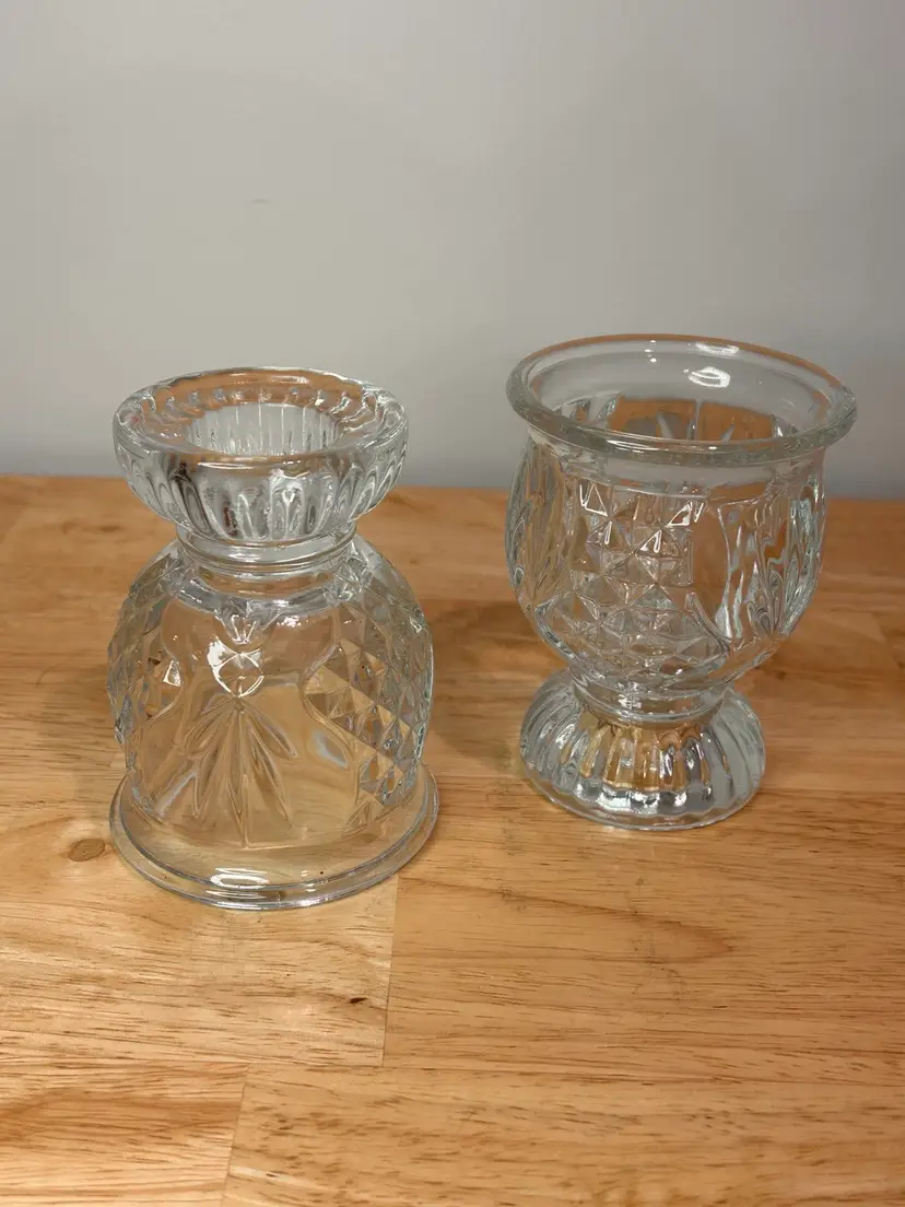 This product is a set of 4 Unique Glass Avon (1979) (Fostoria) Candleholders. Versatile and Reversible: Our candlestick holders are designed to be used with a variety of candle types, including tea lights, pillar candles, and tapered candles. They can be flipped upside down for different candle sizes, allowing for versatile usage. Flawless, Premium Thick Glass. Quilted, Fan Pattern with a thick flared rim. These 4 glass pieces sit evenly on the tabletop for a secure balance. Smoke pet free home. No wax residue. No chips, cracks or scratches. 3 7/8 inches tall - each holder weighs 14 ounces. ** travel over to my listings for crystal pieces, glassware, including vintage.