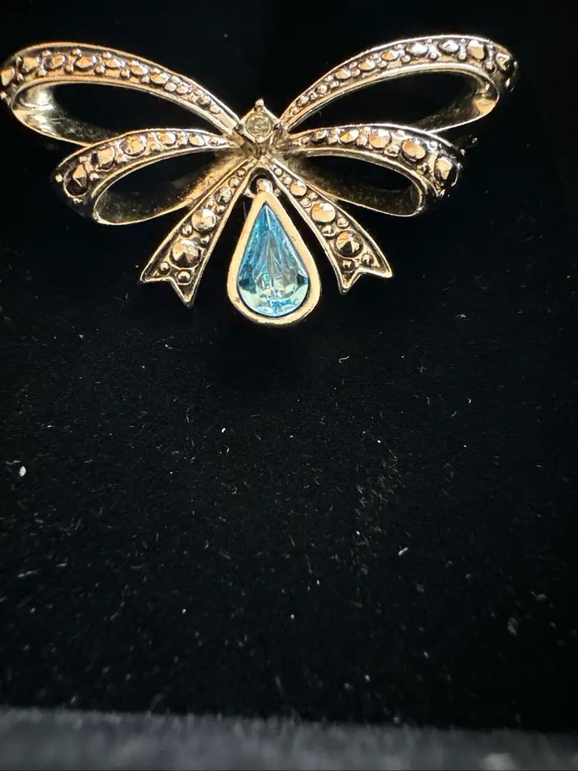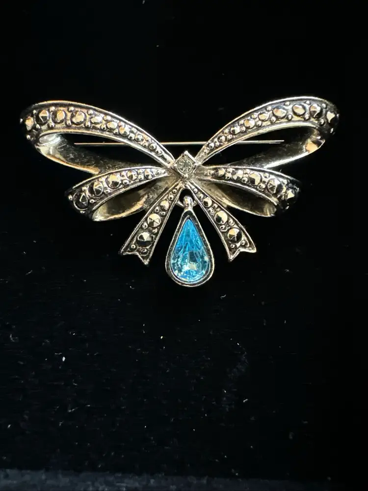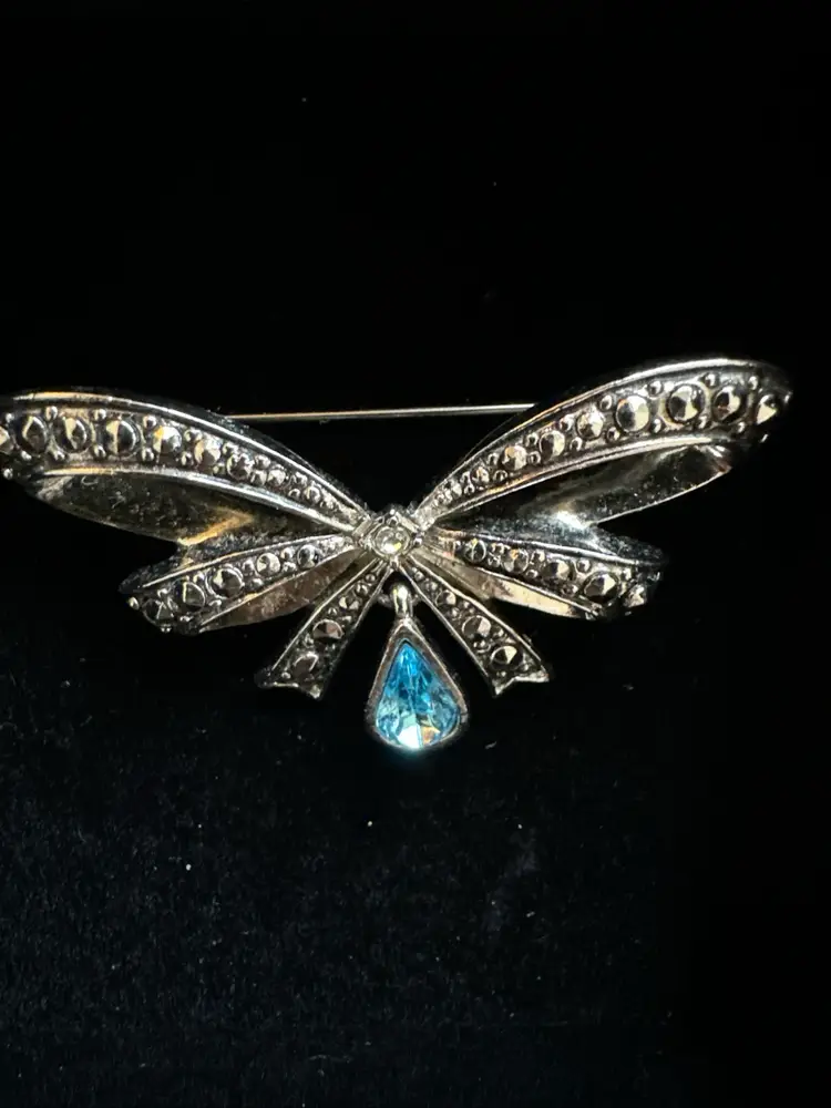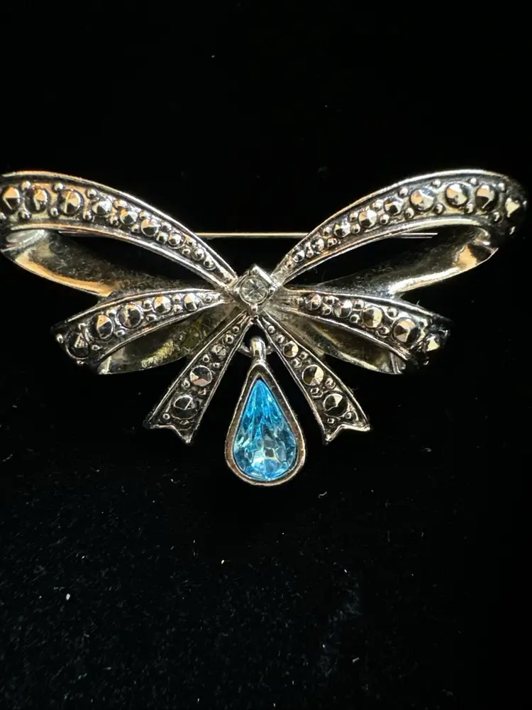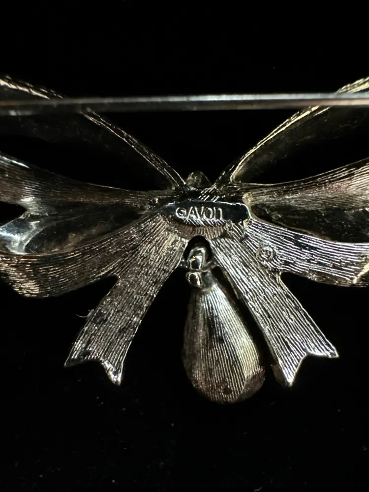 The VTG Avon Butterfly Bow Ribbon Brooch Pin features a beautiful silver tone design with a blue teardrop main stone and marcasite secondary stones, making it a perfect accessory for various occasions such as weddings, anniversaries, and birthdays. Signed by Avon, this vintage piece of fashion jewelry exudes beauty and elegance, with an artistic touch that adds a touch of retro charm. The brooch pin is a statement piece for women who appreciate unique and timeless accessories that are sure to stand out.