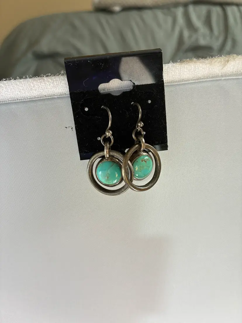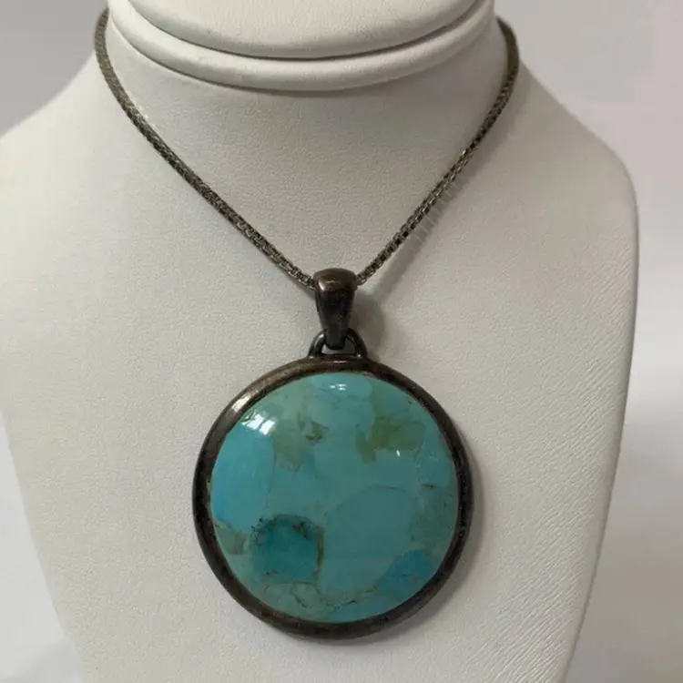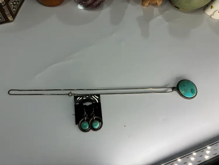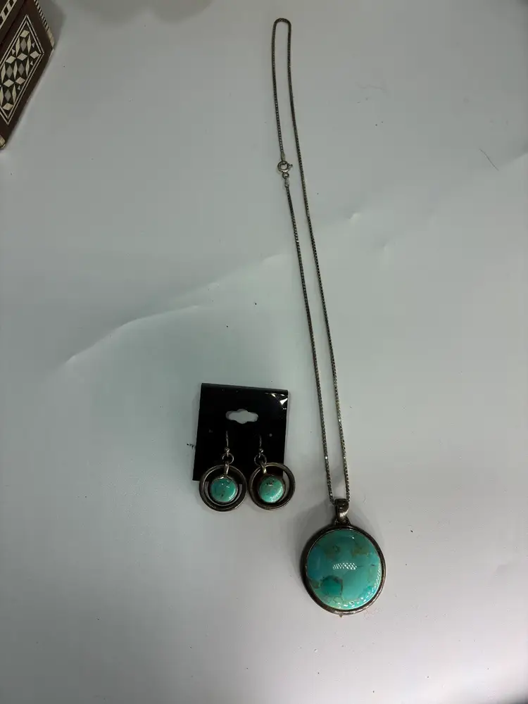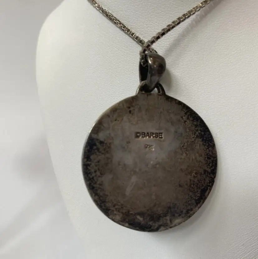 Crafted with care, this exquisite jewelry set by Barse features a stunning necklace and matching earrings, each piece delicately designed to showcase a large, round, light blue natural turquoise stone. Surrounded by sterling silver, the turquoise's rich hue is complemented by the metal's equal petina, creating an elegant and timeless look. The set exhibits a 925 metal purity, ensuring a high-quality addition to your jewelry collection. Every detail, from the handmade construction to the signature Barse authenticity, speaks to the craftsmanship and attention to detail that has gone into creating this original vintage ensemble.
