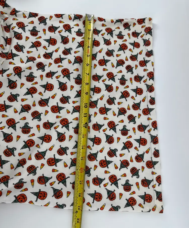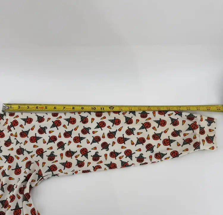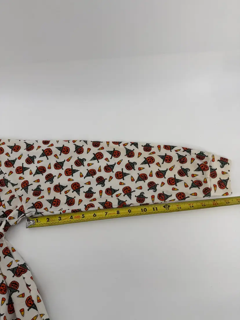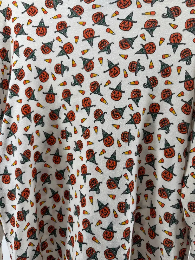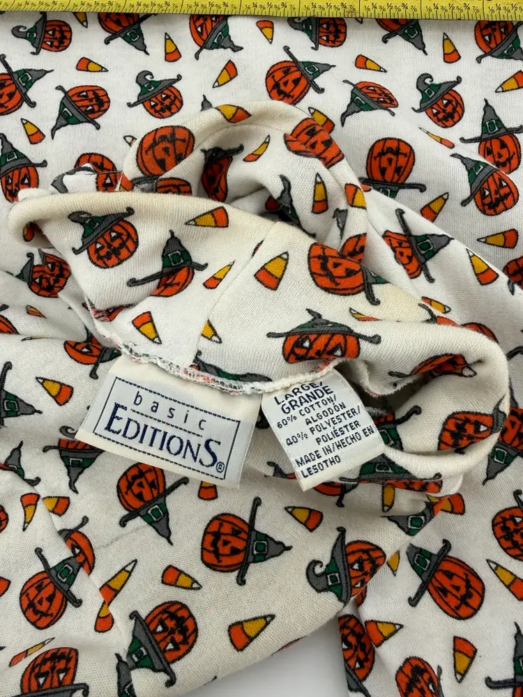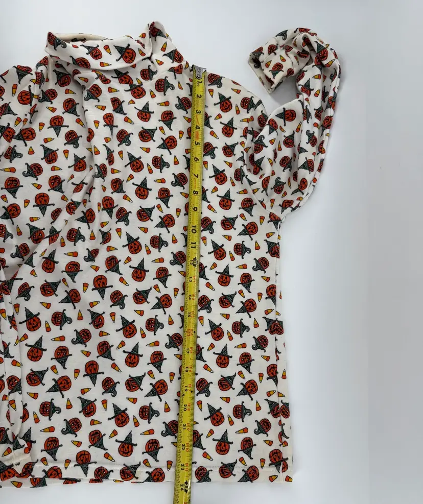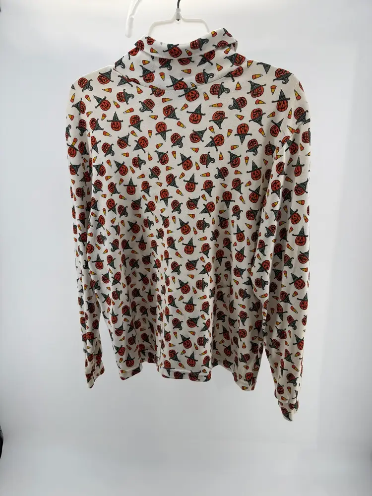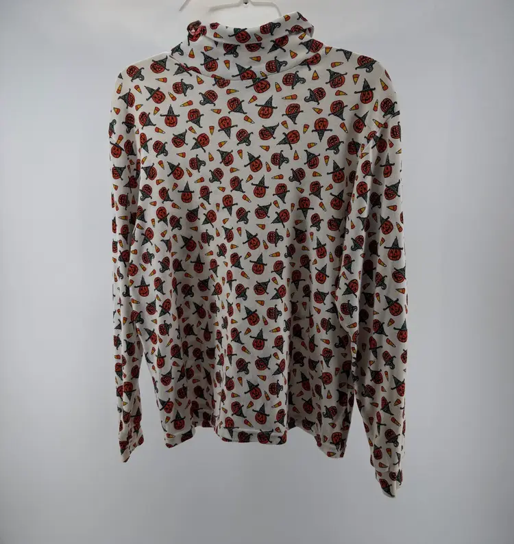 The VTG Basic Editions Women’s Halloween Turtleneck in size Large features a festive pattern of pumpkins, jack-o-lanterns, and candy corn perfect for the fall season. Made from a comfortable blend of polyester and cotton, this vintage-inspired top has a classic fit with 23" long sleeves and a turtleneck neckline for added warmth. The pullover closure and regular fit make it easy to care for and ideal for casual occasions, adding a touch of Halloween spirit to any outfit.