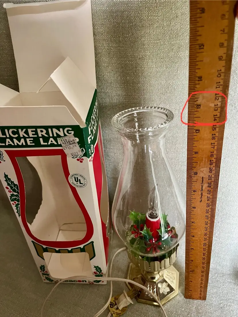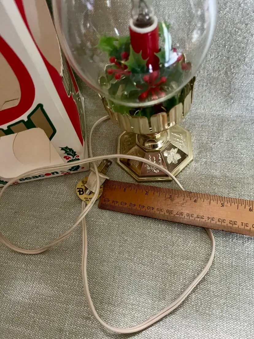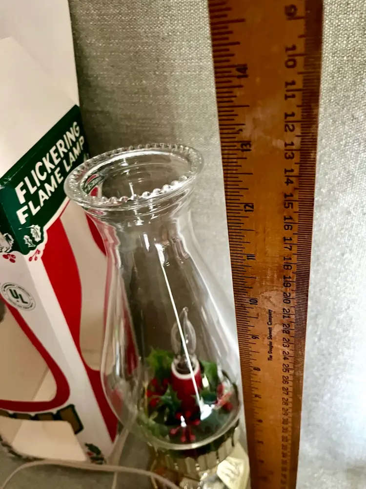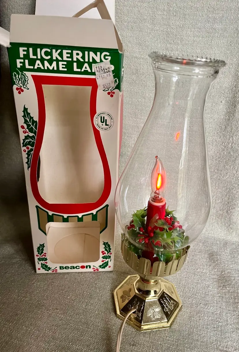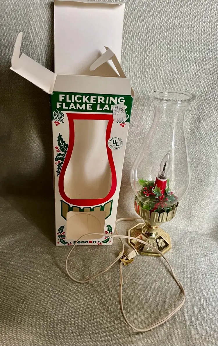 The Vtg Beacon Flickering Flame Christmas Lamp is a vintage 13" tall electric plug-in indoor use light-weight plastic (and pine greenery and holly berries) base with GLASS lantern designed for Christmas celebrations. With a flame light color and a festive gold, green, and red color scheme, this lamp from 1989 features a glass and plastic construction. Easy to add a festive touch and featuring one light, this hurricane lamp by Beacon is a unique and charming addition to your holiday decor collection. Ideal for indoor use with a corded electric power source, this lantern captures the nostalgia of the traditional classic Winter Season. Weighs 12 ounces within the box. (Properly packed for shipping).