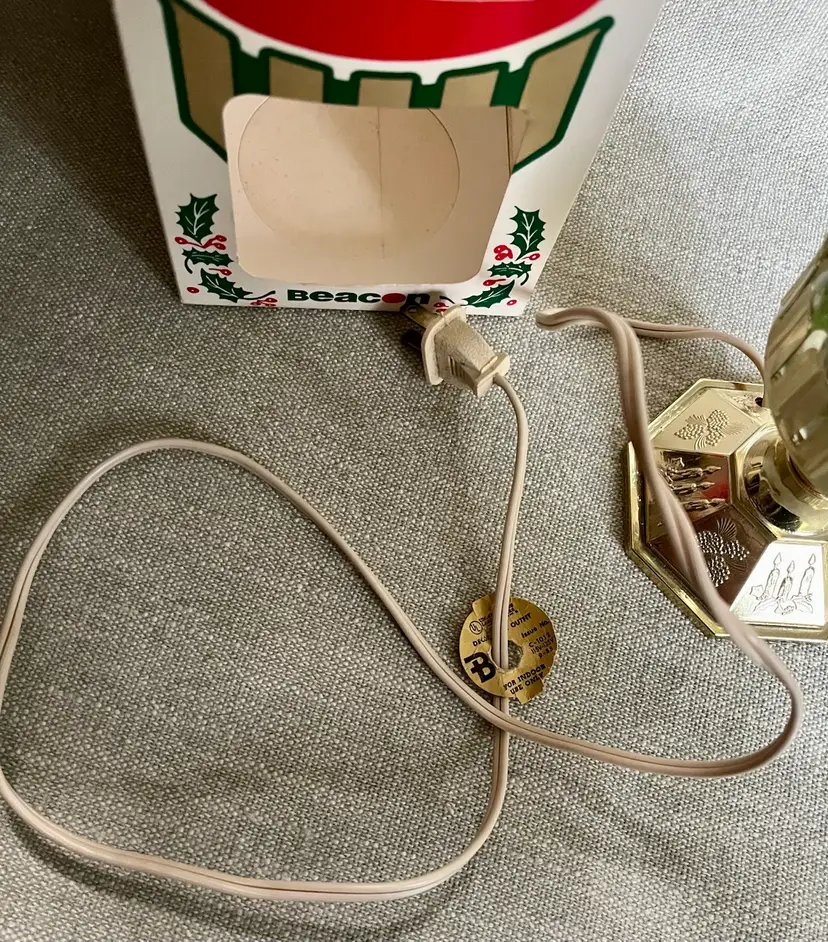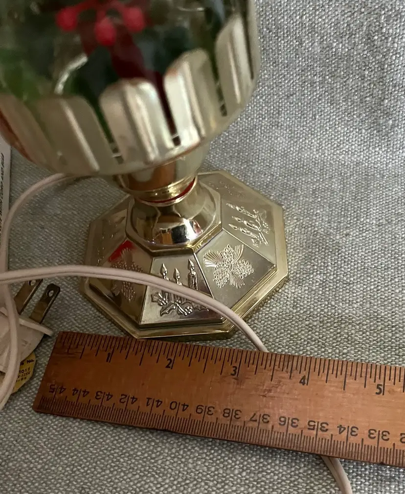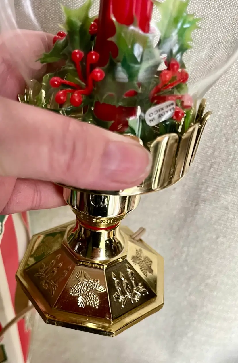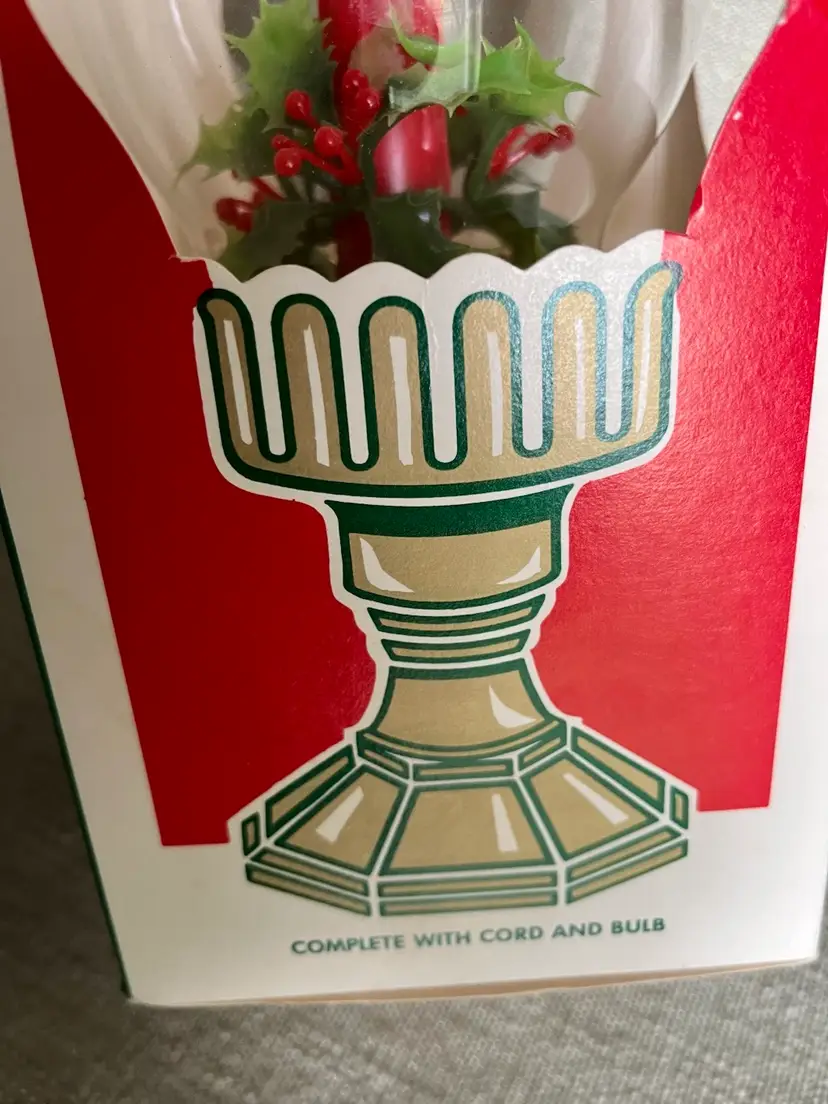 The Vtg Beacon Flickering Flame Christmas Lamp is a vintage 13" tall electric plug-in indoor use light-weight plastic (and pine greenery and holly berries) base with GLASS lantern designed for Christmas celebrations. With a flame light color and a festive gold, green, and red color scheme, this lamp from 1989 features a glass and plastic construction. Easy to add a festive touch and featuring one light, this hurricane lamp by Beacon is a unique and charming addition to your holiday decor collection. Ideal for indoor use with a corded electric power source, this lantern captures the nostalgia of the traditional classic Winter Season. Weighs 12 ounces within the box. (Properly packed for shipping).