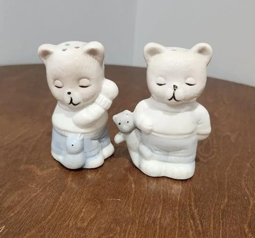 Cute Bears Salt & Pepper Shakers of Porcelain/Ceramic each carrying a toy, light blue and white