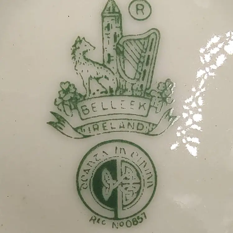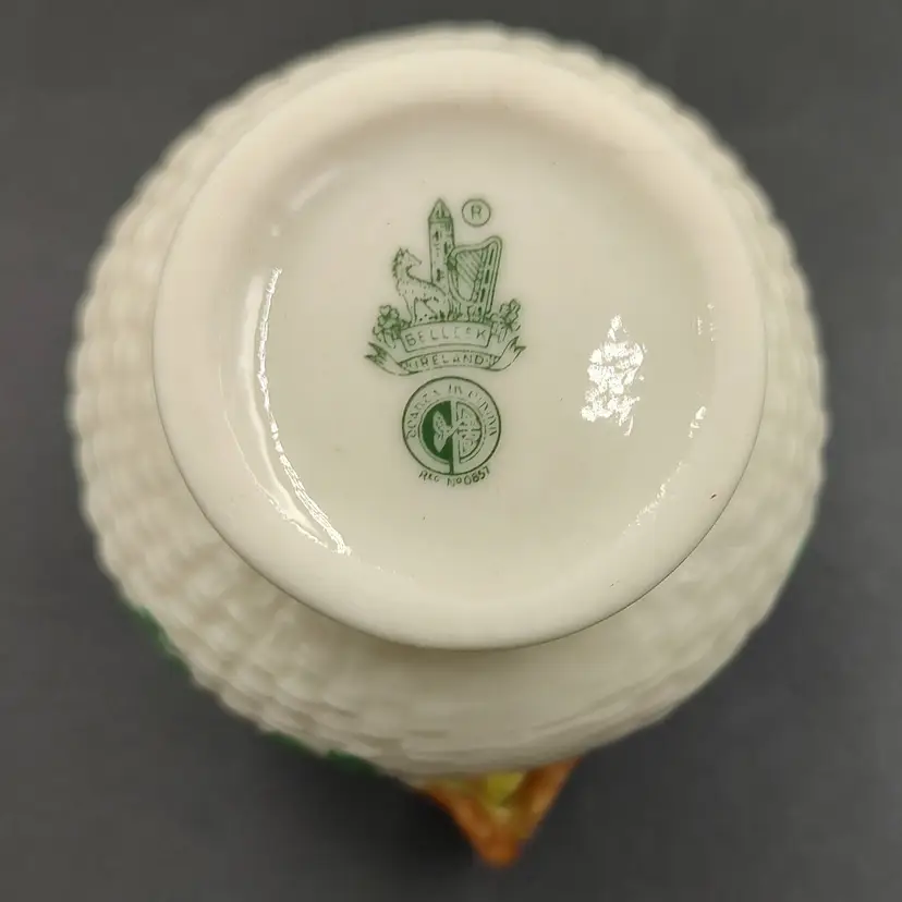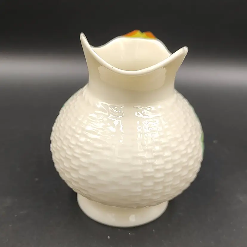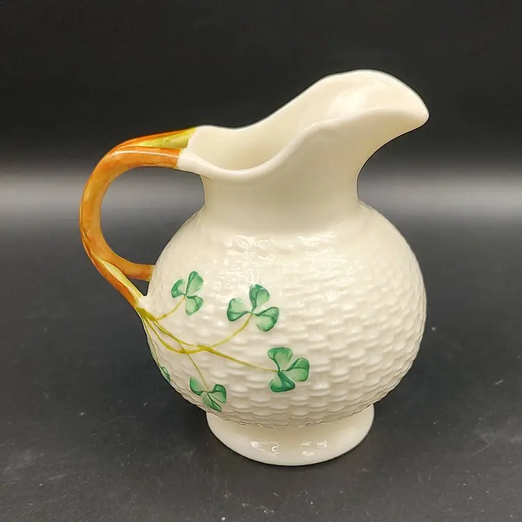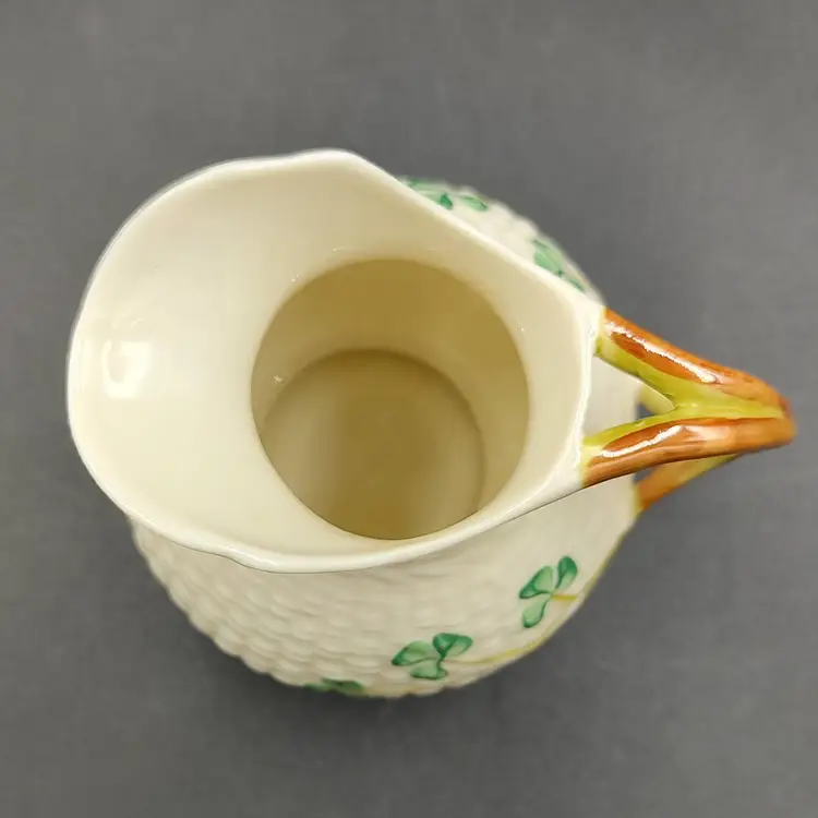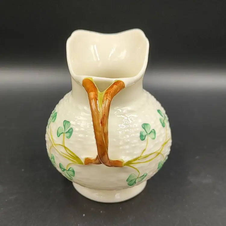 Vintage 1965-1980 Belleek Ireland Shamrock Creamer Basket Weave Design height 3.5" x width 3.5" x length 4". Holds 6 ounces. Made in Ireland