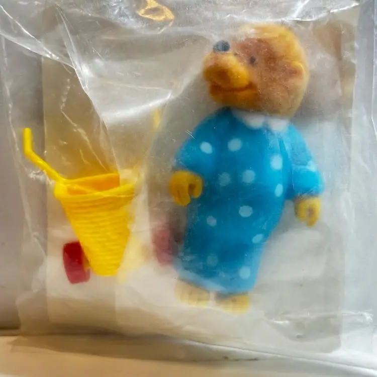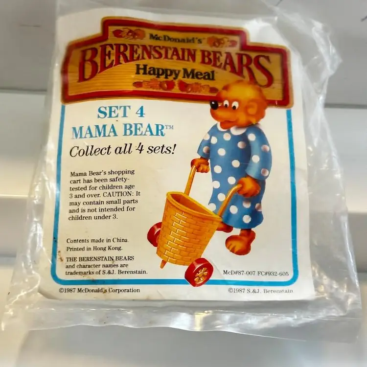 This vintage set # 4 of Berenstain Bears McDonald's Happy Meal Toy from 1987 is perfect for collectors or fans of the beloved children's book series. The number 4 set featuring Mama Bear, is still sealed in their original packaging. This toys was part of a promotion with McDonald's restaurants and are recommended for ages 3 and over. Don't miss your chance to add these unique pieces to your collection!
