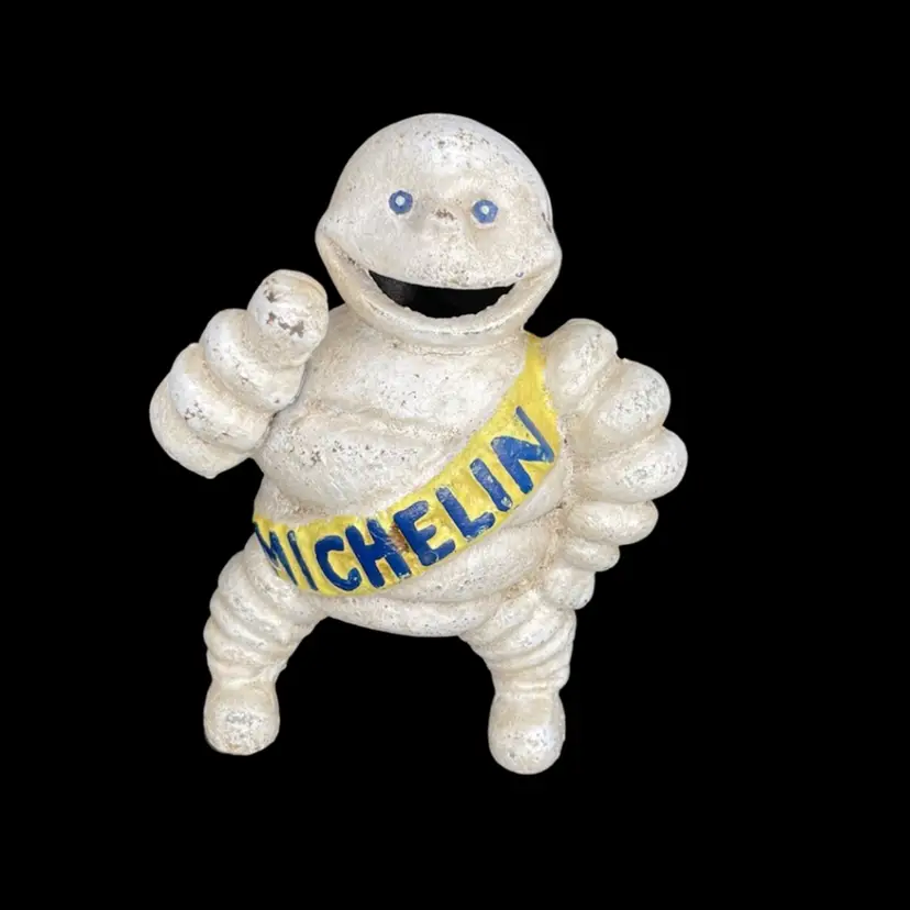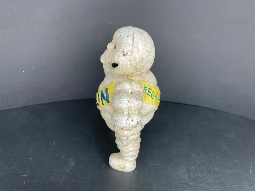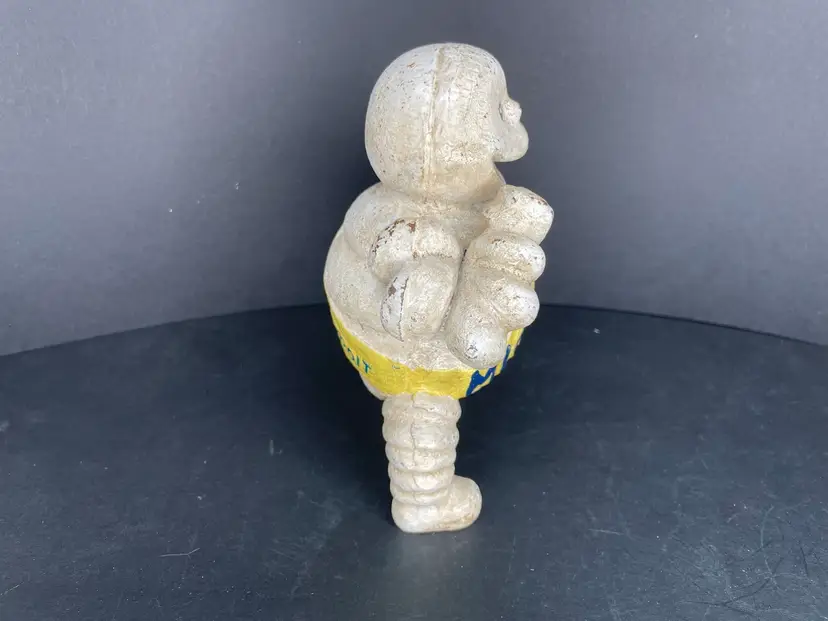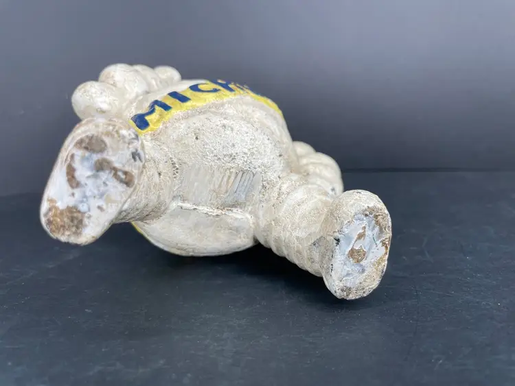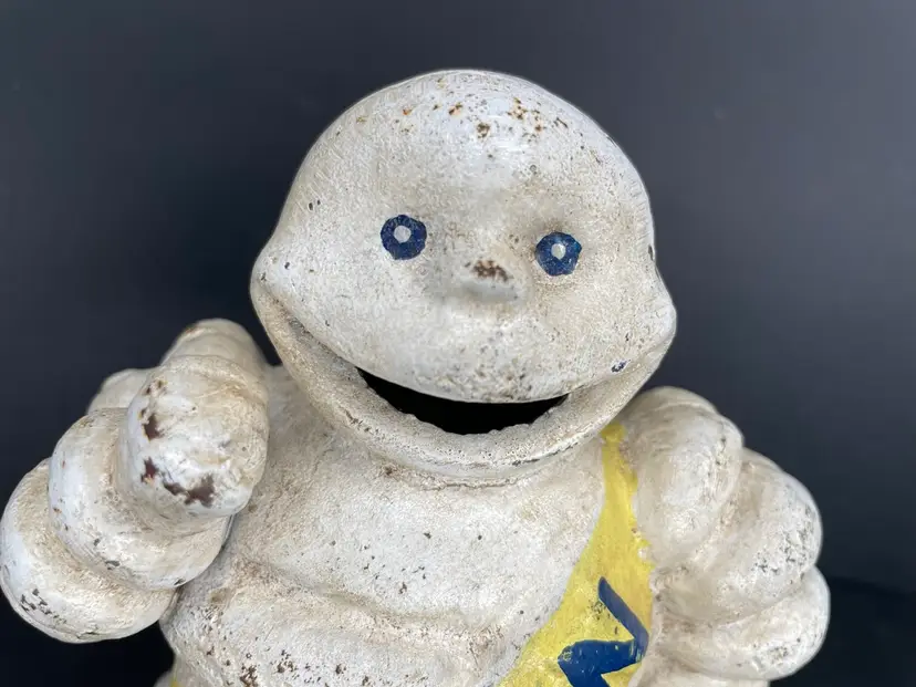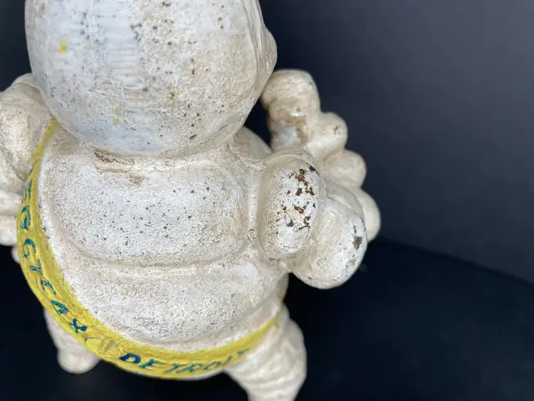 This vintage Bib Michelin Man Cast Iron Bank is a rare find for collectors of original advertising. Made in the 1930s in Detroit, Michigan, this coin bank features the iconic Michelin Man and is a perfect addition to any collection of tires or advertising memorabilia. The bank is made of durable cast iron and has a white color finish. It is an original piece and not a reproduction, adding to its value and collectibility. The bank measures 7 inches in height and is a great conversation piece for any room.