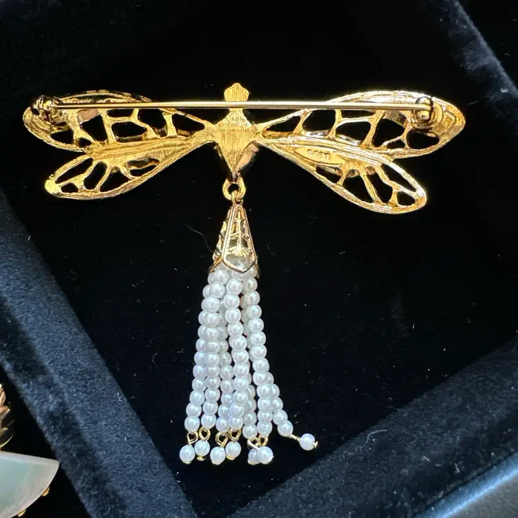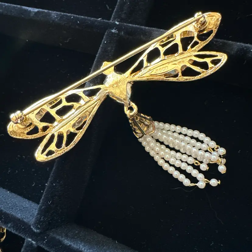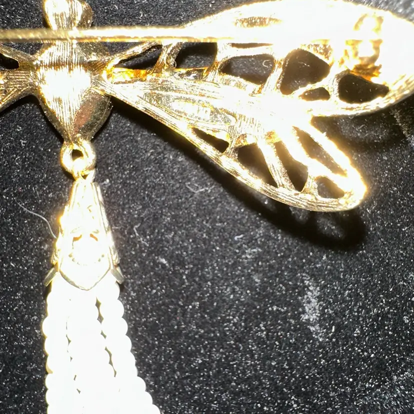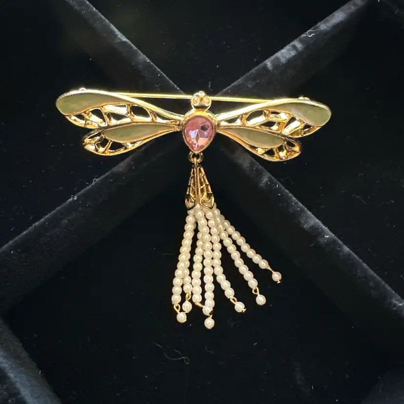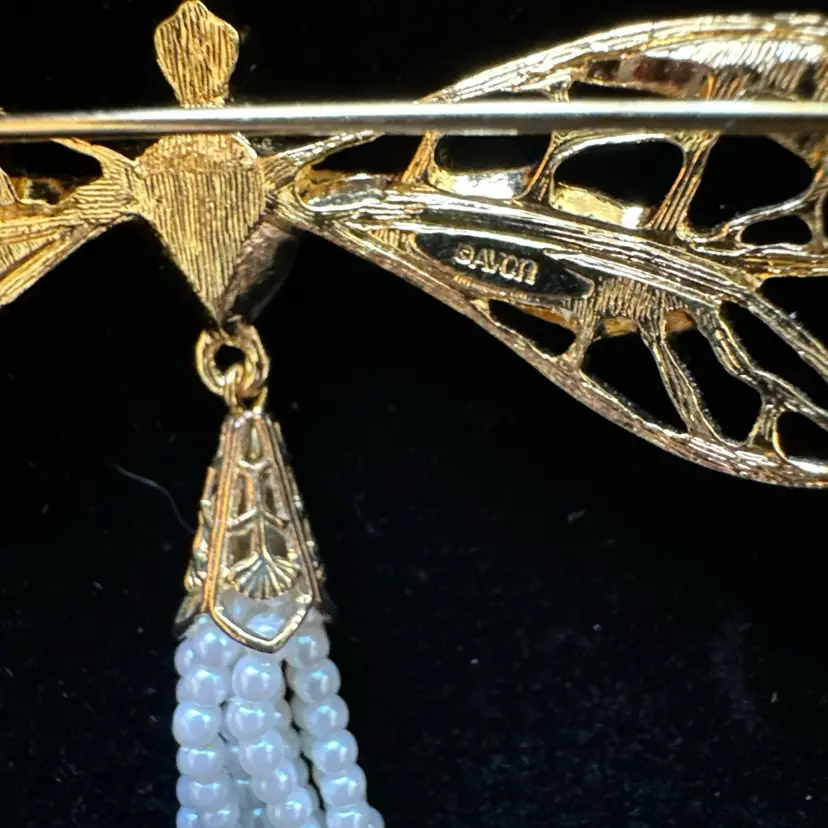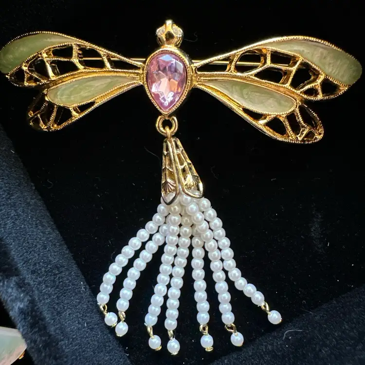 The product is a vintage Avon brooch featuring a big dragonfly design with pink rhinestone enamel accents and a pearl tassel. This fashion accessory is yellow gold plated with lab-created glass main stones in teardrop shape. Signed by Avon, this costume jewelry piece is from the mid to late 20th century, making it a unique and eye-catching addition to any jewelry collection.