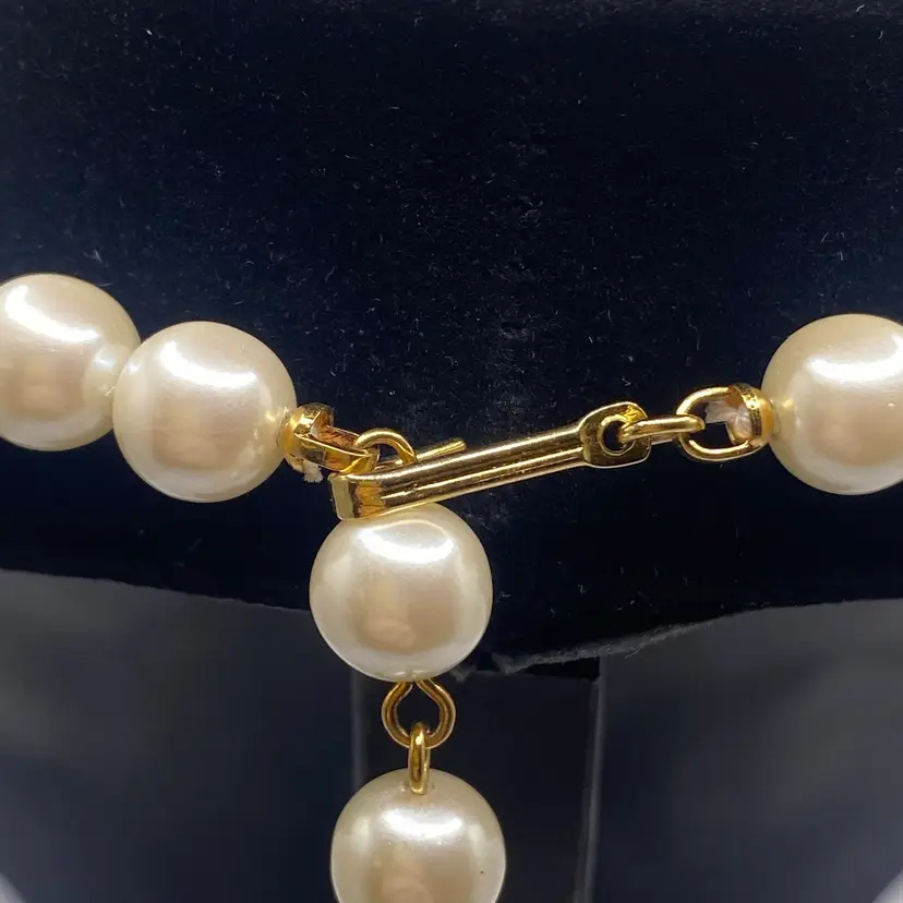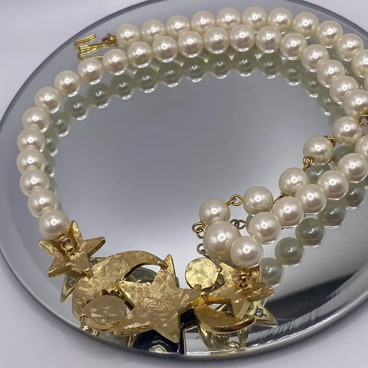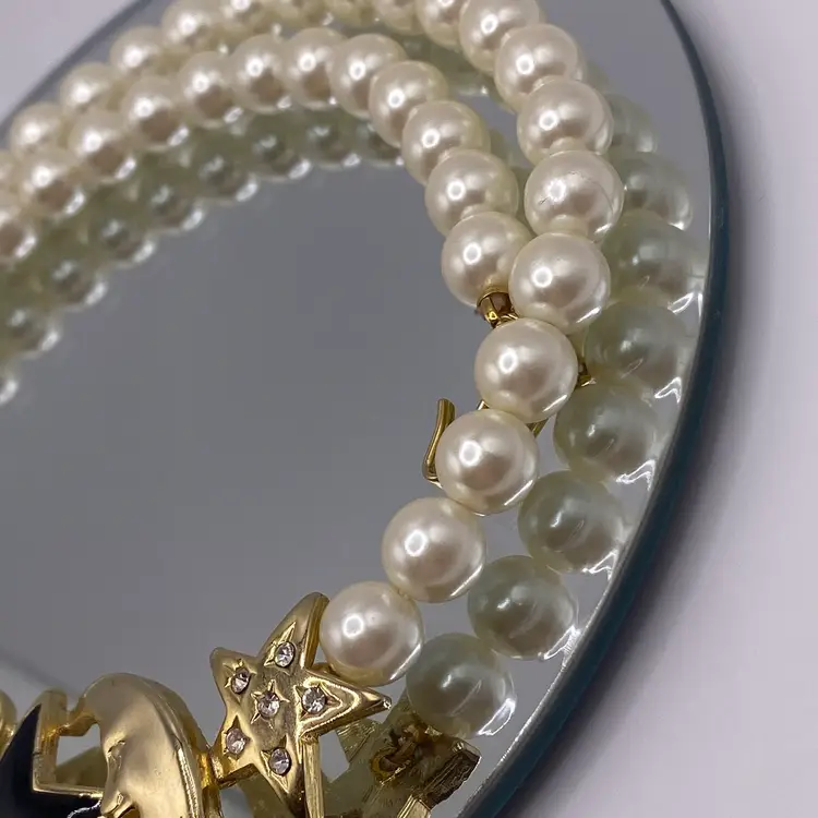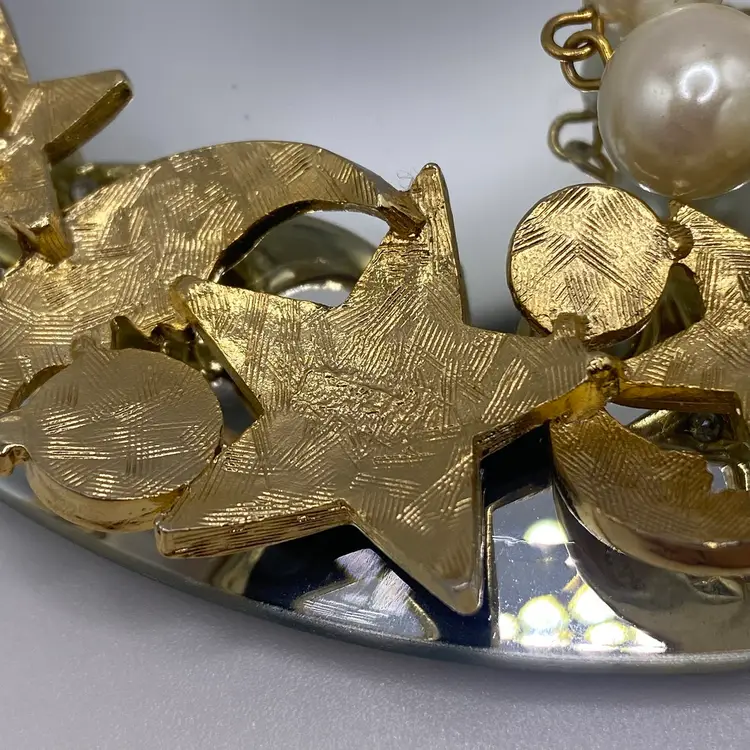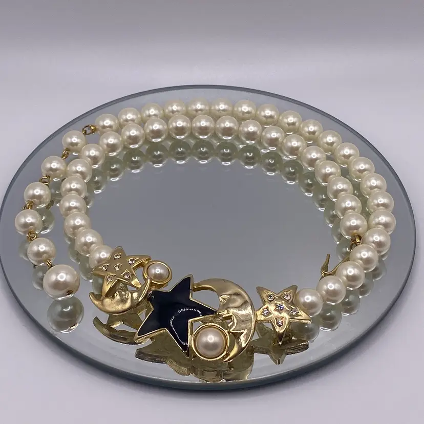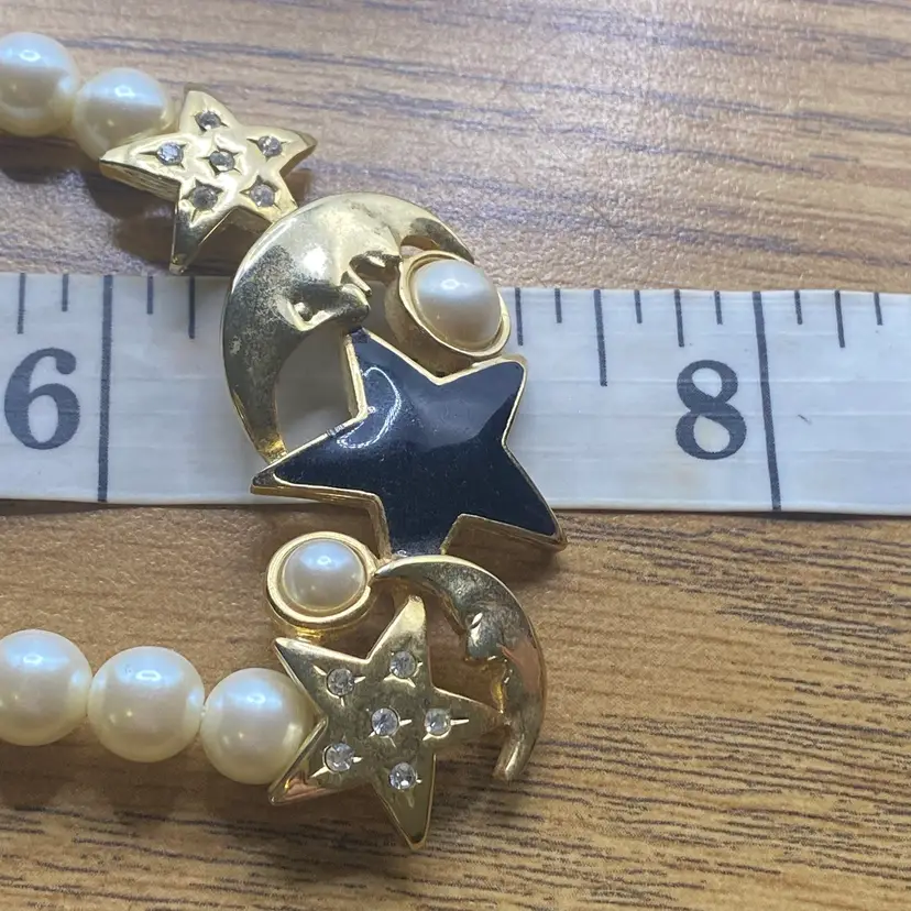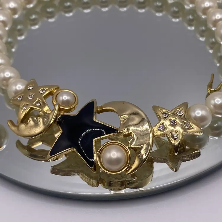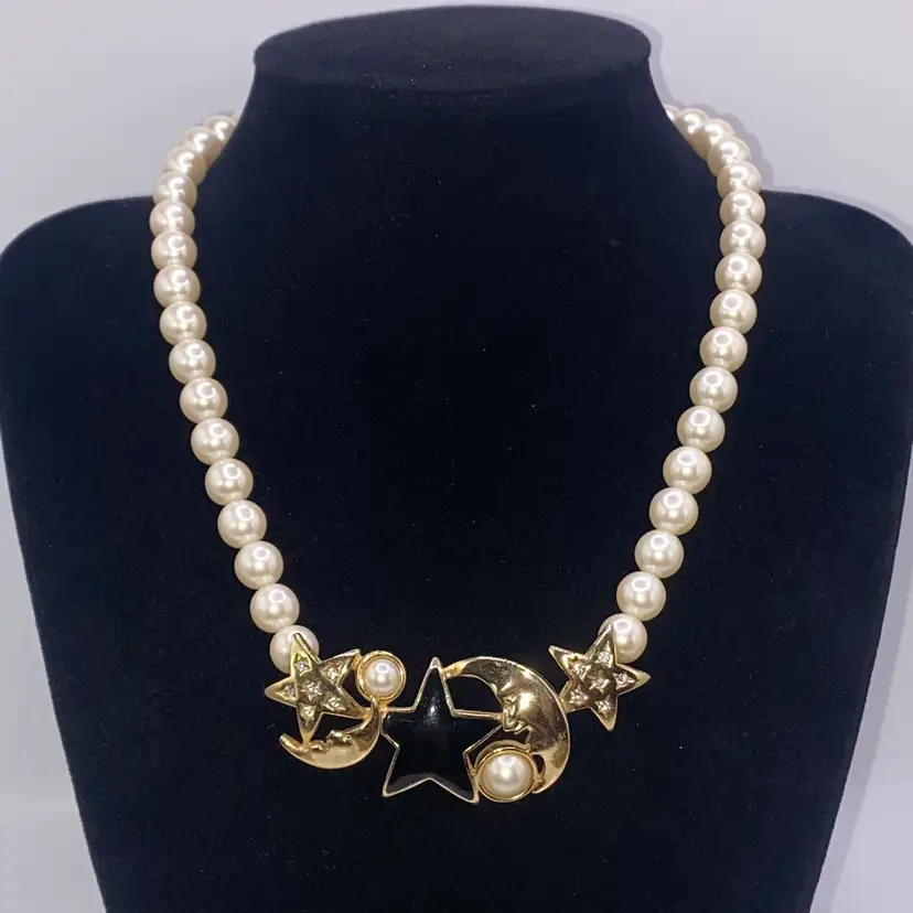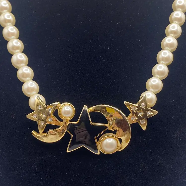 Add a touch of celestial beauty to your outfit with this vintage black enamel and gold tone rhinestone necklace. The pendant features a stunning moon and star design, adorned with faux pearls that add a touch of elegance to the piece. The necklace is approximately 14 inches in length and is perfect for everyday or casual occasions.