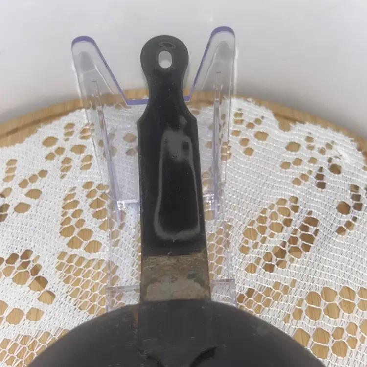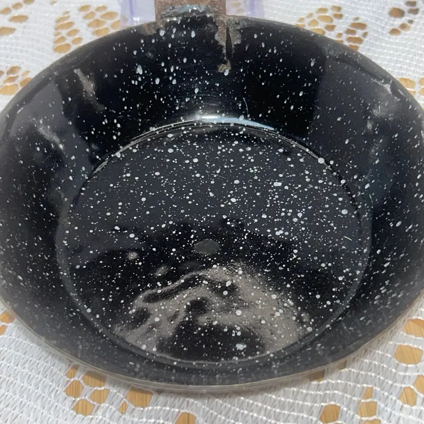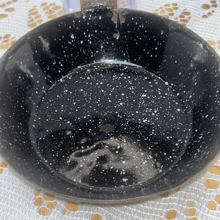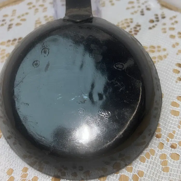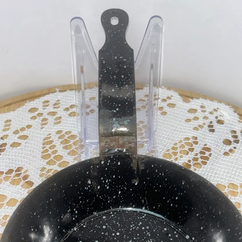 The skillet is 9.5” from front edge to end of handle. Pan portion is 5.25” in diameter. There are no markings. Speckling only on top/front. Handle has been bent where it attaches to pan. Was used as decor in kitchen. Otherwise in excellent condition.