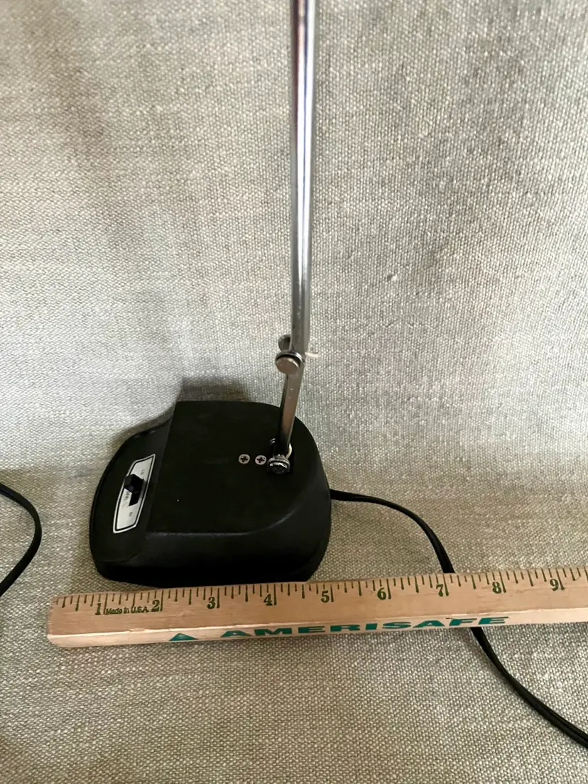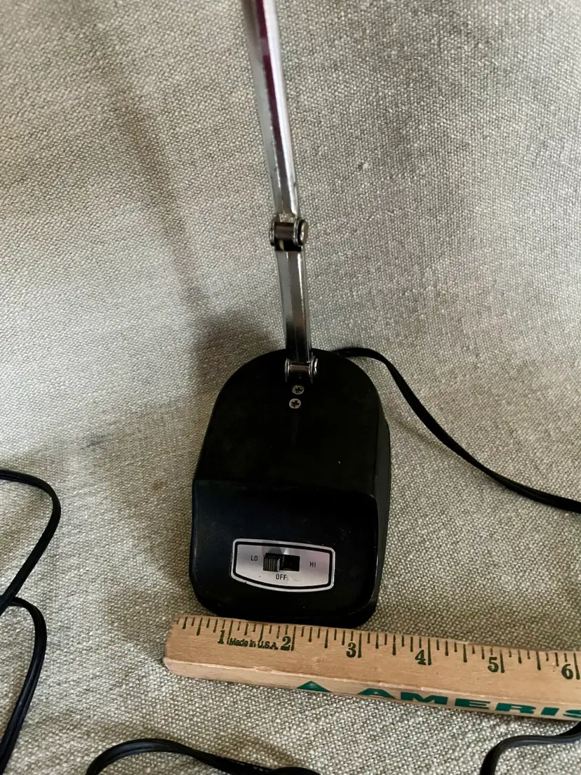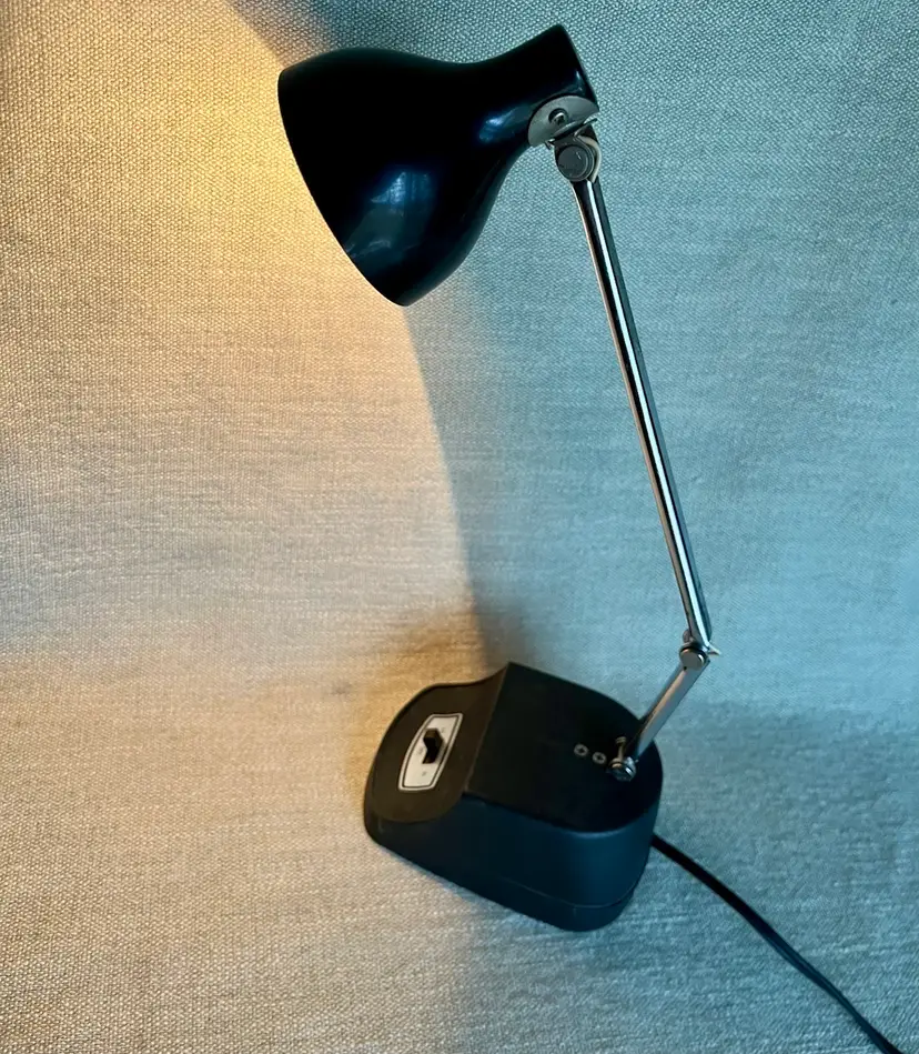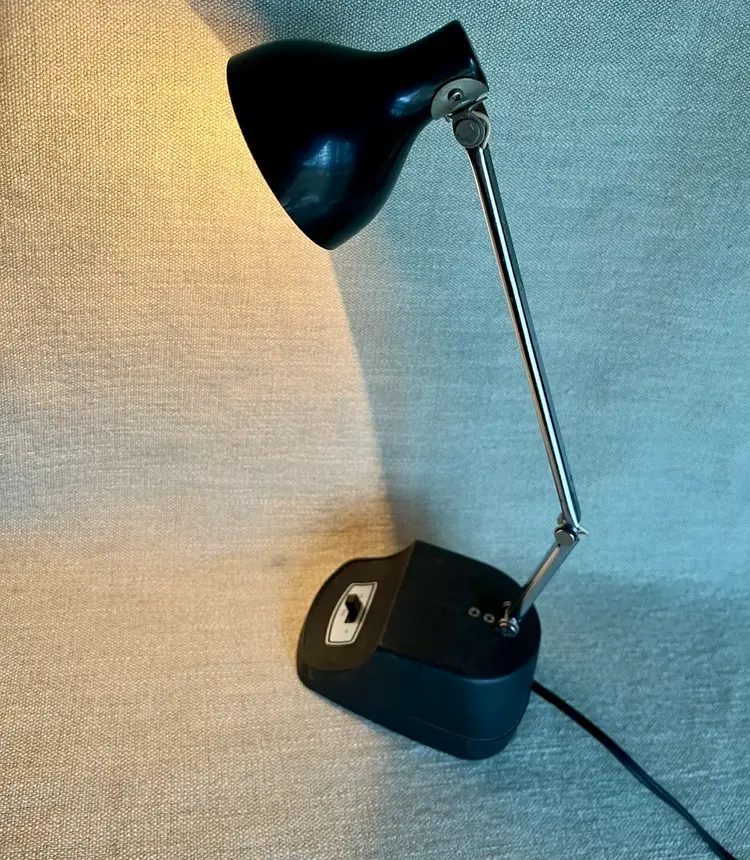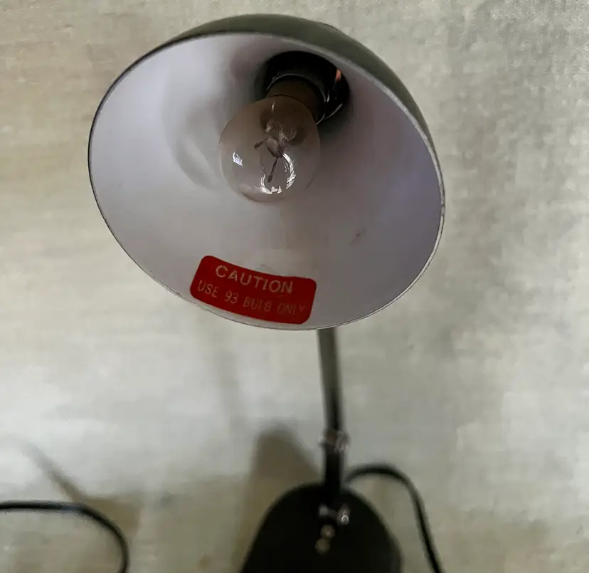 This vintage desk lamp features a flexible arm and is made of black metal with silver-tone arm. The lamp is corded electric with approximately a 70 inch cord in a solid color. It is a medium-sized lamp with a matte finish and can be moved around for portable use. The lamp is designed in a mid-century modern style and has a light sensor. It comes with a bulb of #93 12v. Buyer will NEED to provide the light bulb. The lamp was manufactured in Taiwan.