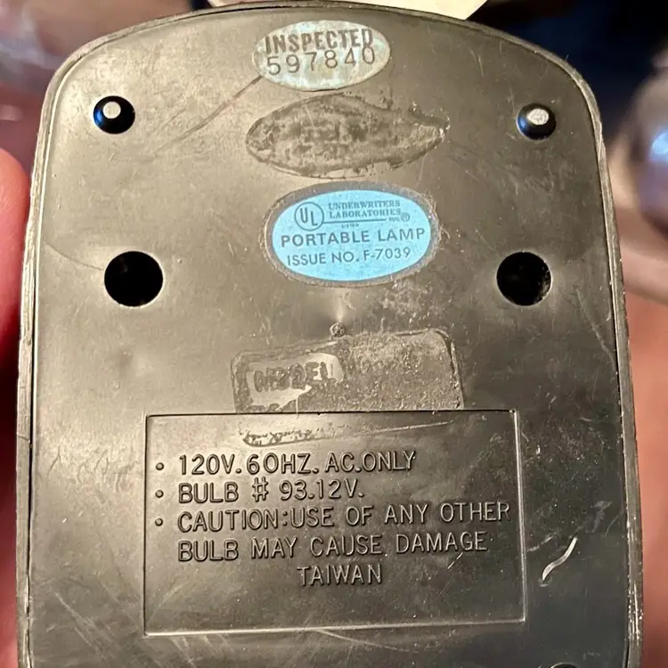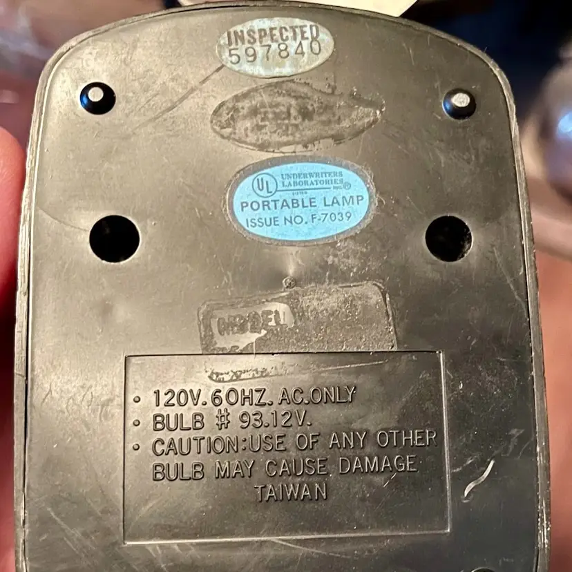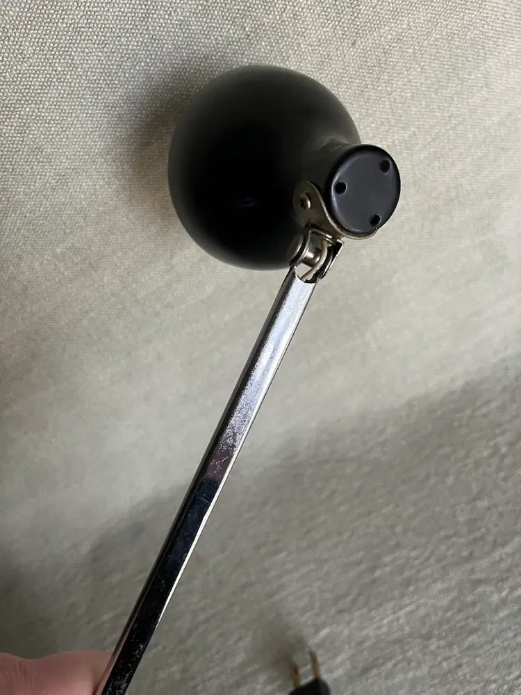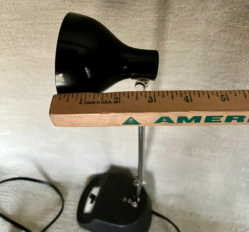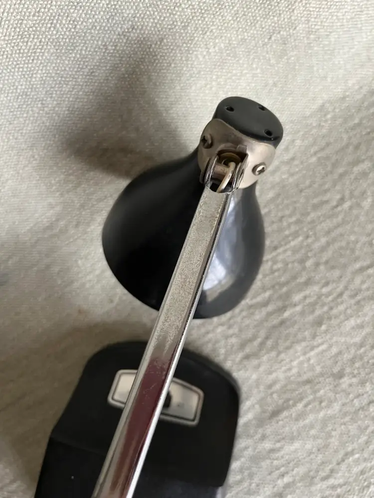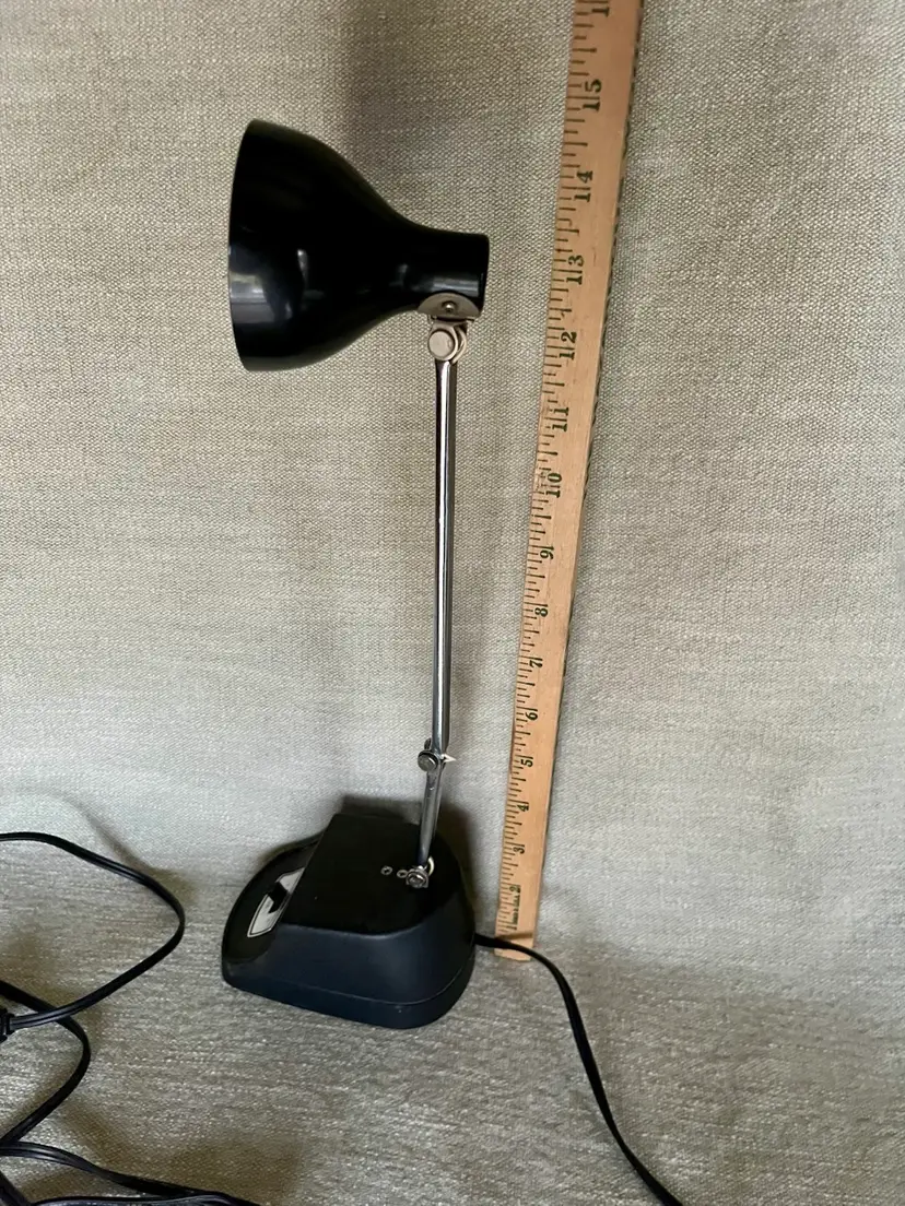This vintage desk lamp features a flexible arm and is made of black metal with silver-tone arm. The lamp is corded electric with approximately a 70 inch cord in a solid color. It is a medium-sized lamp with a matte finish and can be moved around for portable use. The lamp is designed in a mid-century modern style and has a light sensor. It comes with a bulb of #93 12v. Buyer will NEED to provide the light bulb. The lamp was manufactured in Taiwan.