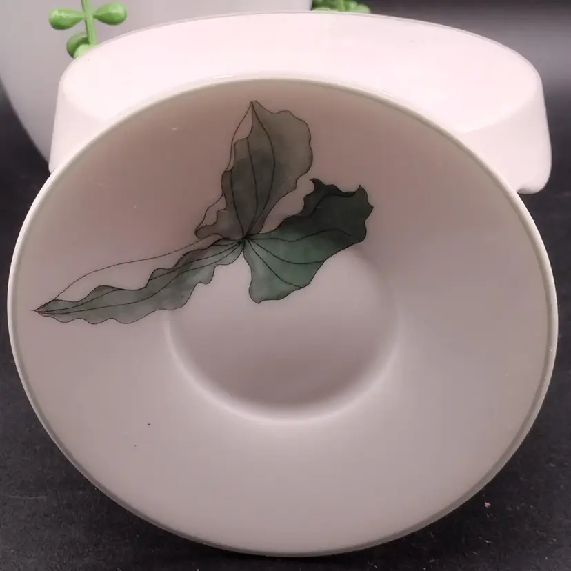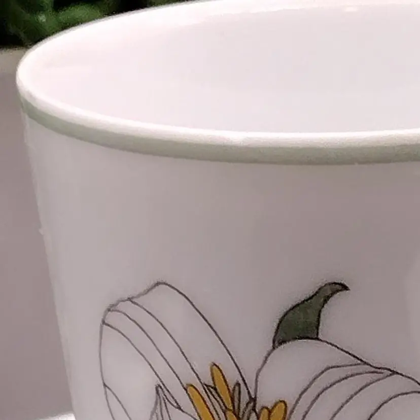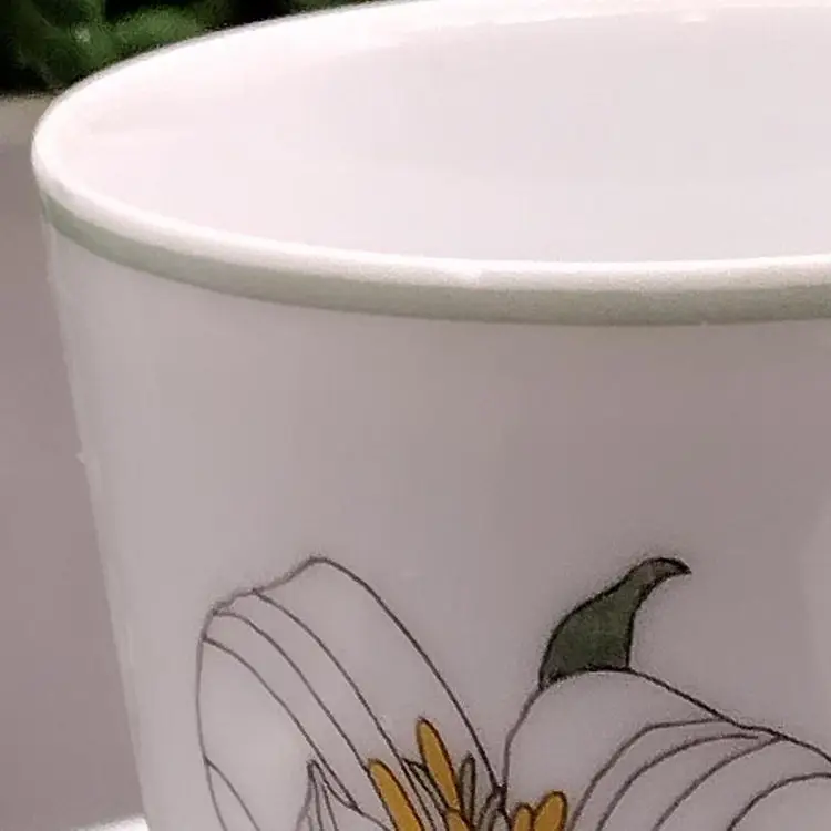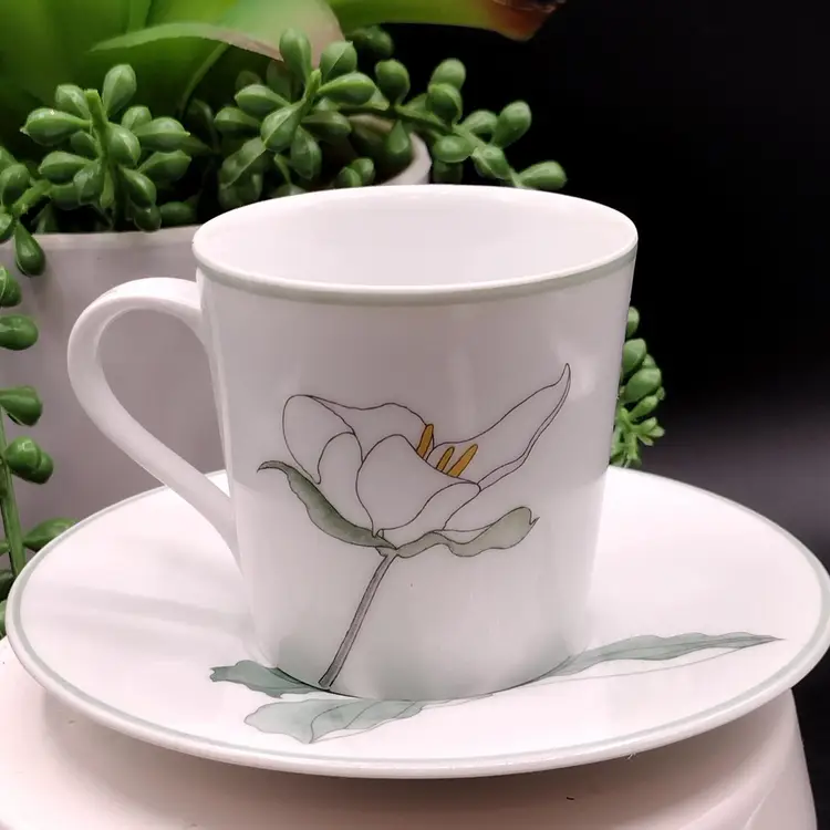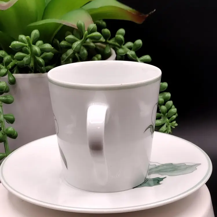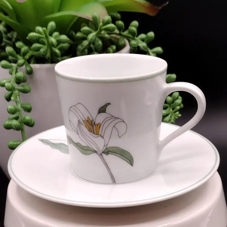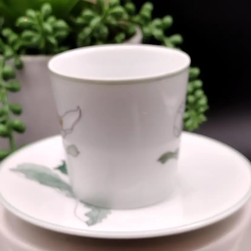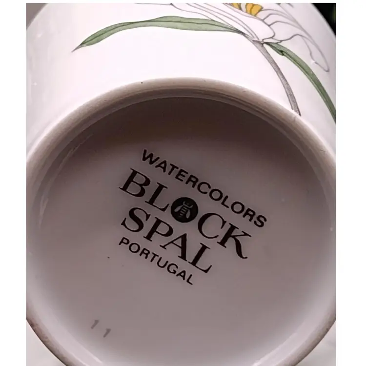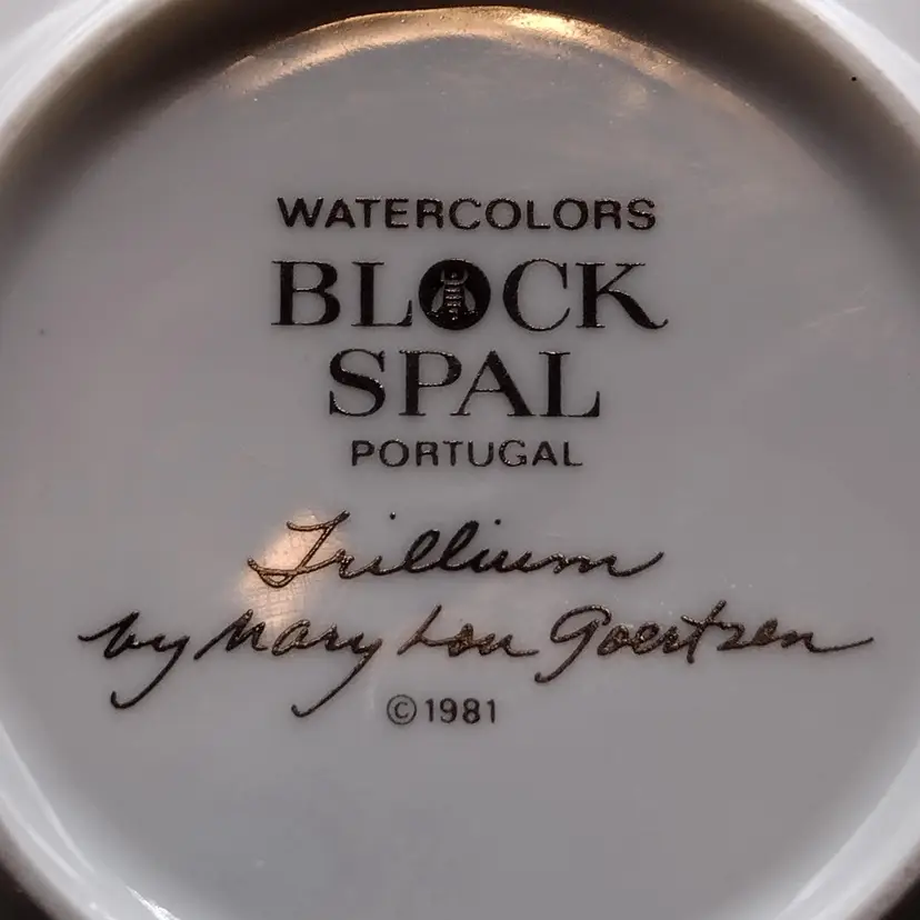 This Demitasse/expresso cup and saucer would be for decorative purposes as there is a chip along the rim of the cup above the design. Lovely Demitasse expresso cup by Block Spal Watercolors line by Mary Lou Goertzen in the Trillium pattern.