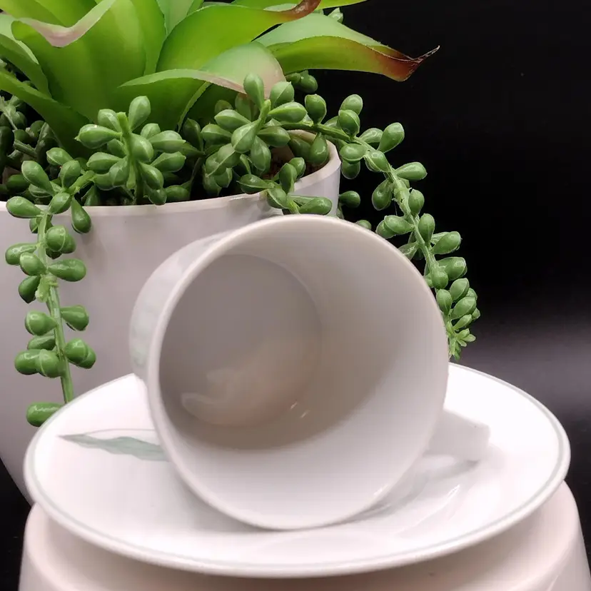 Approximate measurements: Cup diameter 2 1/2 inches x 2 1/4 inches tall Saucer 4 1/2 inches in diamete