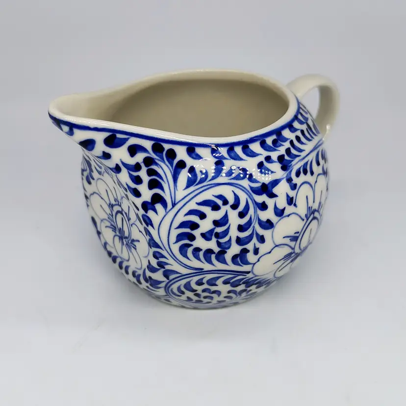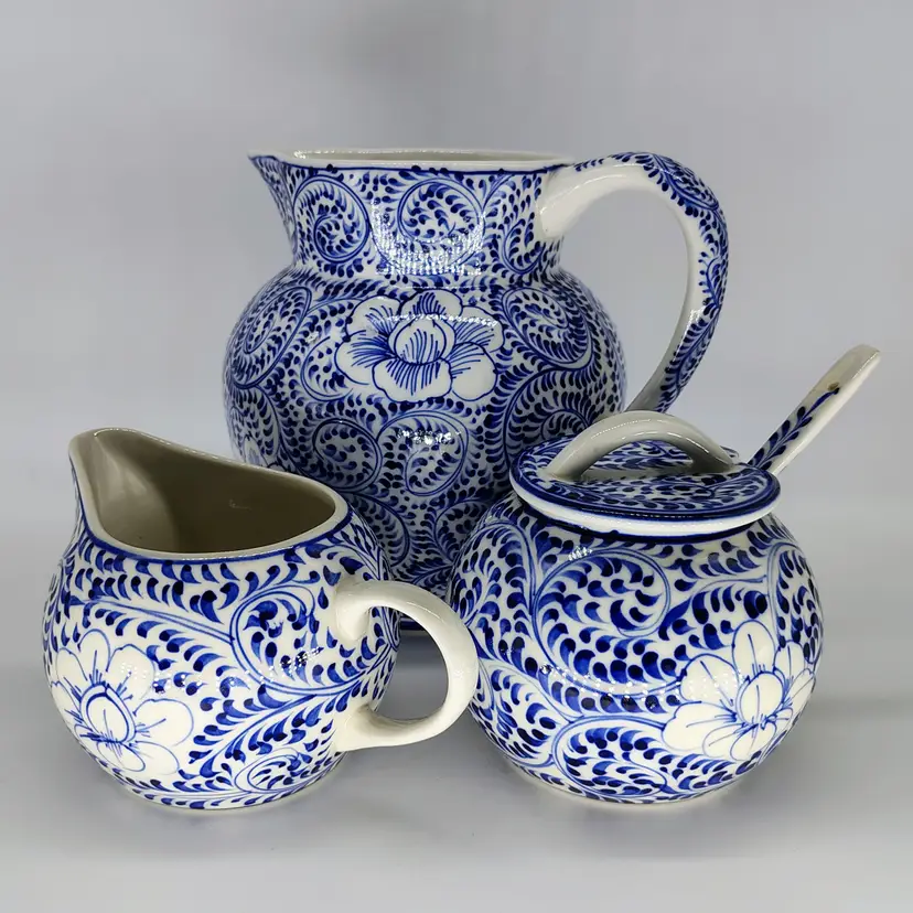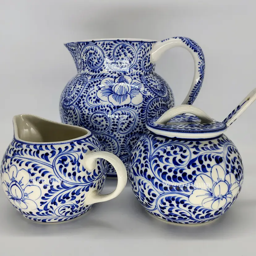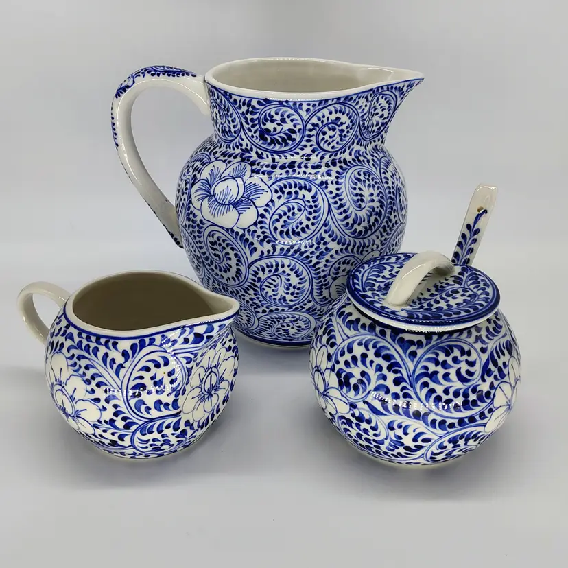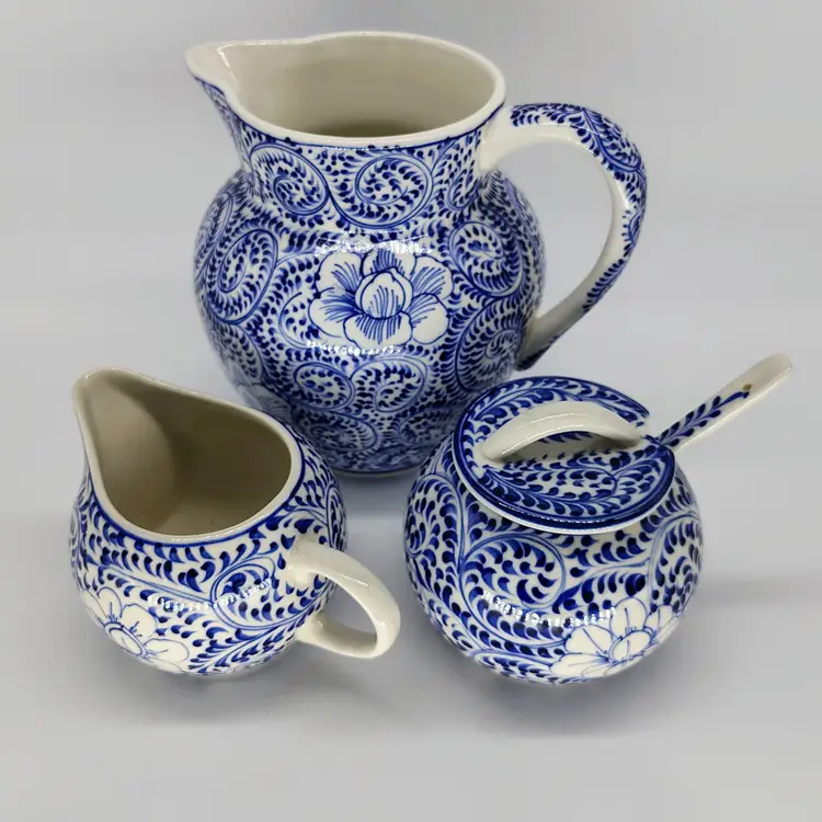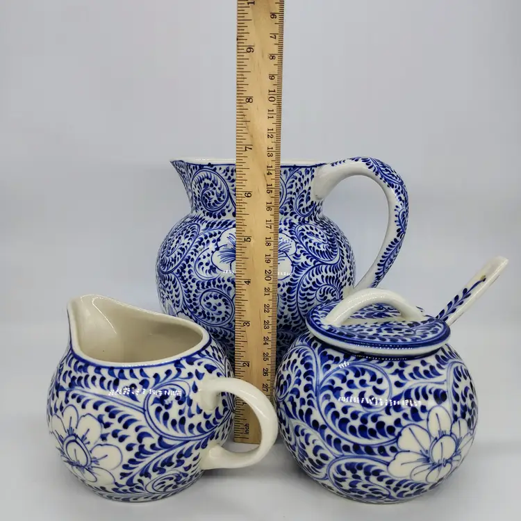 This vintage blue and white floral ceramic pitcher, creamer, and sugar bowl set is a charming addition to any kitchen or dining table. The set features a classic floral pattern on a crisp white ceramic material, adding a touch of elegance to your serveware collection. Perfect for serving cream, sugar, and water with a vintage flair, this set is both functional and decorative, making it a unique and stylish choice for any home.