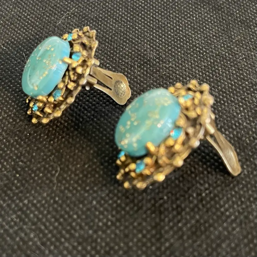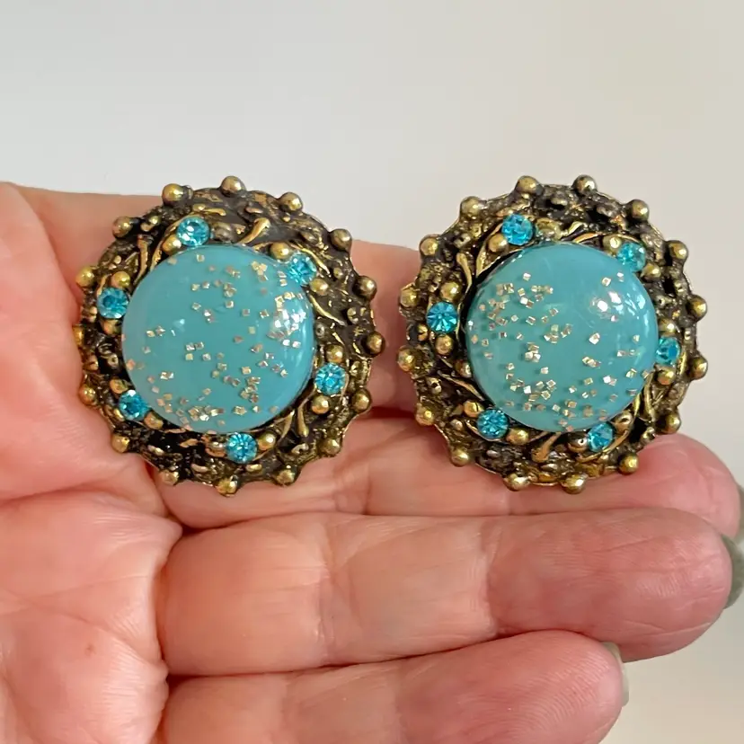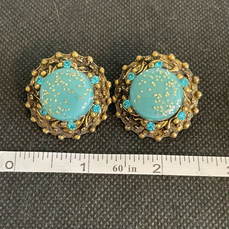 Vtg Blue Confetti Clip Earrings Crystal Rhinestone Gold Textured Glitter Dome