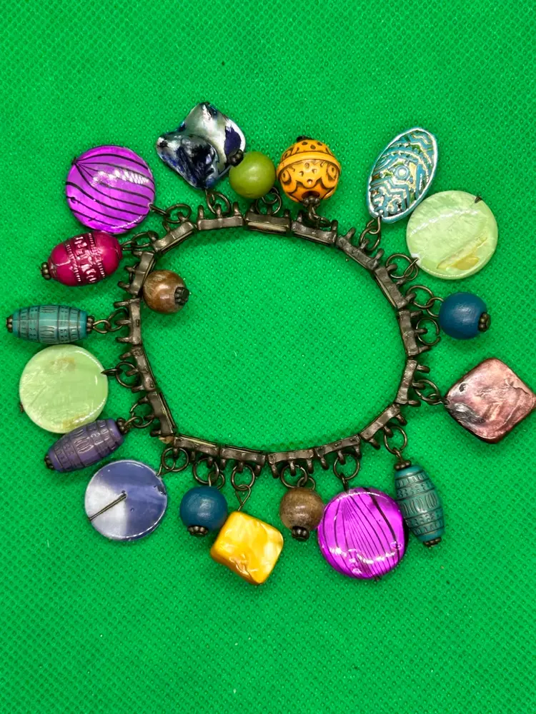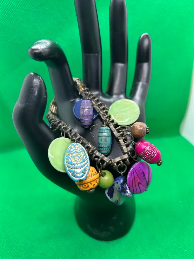 So many unique beads adorn this cool boho style vintage stretch bracelet. Please see photos as they are part of the description. Thank you for looking!