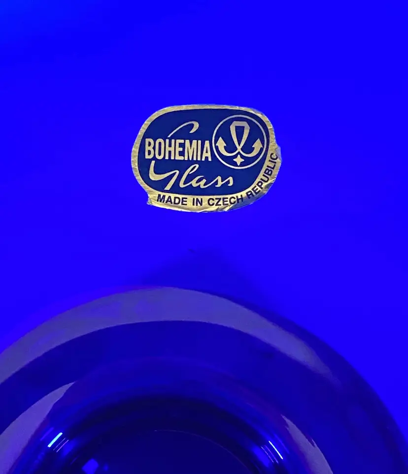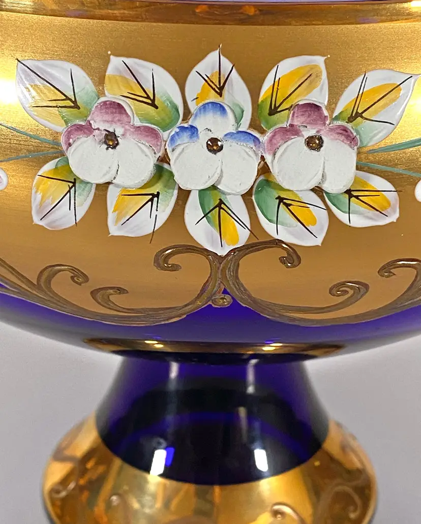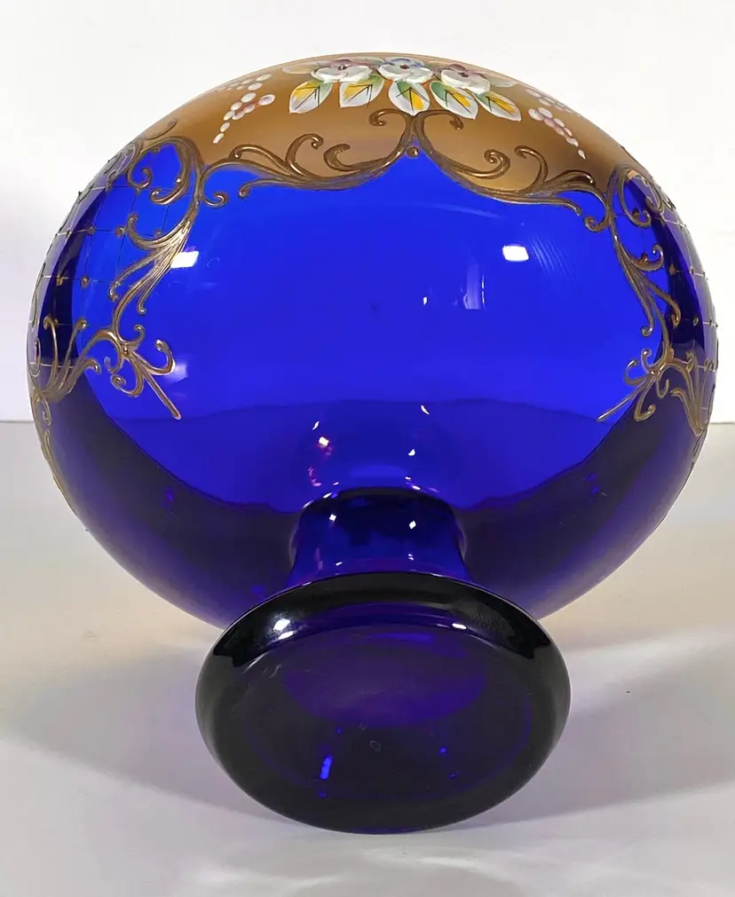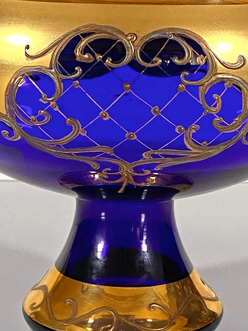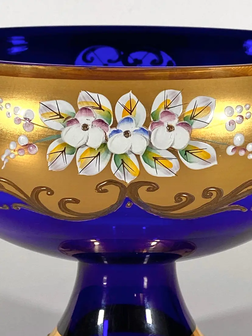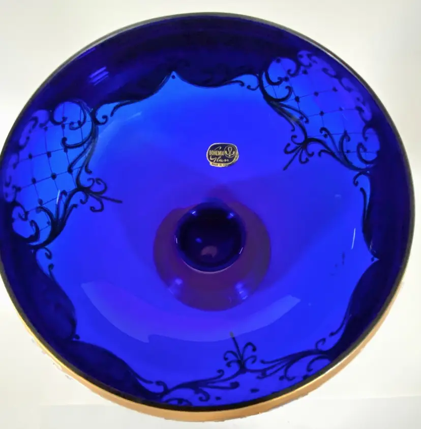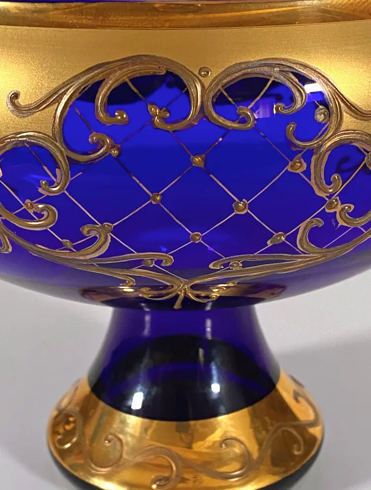 This is a gorgeous vintage Bohemian Rococo cobalt blue glass bowl (footed) made by Bohemia Glass, with hand-painted 24K Susal gold motifs. This bowl is in pristine condition, with no flaws. Measurement: 7" height x 8" diameter. Weight: 1lb_10oz