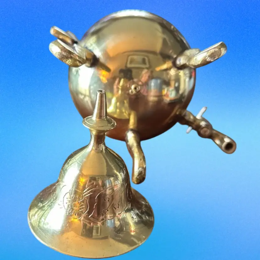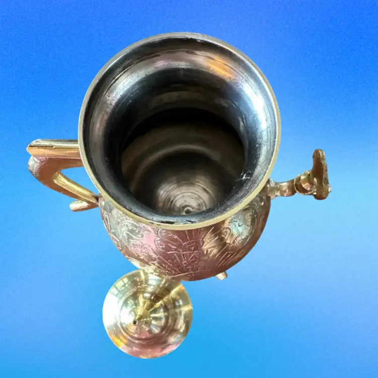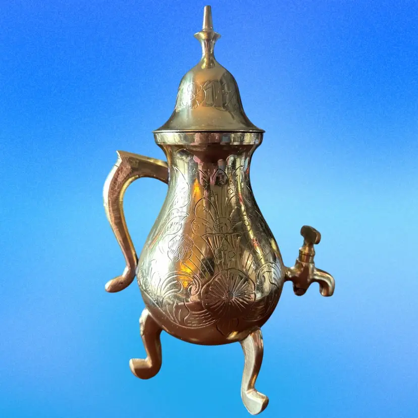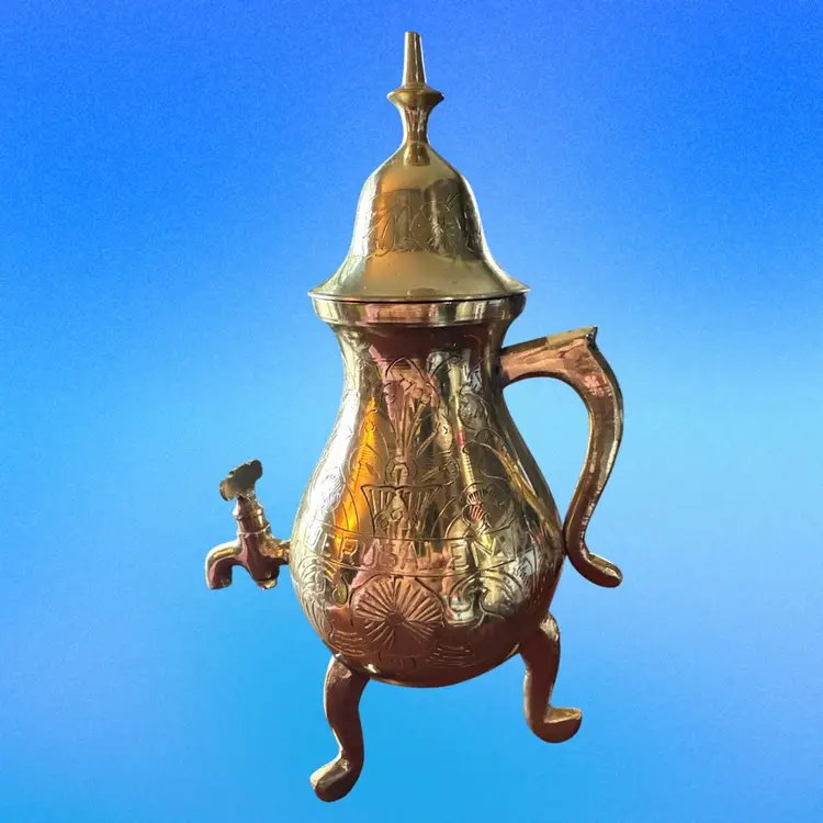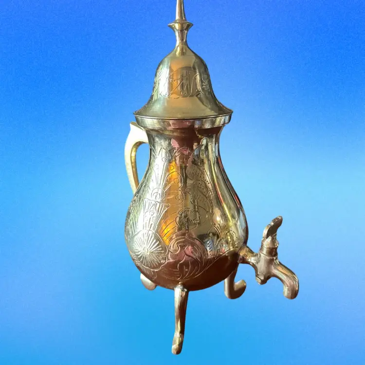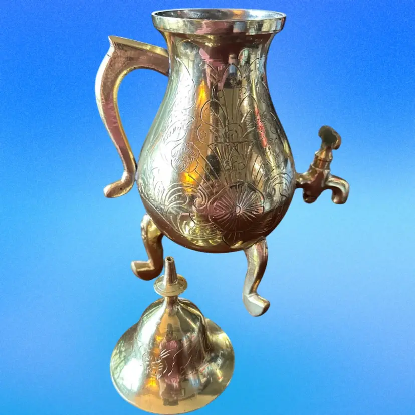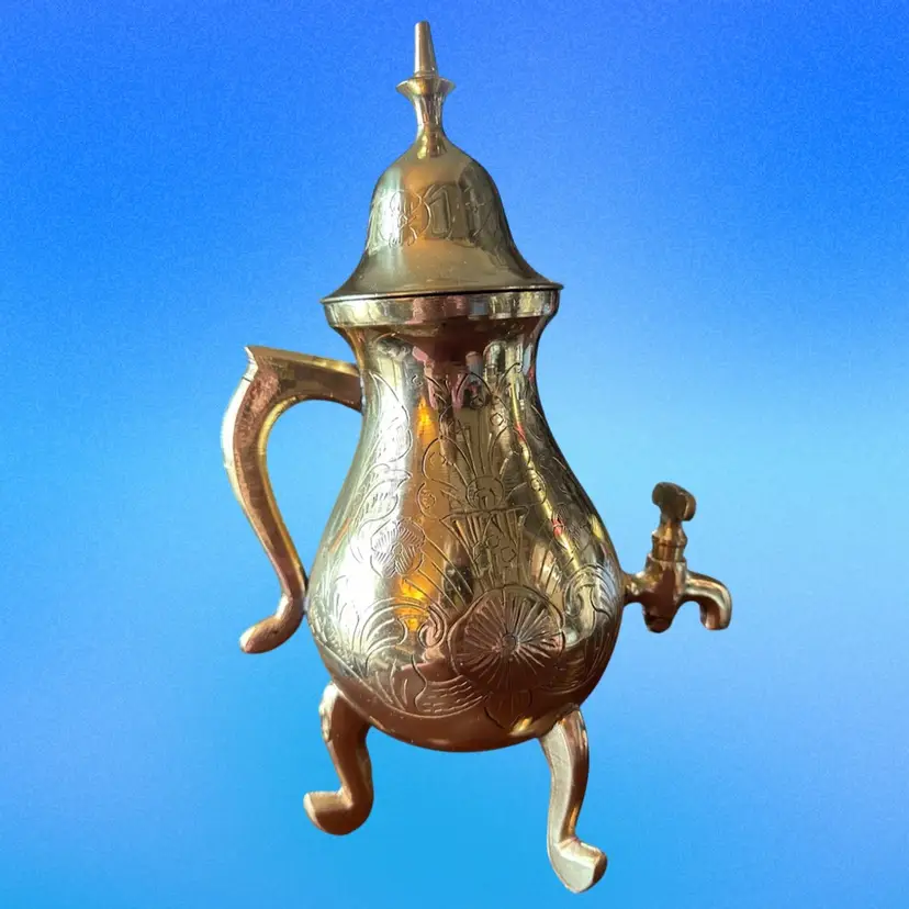 This vintage brass teapot is a stunning collectible piece that stands at 10 inches tall. Made in Israel, this ornate teapot features a beautiful gold color and intricate designs. Perfect for any tea lover or collector, this heavy brass teapot adds a touch of elegance to any home decor. Its vintage charm and unique craftsmanship make it a standout piece that is sure to be a conversation starter.