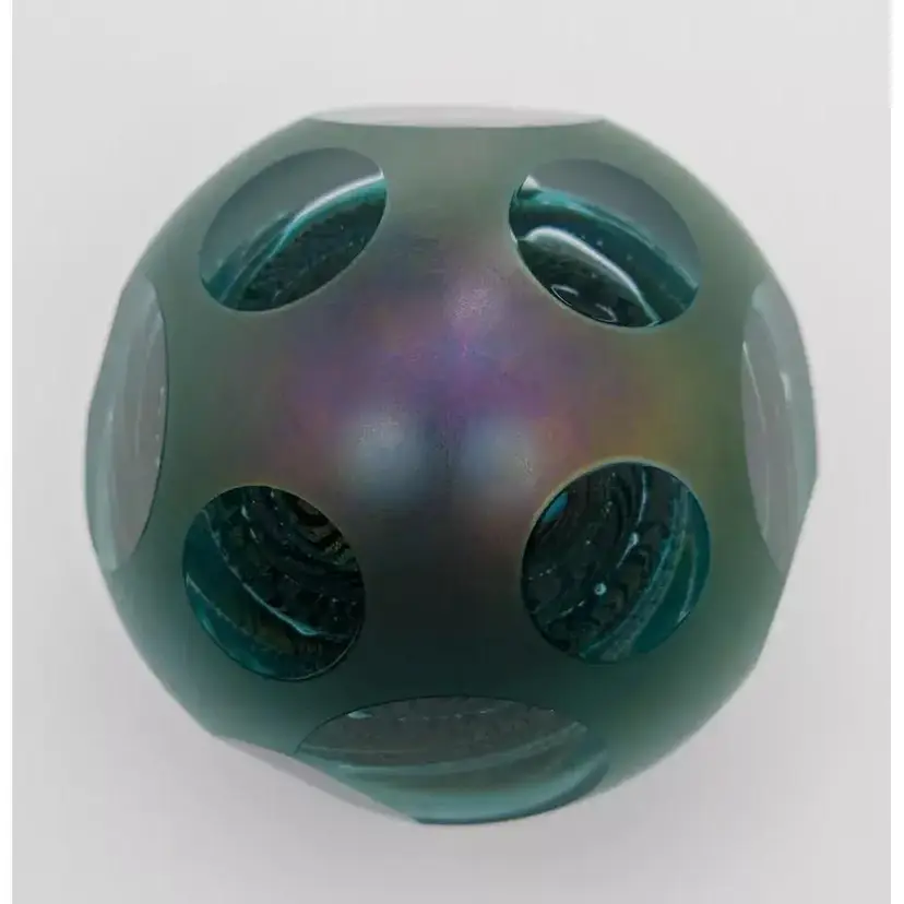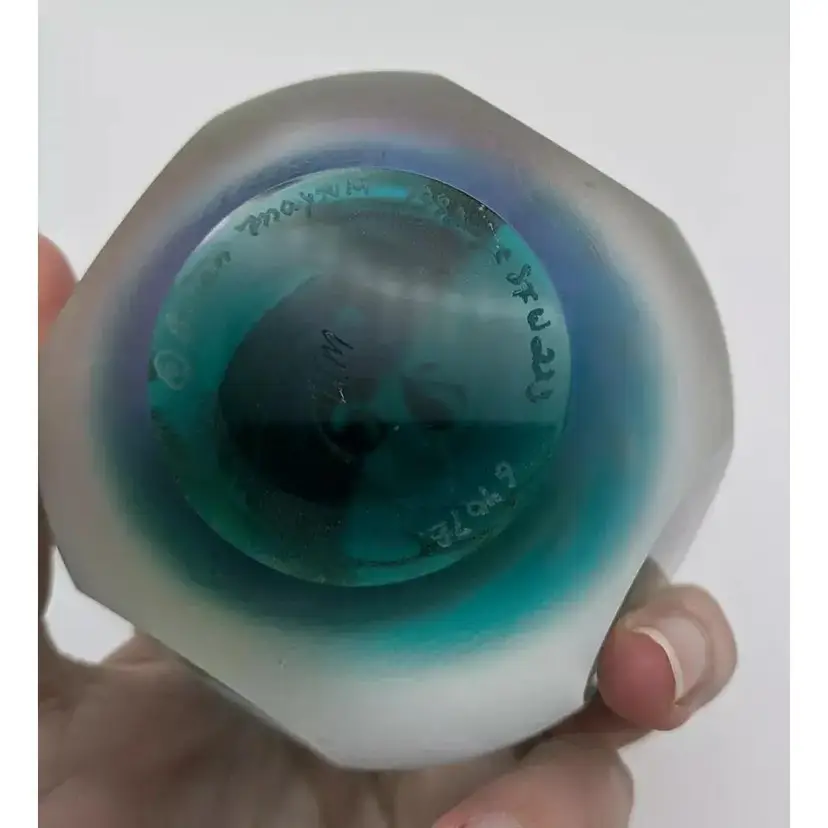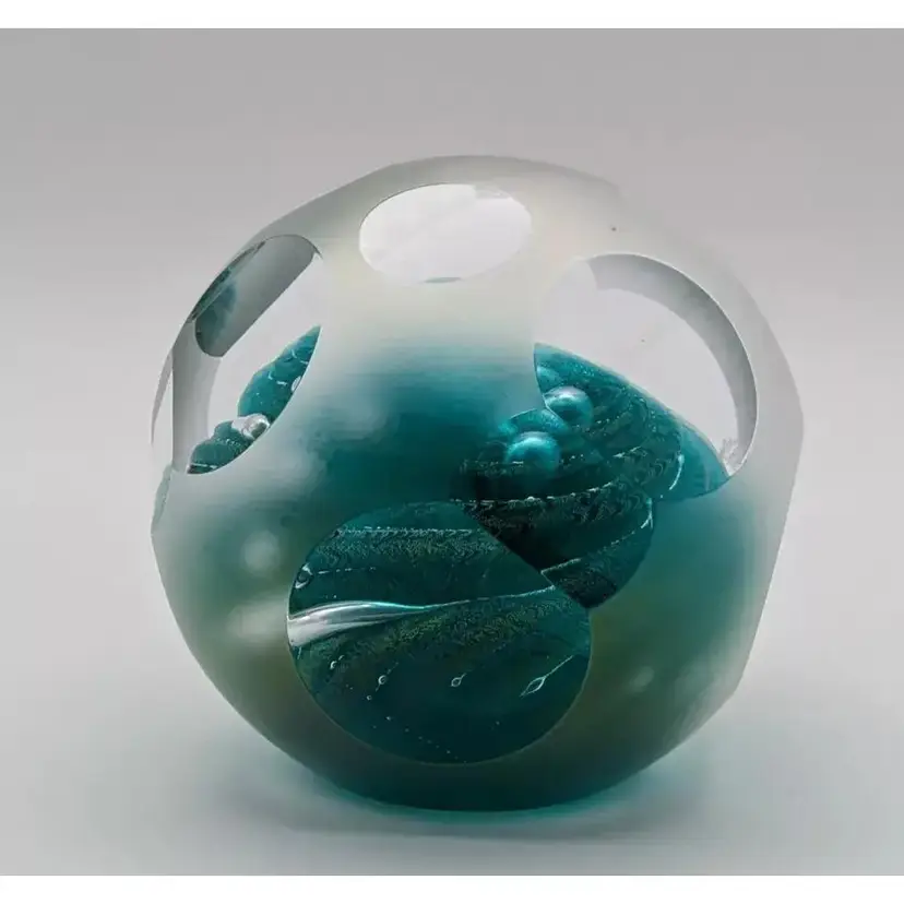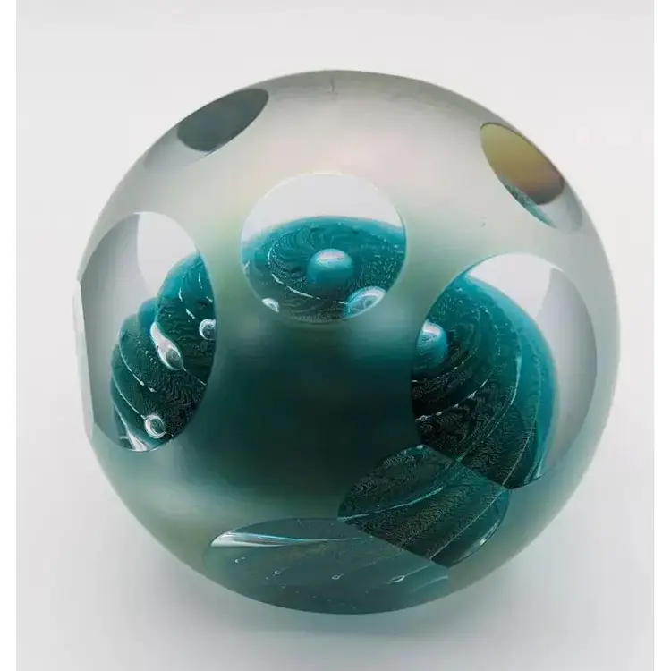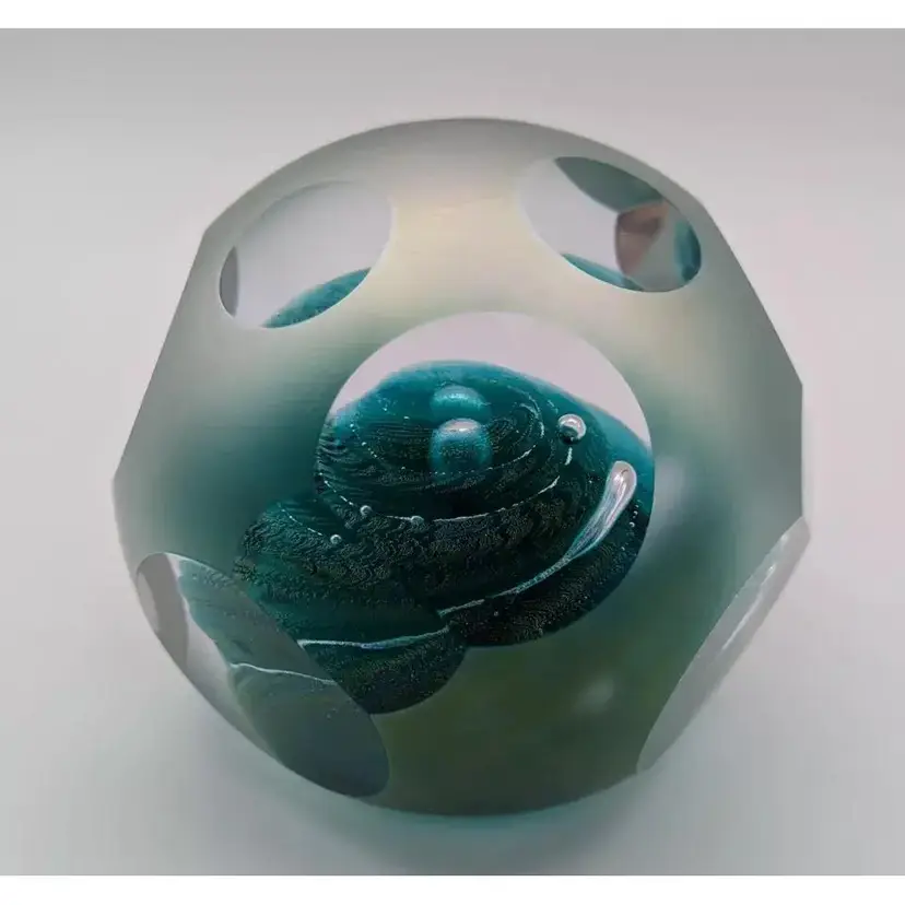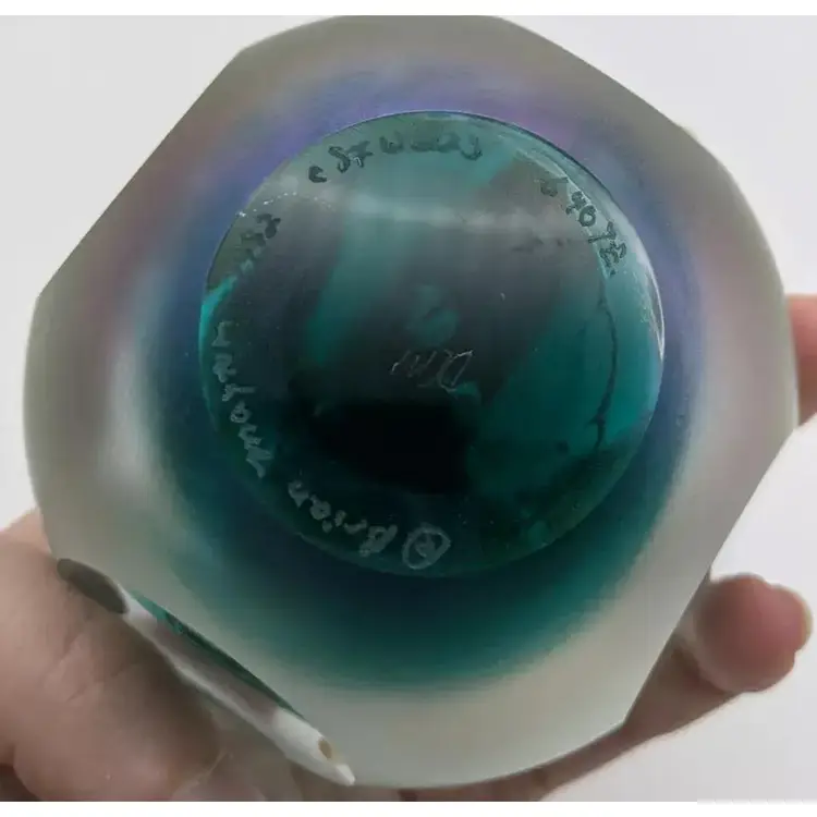 Large iridescent blue paperweight with round facets that let you see into a beautifully constructed spiral that sits in the center of this hand-blown paperweight. It was made in Brian Maytums art glass studio and is signed "DCM", which may be the initials of the artist who created this piece. EUC