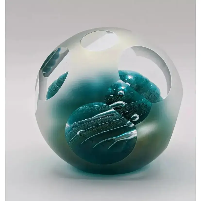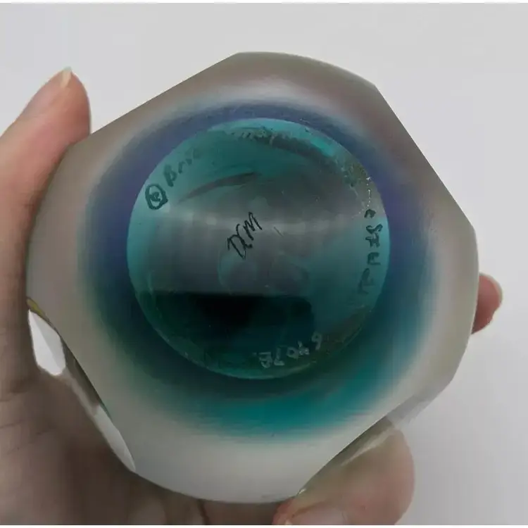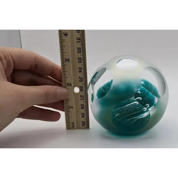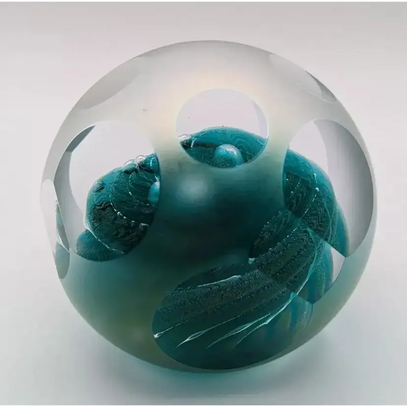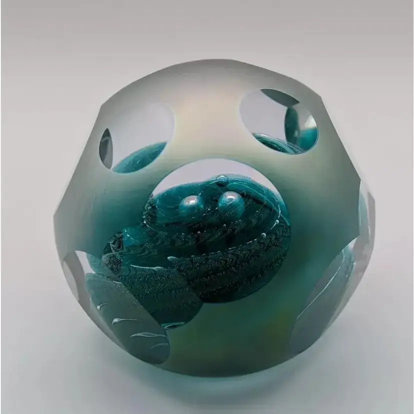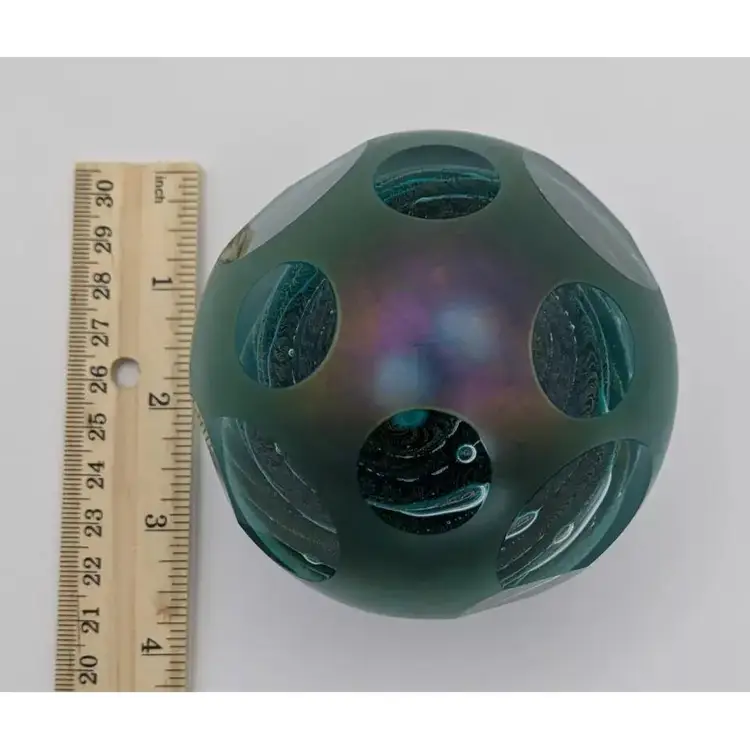Large iridescent blue paperweight with round facets that let you see into a beautifully constructed spiral that sits in the center of this hand-blown paperweight. It was made in Brian Maytums art glass studio and is signed "DCM", which may be the initials of the artist who created this piece. EUC