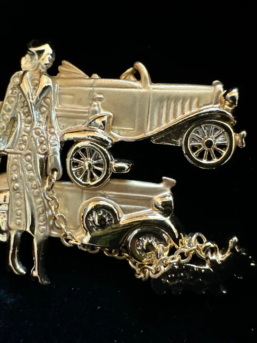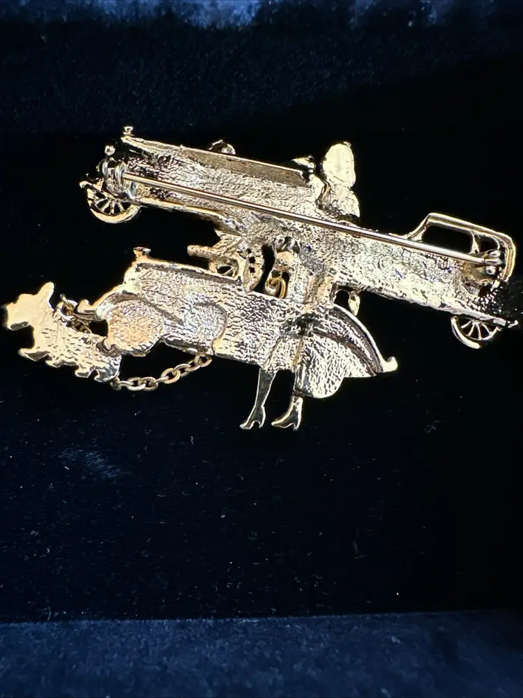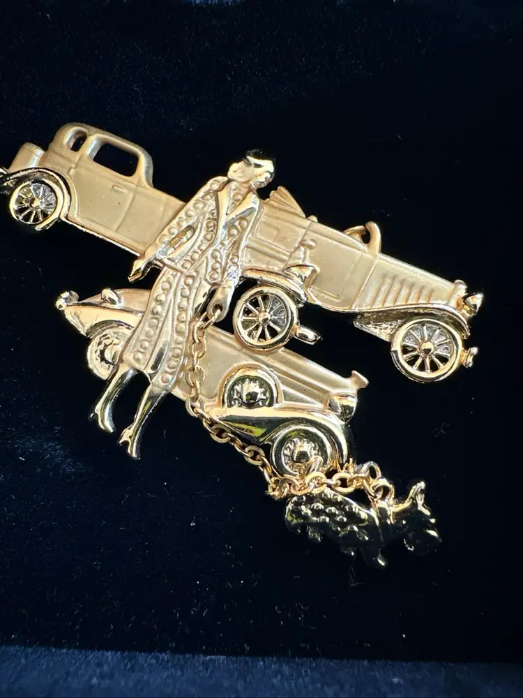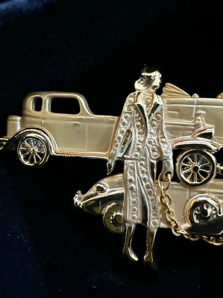 This vintage brooch features an antique car, flapper girl, and terrier dog design in a unique and eye-catching satin/shiny gold tone. Perfect for those who appreciate vintage and antique jewelry, this estate pin adds a touch of nostalgia to any outfit. With its intricate design and classic appeal, this brooch is a must-have for collectors and fashion enthusiasts alike.No sign of wear, excellent condition.