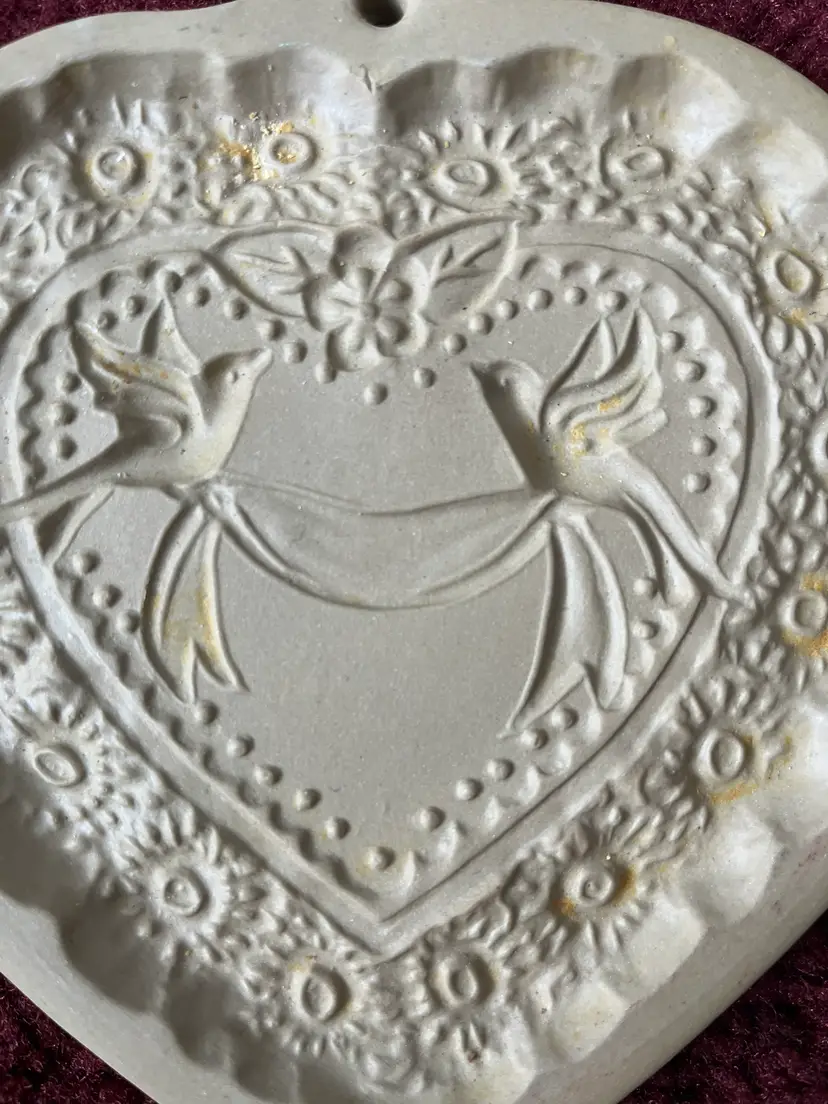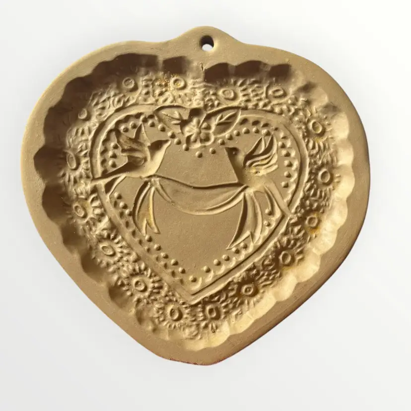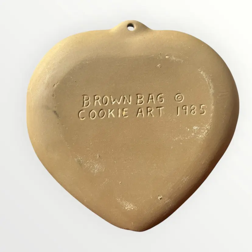 Vintage Brown Bag Cookie Mold Cookie Art 1985 Victorian Heart with Doves, Banner, and Lace Detail Approximately 6" Wide x 6" Tall Very good vintage condition. No chips, cracks, stains, or other flaws detected.