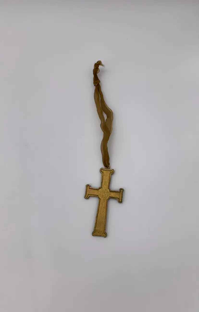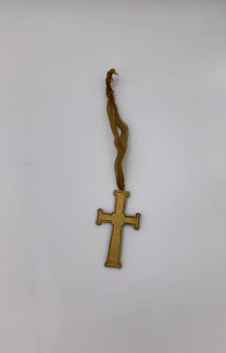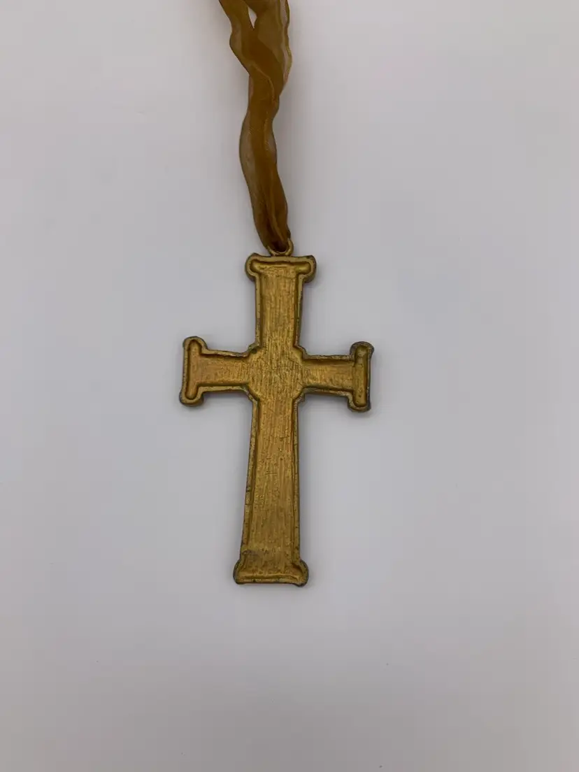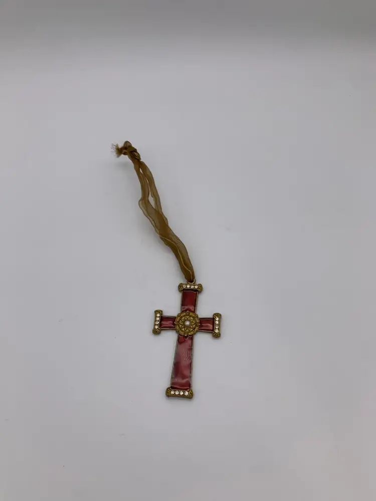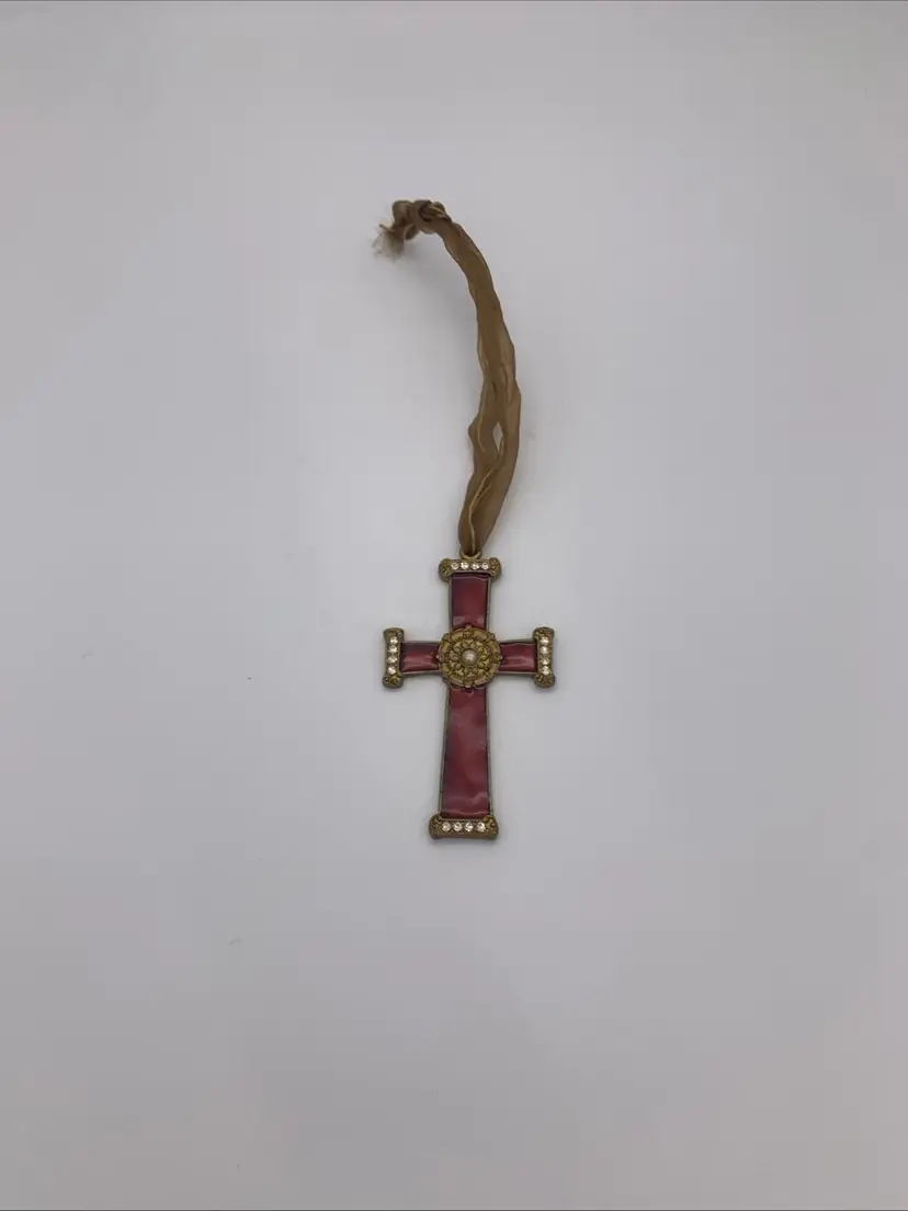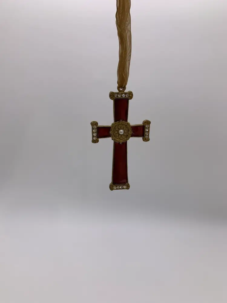 The product is a vintage Byzantine-style ornament or pendant made of red enable with a gold tone metal. The cross can be used as an ornament, pendant or collar jewelry. It is designed with a round gold tone emblem with a single small faux pearl in the center, the top, bottom & out stretch has gold tone metal accents with a total of 16 shiny rhinestones and features a lovely brown sheer ribbon for hanging approximately 9.5” in length. The cross is 3.5” high, the out stretch section is 2” across. This Beautiful one of a kind vintage cross is to be a religious symbol of Christianity and is likely to be used as a decorative piece for collectors of religious artifacts.