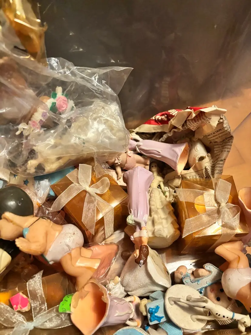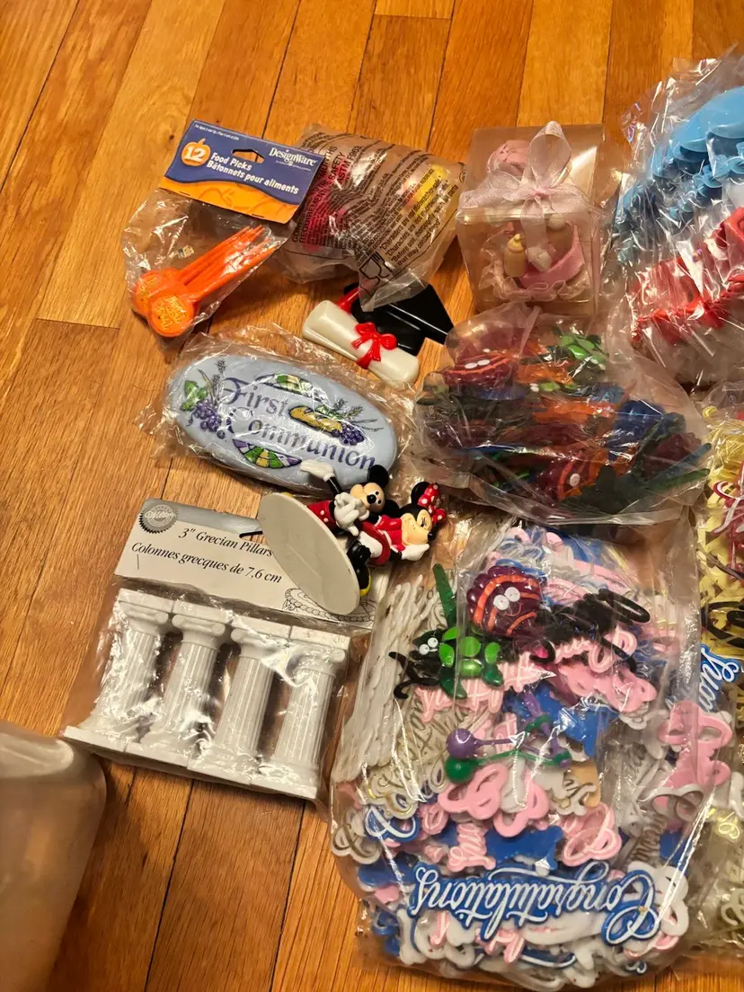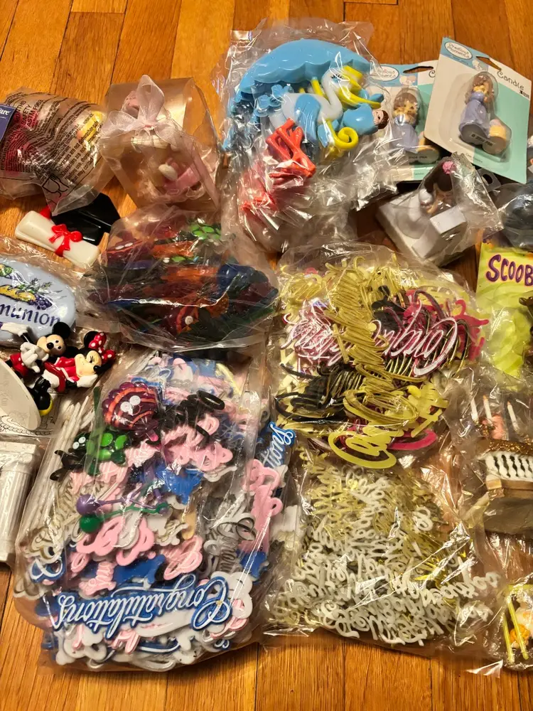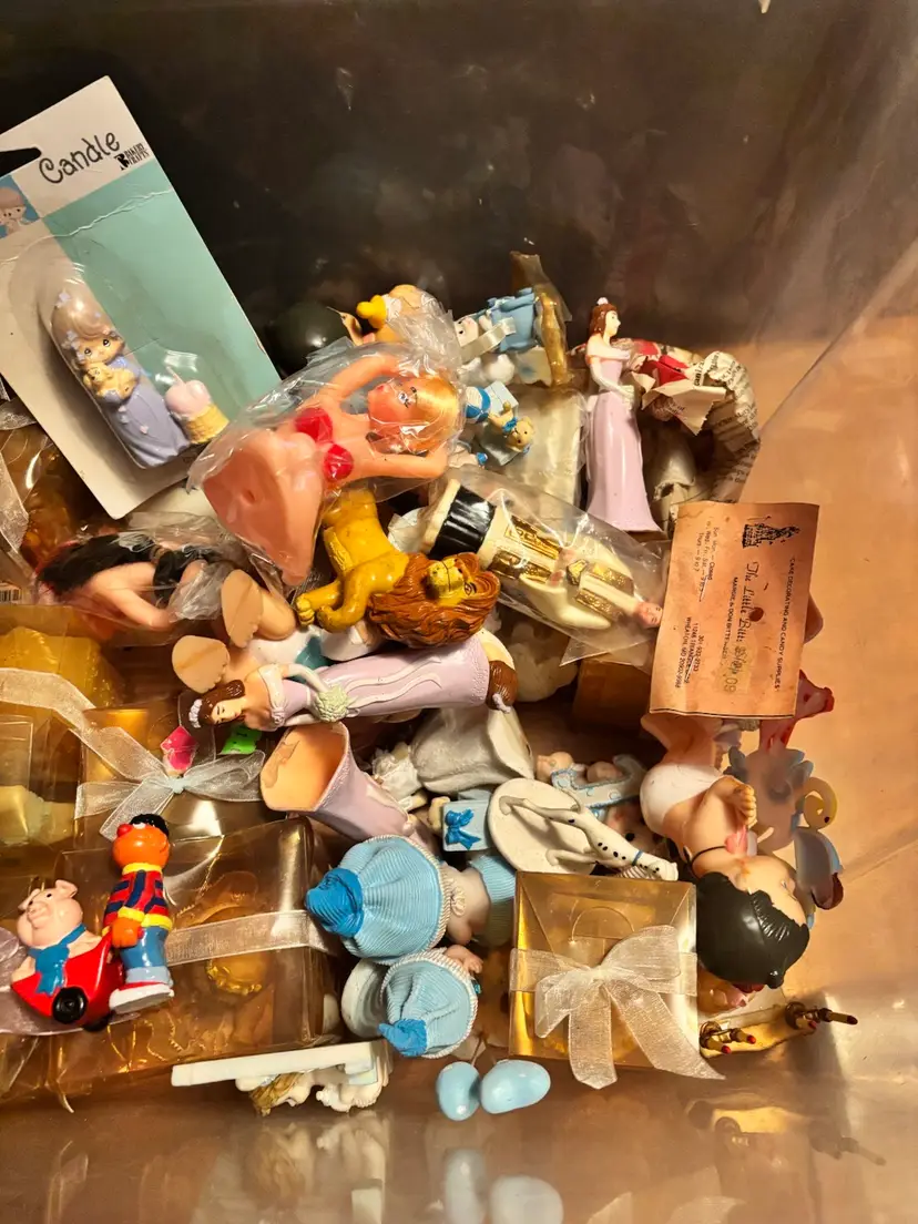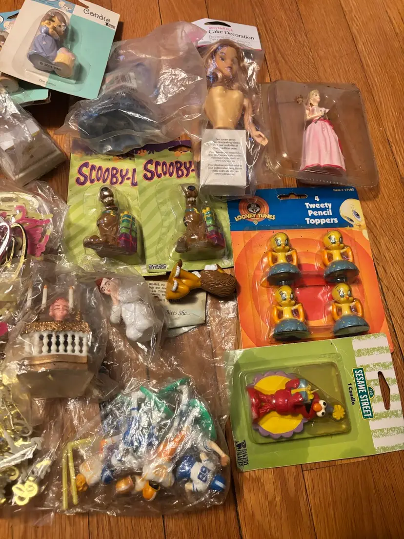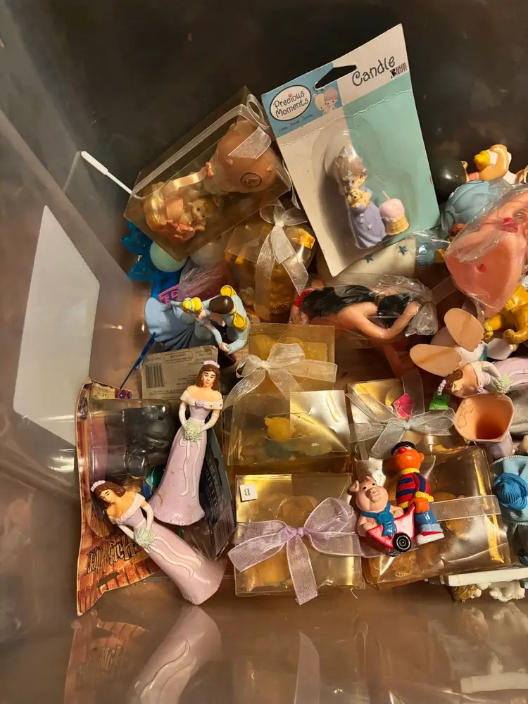 All different types, plastic, ceramic, some candles. Scooby doo, Sesame Street, first communion, baby shower, wedding etc. some may require further cleaning. Was found as a lot, not willing to separate