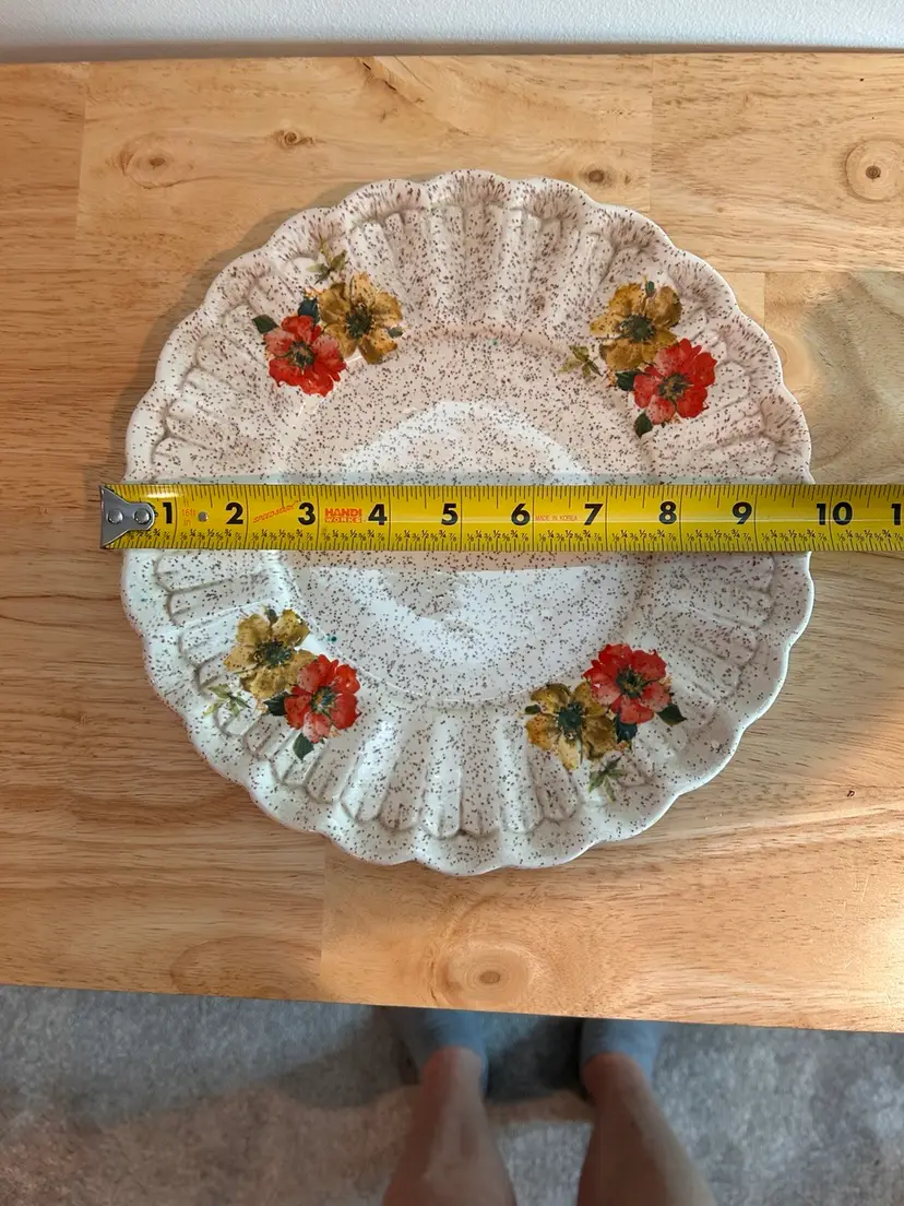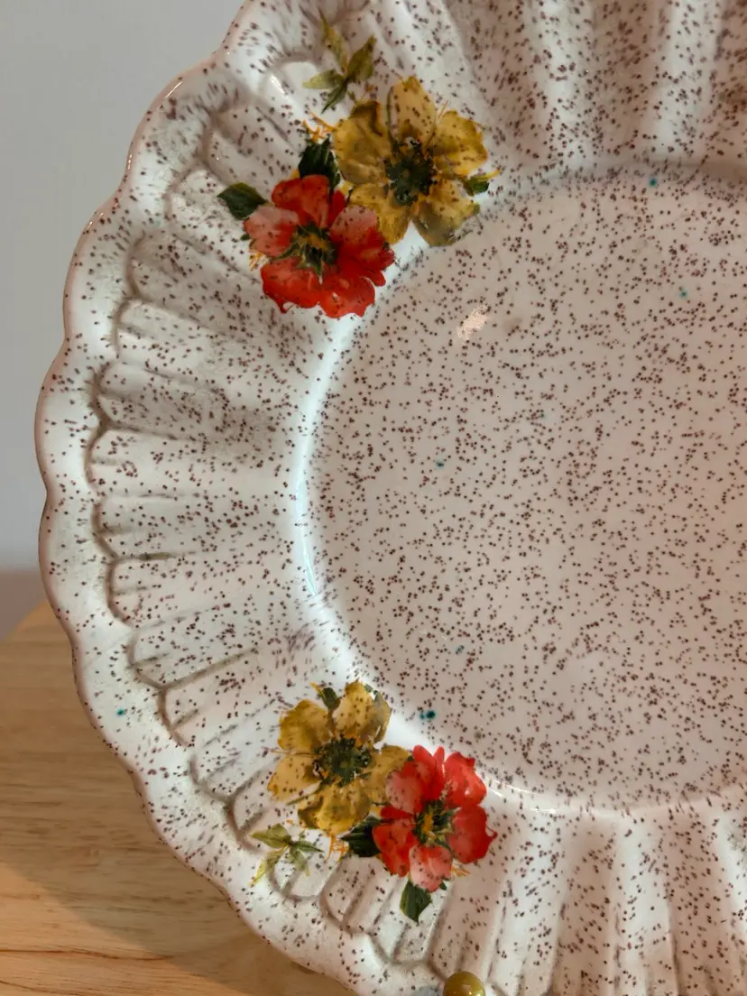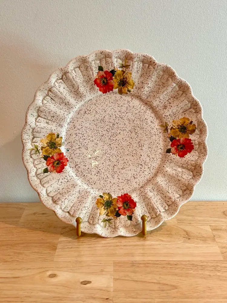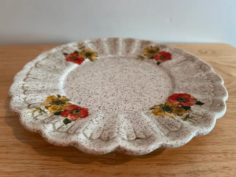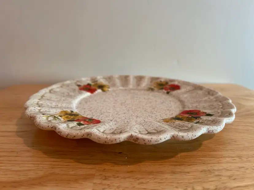 This is mid century California USA pottery scalloped plate that features a beautiful design of red and yellow poppy flowers. Made of stoneware with a semi-matte finish, this original mid 20th-century piece is signed by the California Pottery brand. The 10-inch dinner plate can be an eclectic add-on to create a unique and visually interesting tablescape. Made in the United States, signed cali #663 USA. No chips, cracks or repairs. Very clean. Smoke/Pet Free Home. ** -If you’re loving Vintage Items, my listings might have that special item for you or as a gift for a friend.