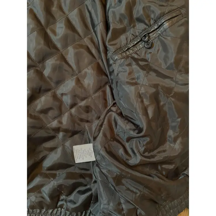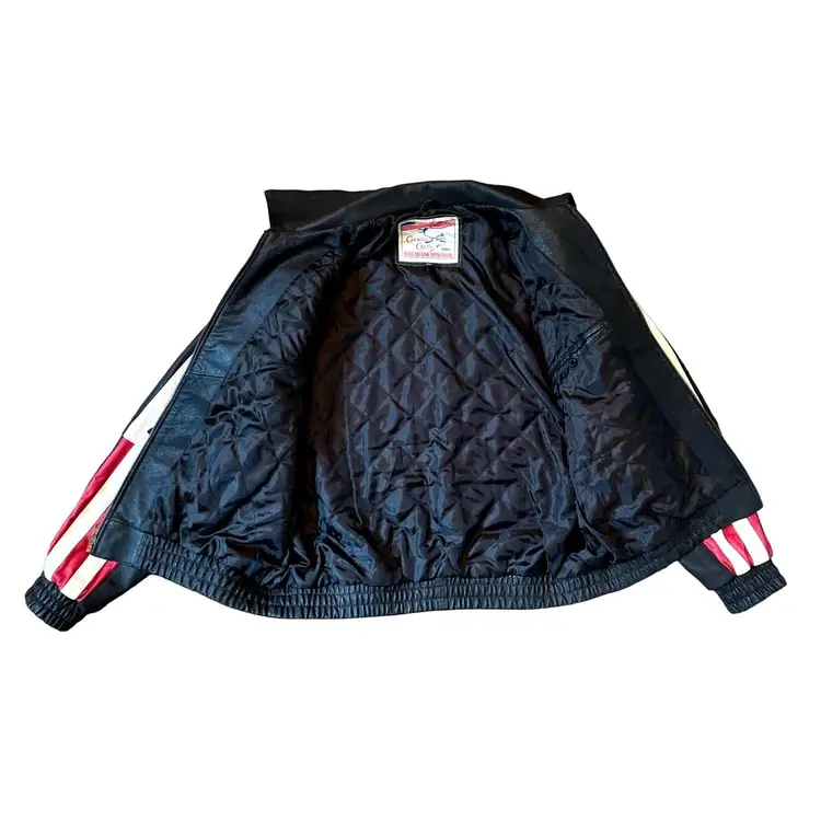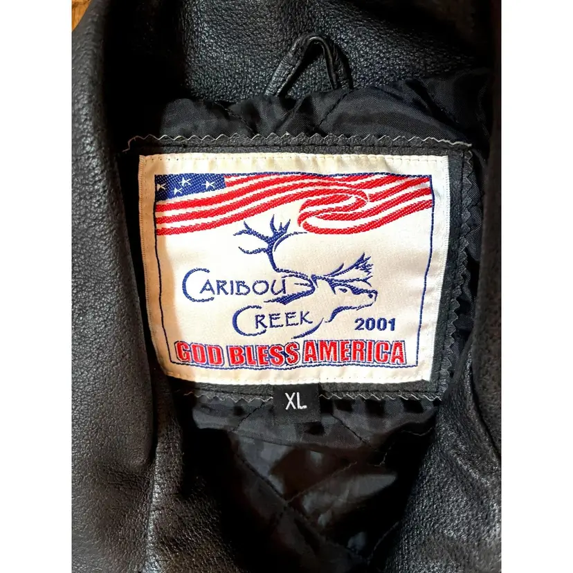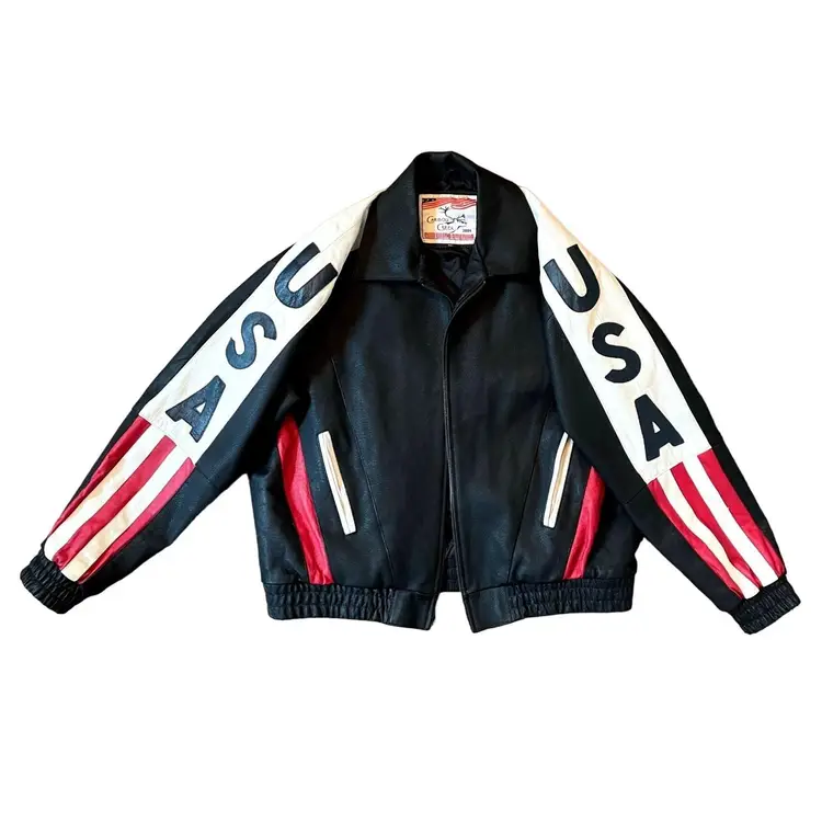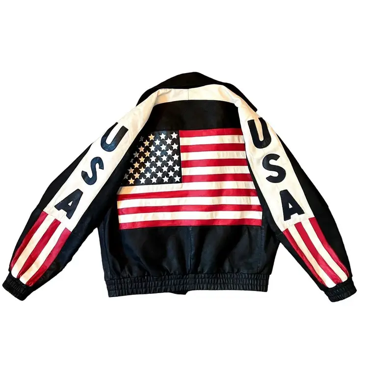 Vtg Leather USA American Flag Full Zip Bomber Jacket Size XL. There are nips or tears but there is discoloration on the white leather. Dry-cleaning is suggested. Features: USA on Each Sleeve American Flag on the back with embroidered stars. Interior has a breast pocket.