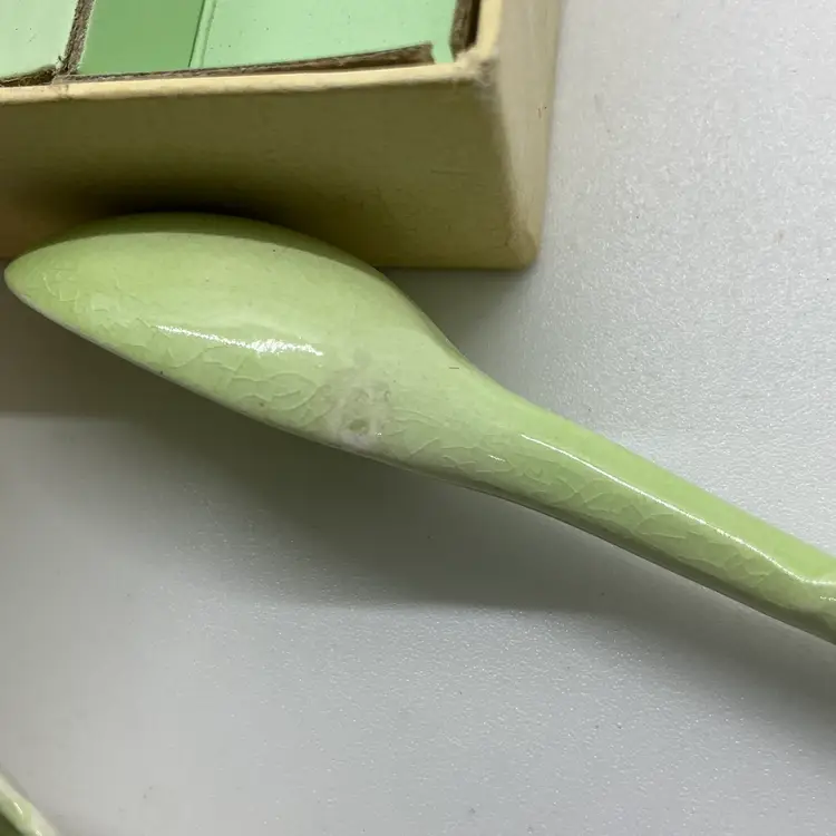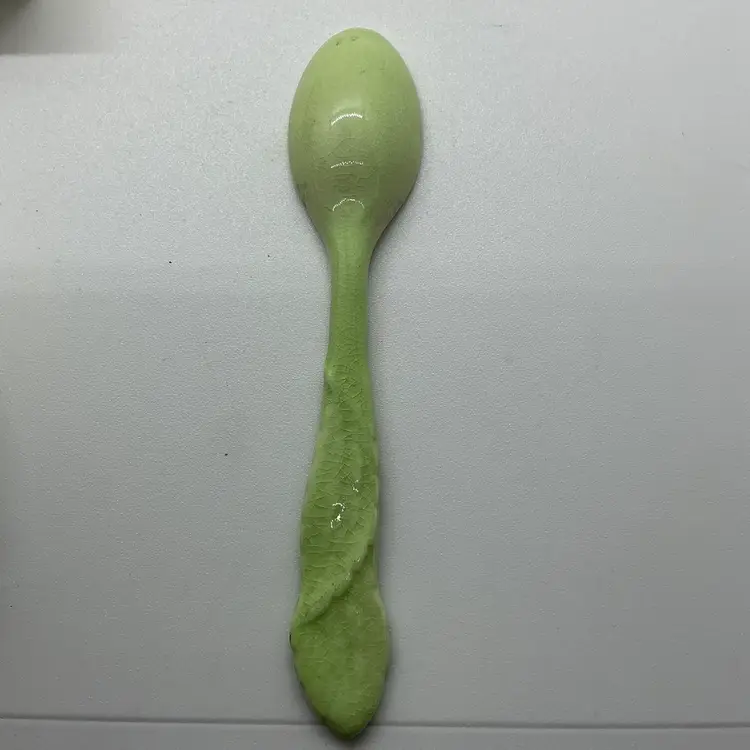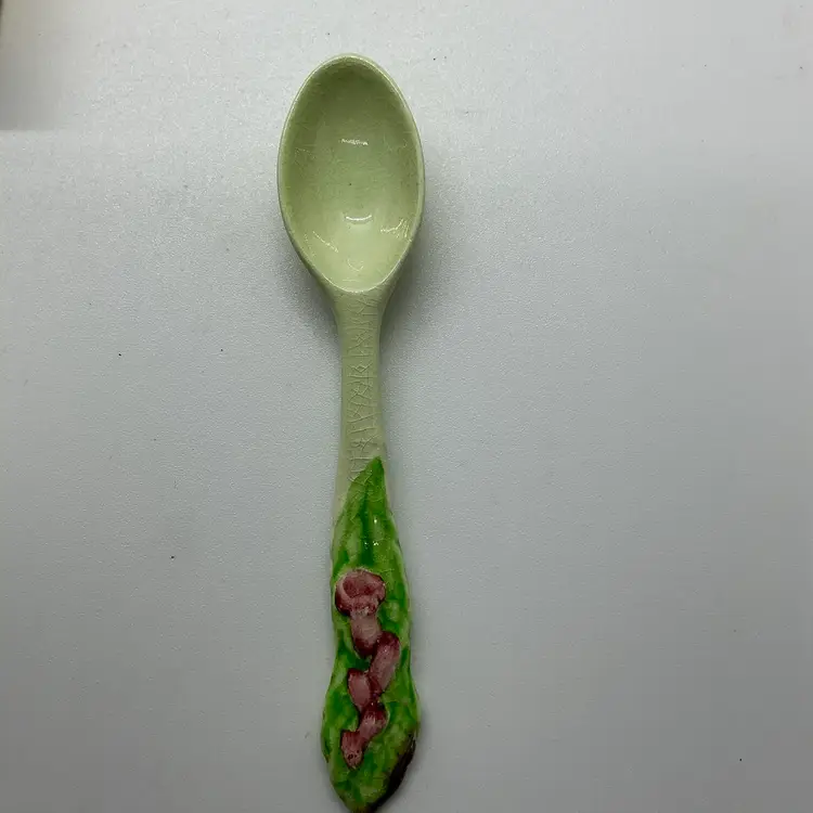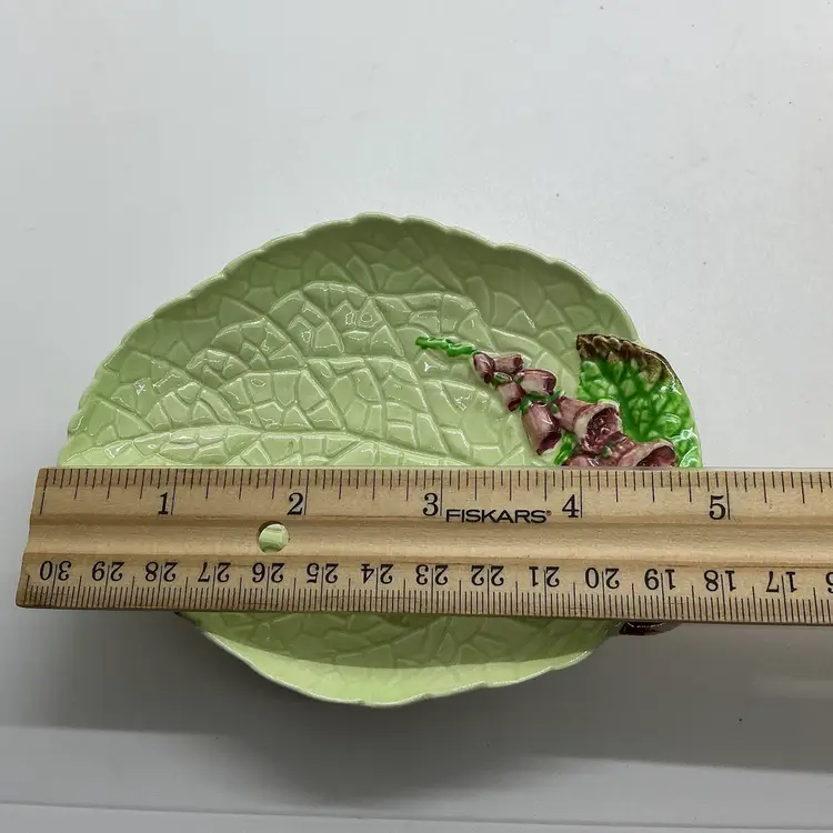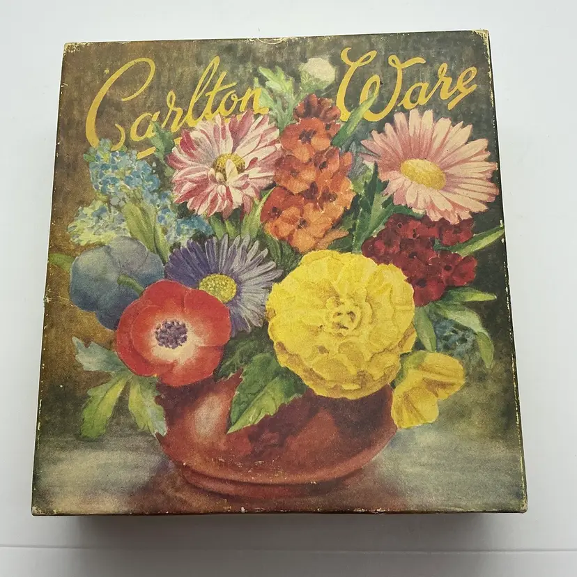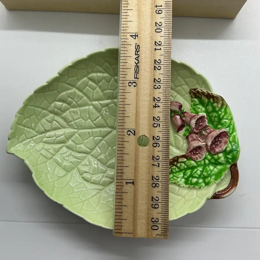 This vintage Carlton Ware hand-painted condiment plate and spoon set features an Australian design, with a leaf and floral shape in green and multicoloured hues. Made from bone china with a glossy finish, this original piece from England comes boxed and is a perfect addition to any collection. This was a family members, probably my grandmother’s. Some crazing, no chips or cracks. Comes from a non smoking home.
