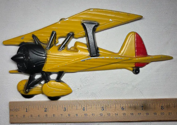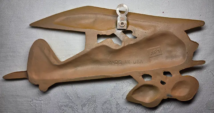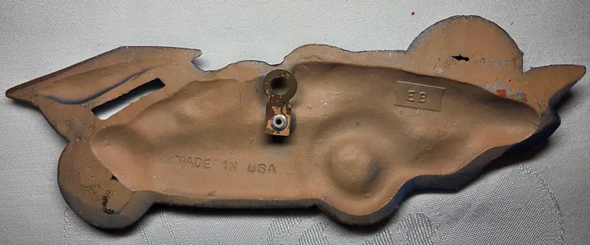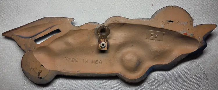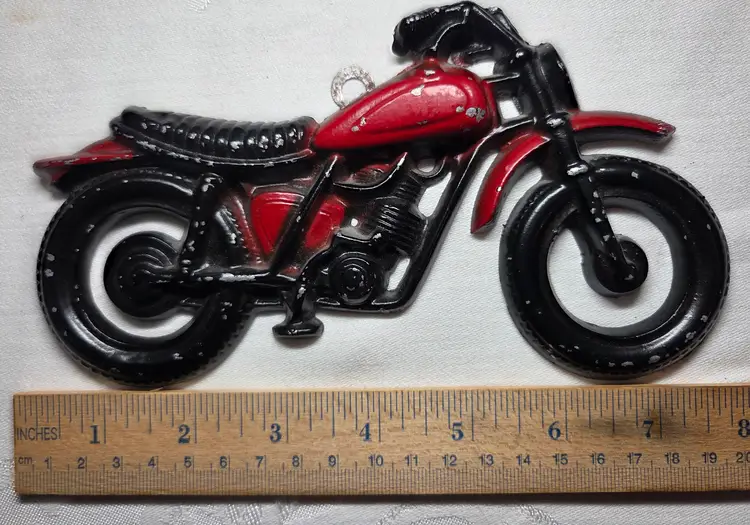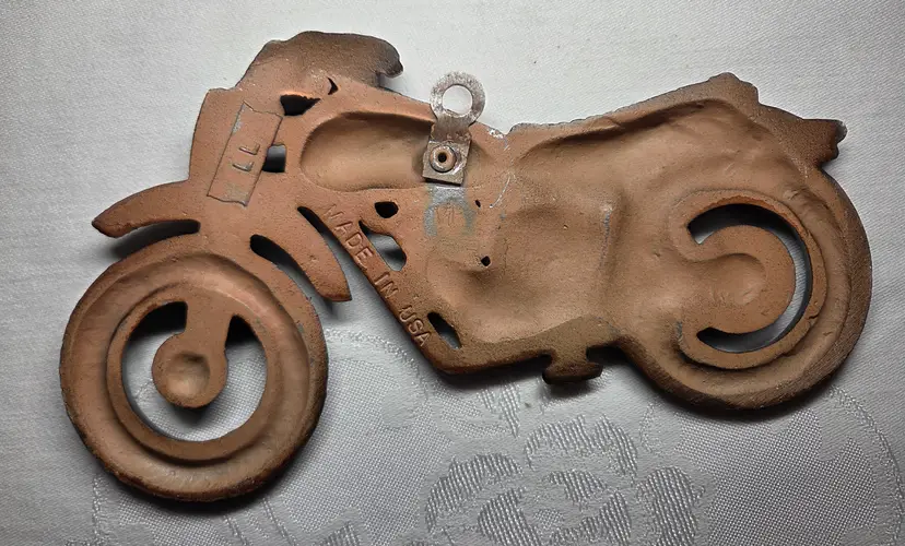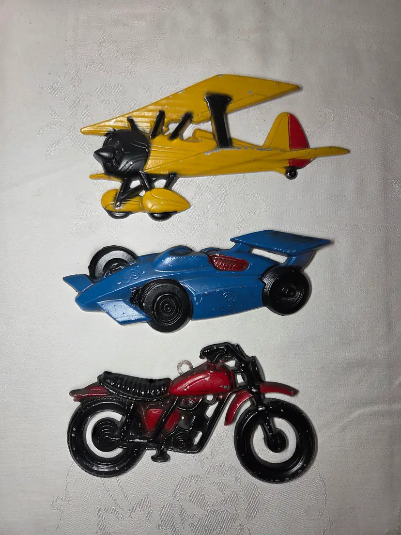 This vintage cast metal wall decor features a unique design of a motorcycle, airplane, and race car, perfect for a child's room decor. The multicolor decorations and retro style add a fun and playful touch to a teen or kid's bedroom. Made in the United States by Homco, this medium-sized wall-mounted metal decor is both indoor and decorative, creating a nostalgic and eye-catching look. Ideal for a boys room, this piece adds character and personality to any space.