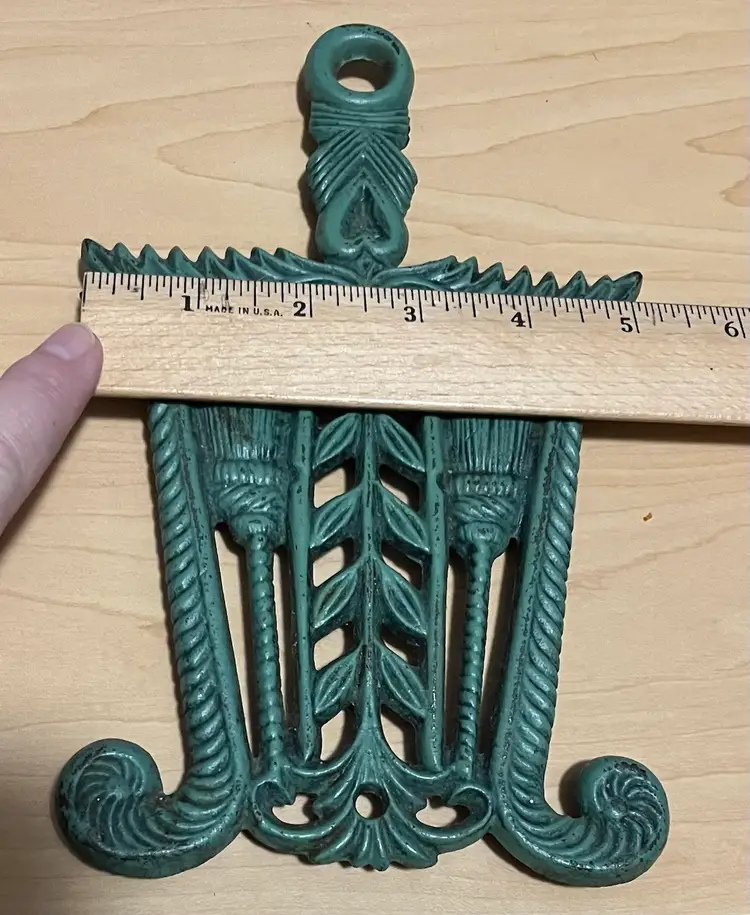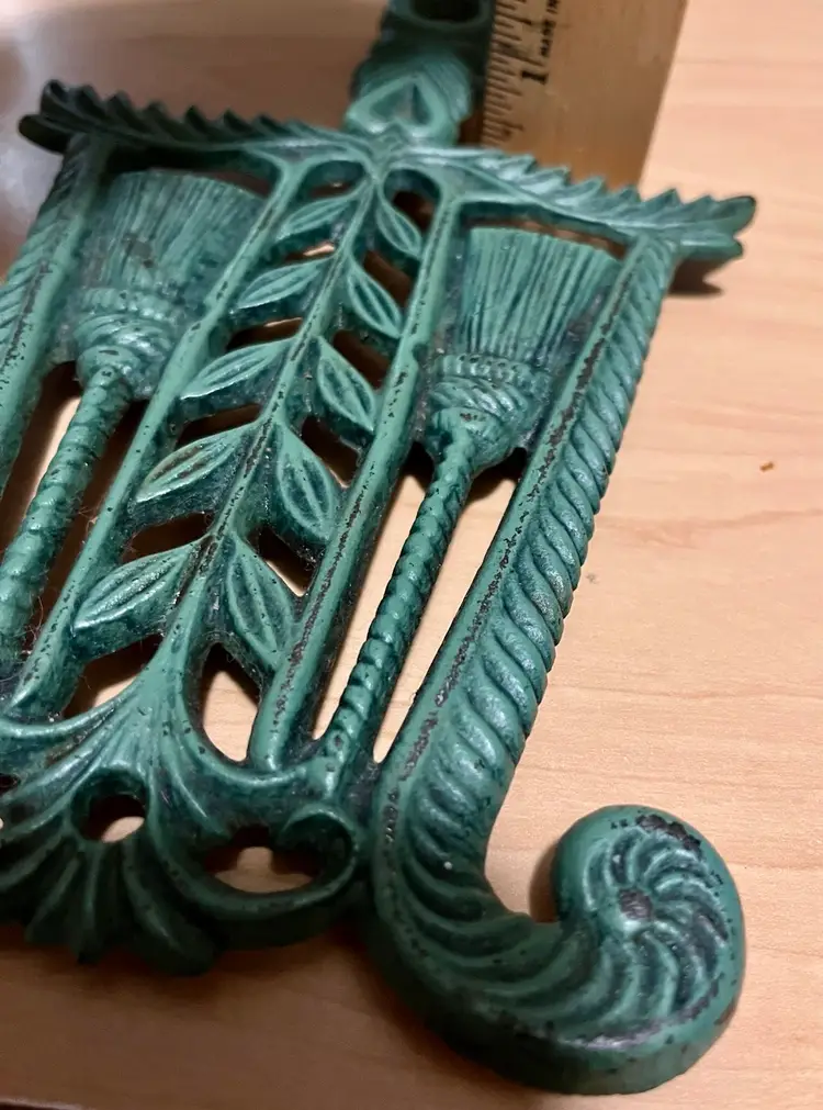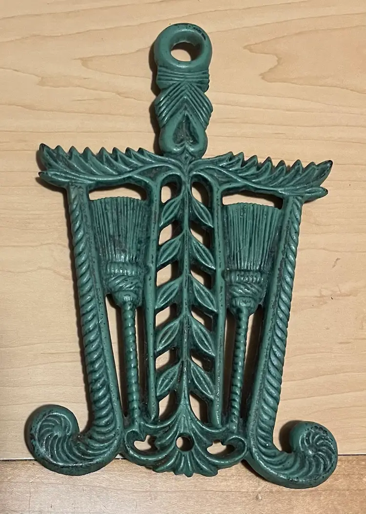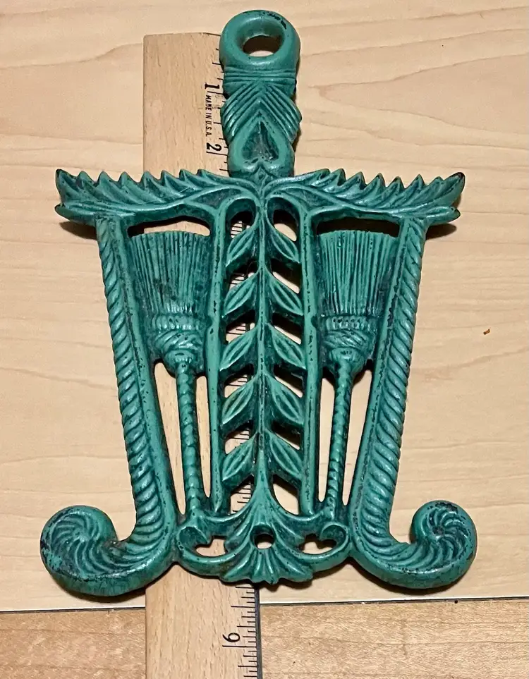 The product is a vintage Wilton 10-footed kitchen trivet made of cast iron with a unique broom design in a green wash over black finish. It can also be hung on the wall. This rectangular trivet, measuring approximately 8.5 inches in length and 5 inches in width, at 14.4 ounces was manufactured in the United States during the 1950s ~ 1970s. This piece may have been manufactured for the lead-up to the nation’s Bicentennial celebrations of all things colonial. Wilton Products, Inc. was a company based in Wrightsville, Pennsylvania, that manufactured cast iron products, including trivets, from 1935 until 1989.