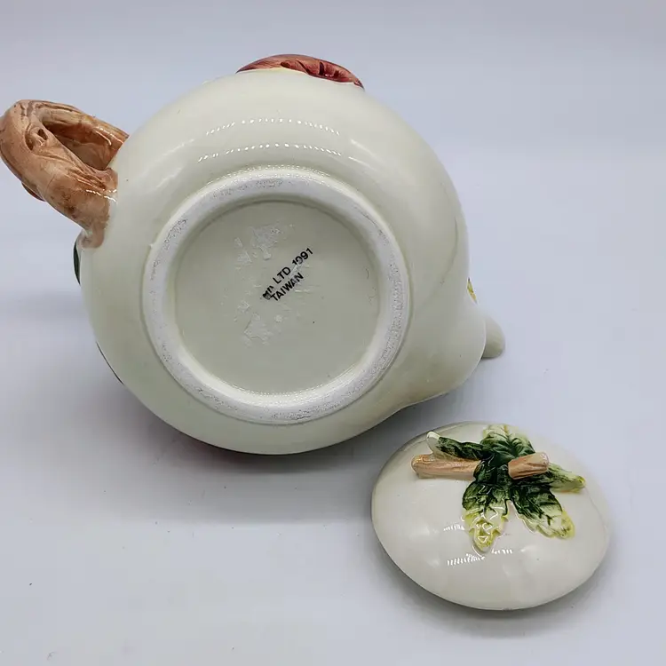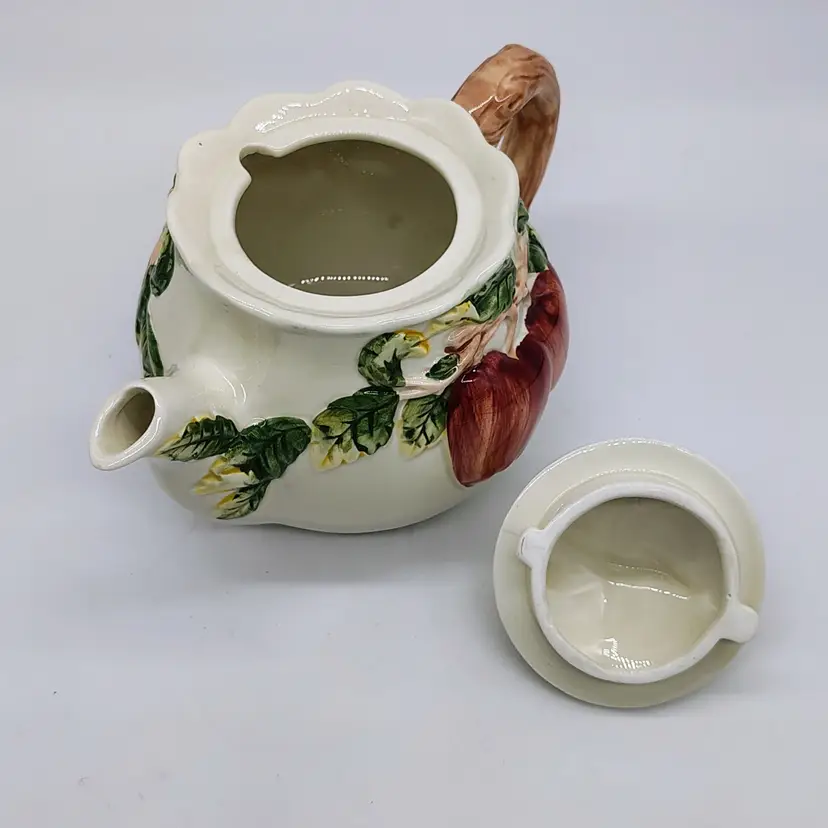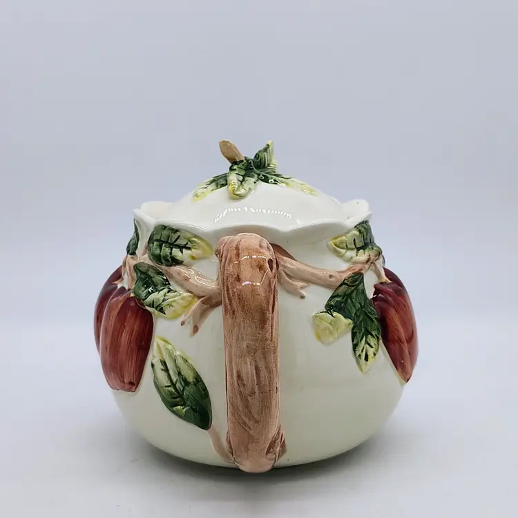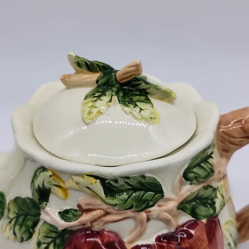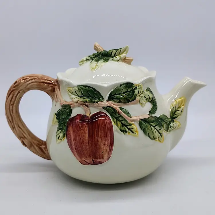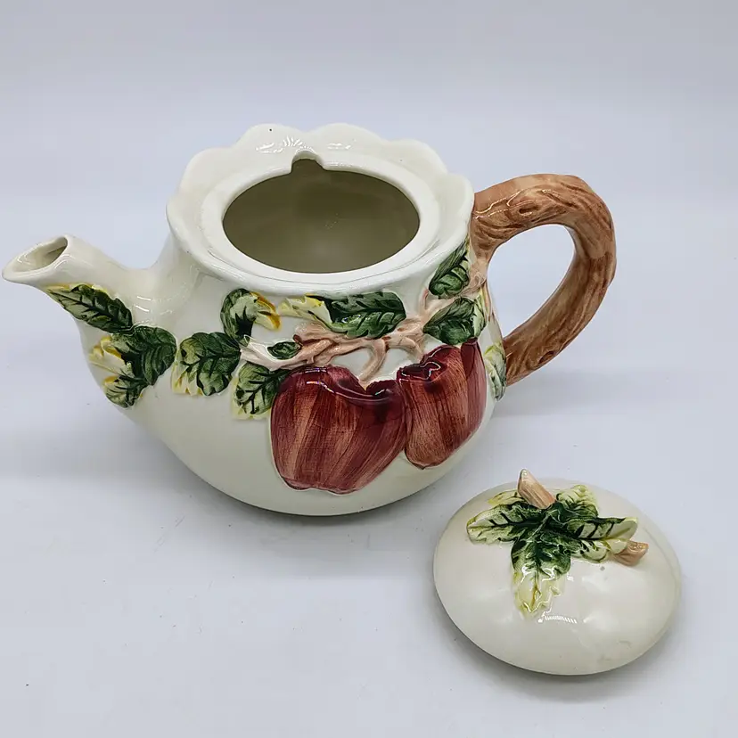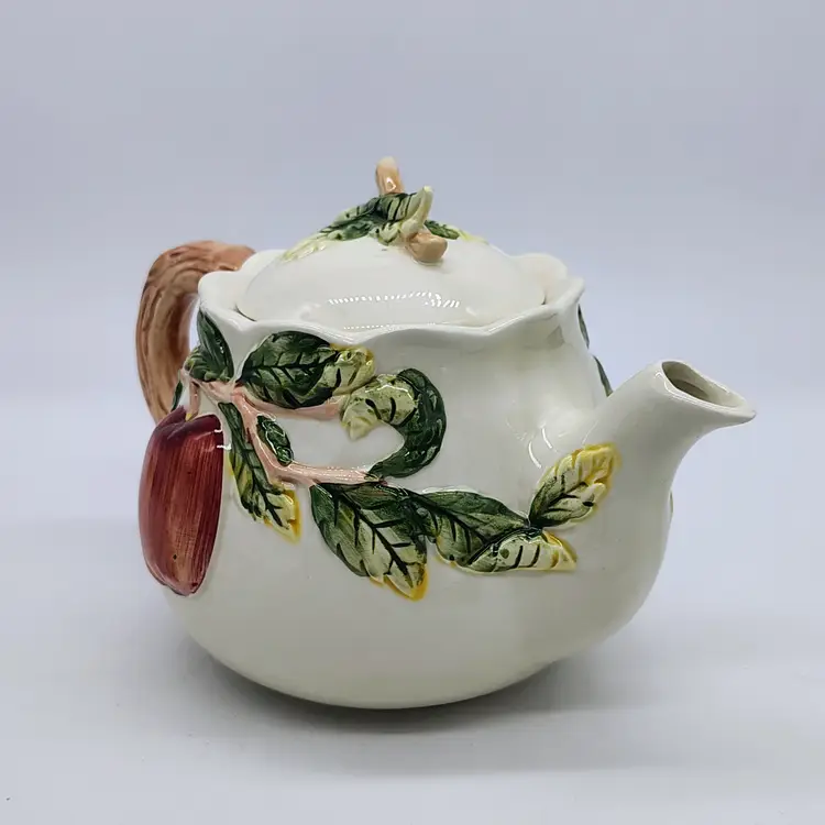 This raised apple motif ceramic teapot has a locking ceramic lid. No chips or cracks noted.