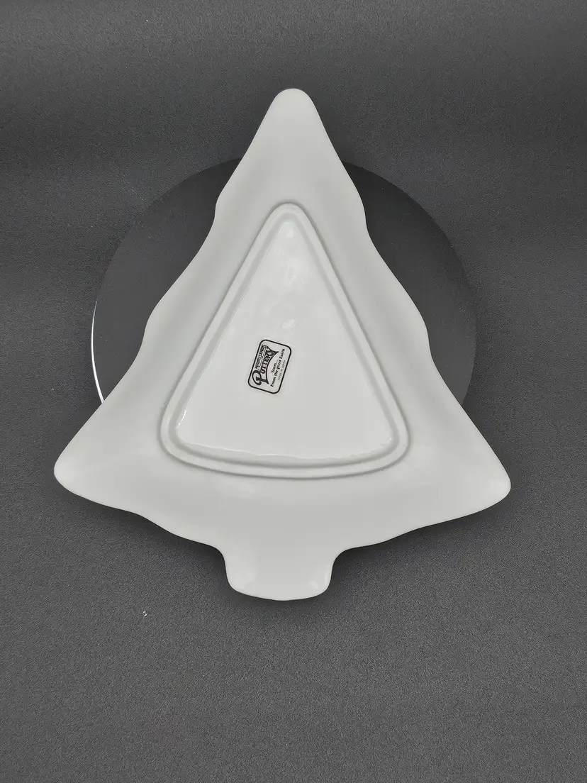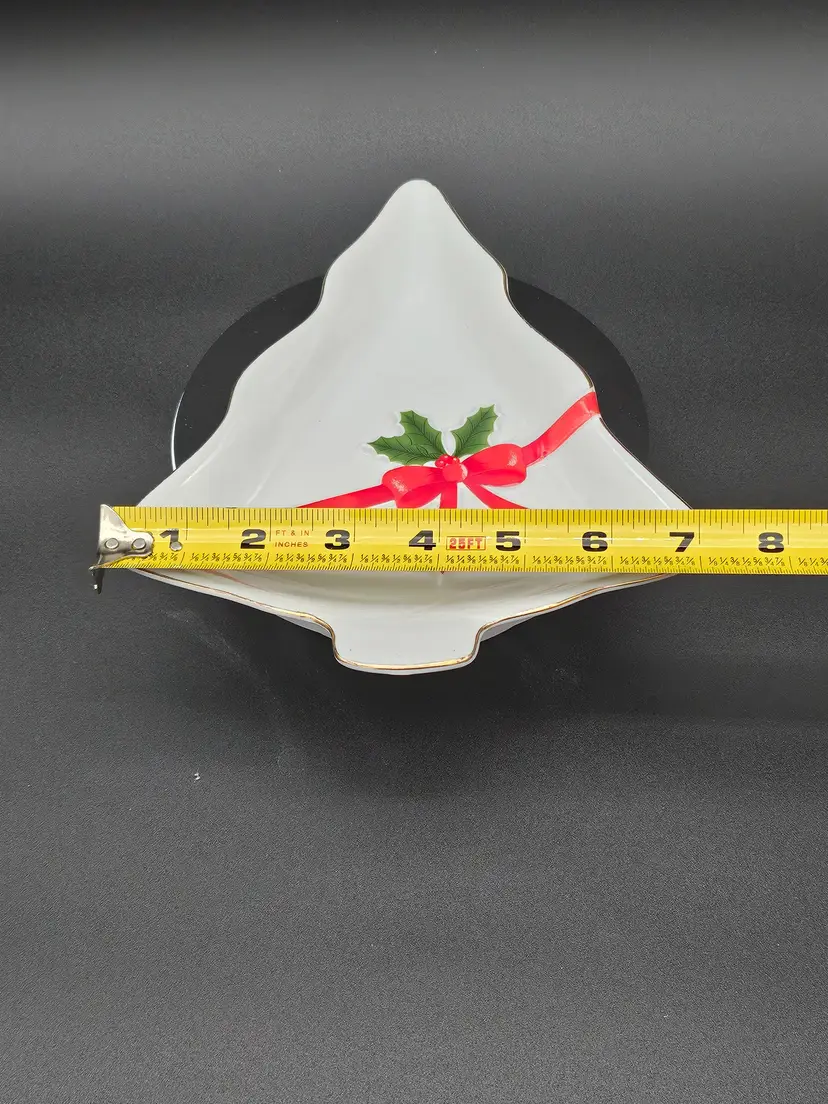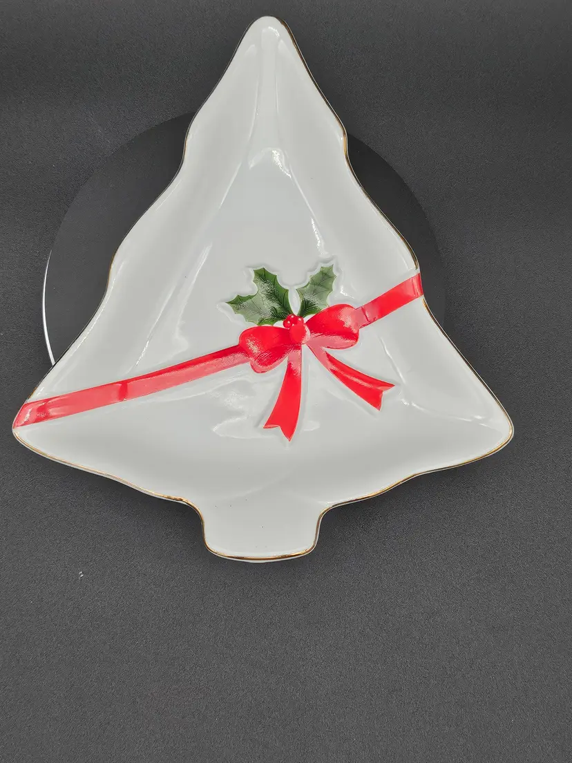 This vintage ceramic Christmas tree trinket dish by Mount Clemens Pottery features a beautiful white, red, and green color scheme with holly and gold trim. It is perfect for any room in your home, whether you choose to display it on your desk, shelf, or mantel.