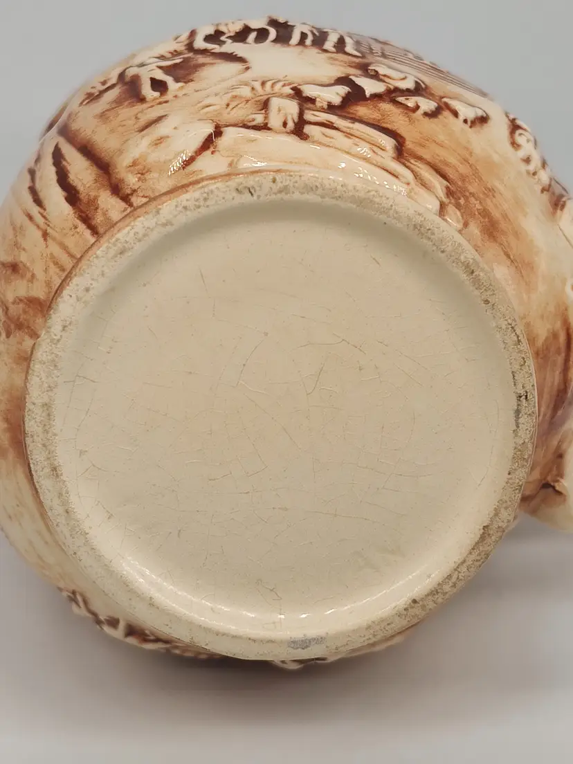 This sweet pitcher has an embossed forest with long cabin scene. Carmel and cream color scheme. One small chip at the base as noted in the picture.