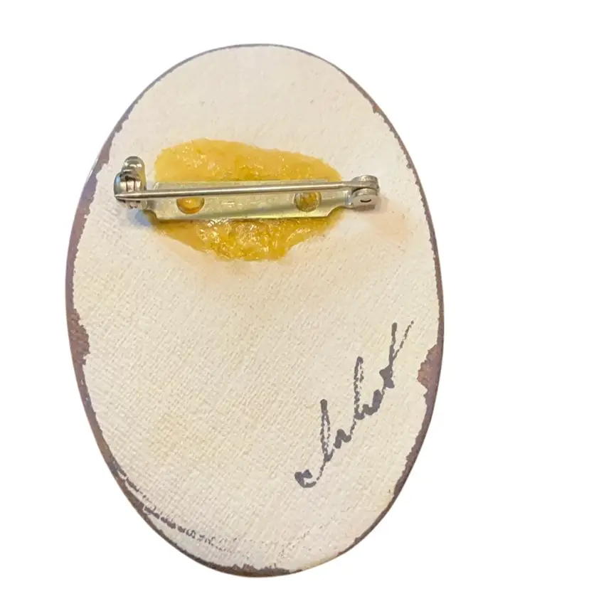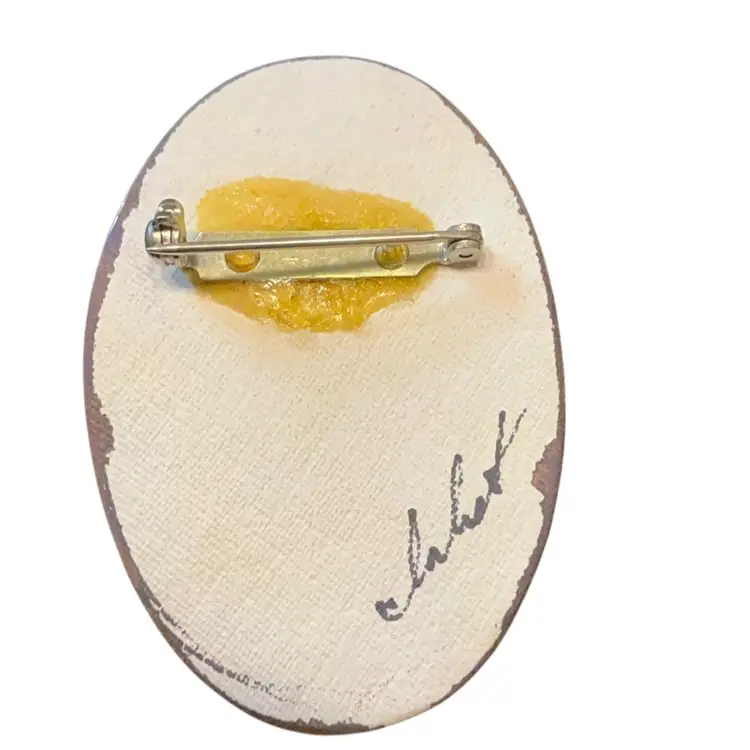 VTG brooch oval with tulip, iris and daffodil handpainted and signed by artist. Measures 2x1.5 inches