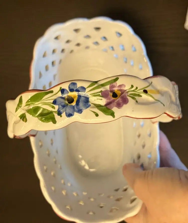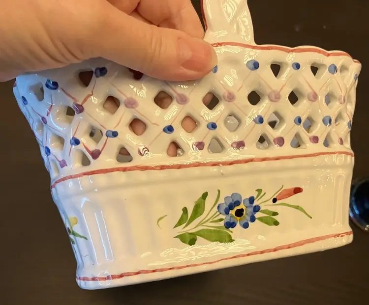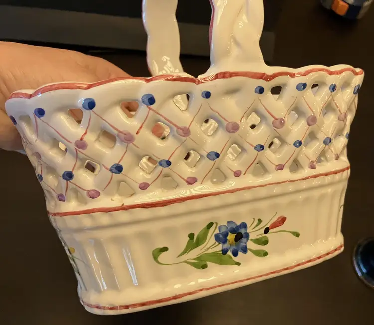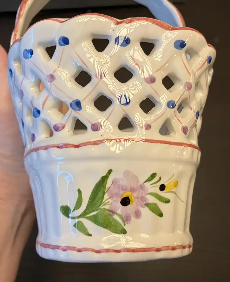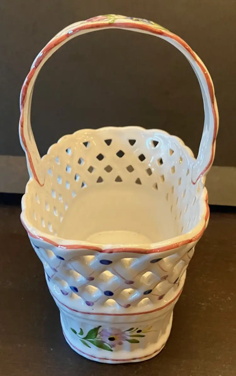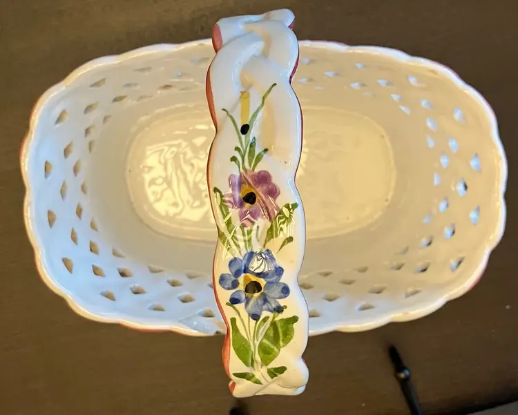 White glazed with florals basket weave vase container. There is a chip off on the inside of the rim area near the handle which has caused a sharp area on the rim (see the images). Made in Portugal. Measurements: 7 1/2" long, 4 3/4" wide, 8" tall with the handle and 4" tall without the handle. Weighs 1 lb, 2 oz before packaging.
