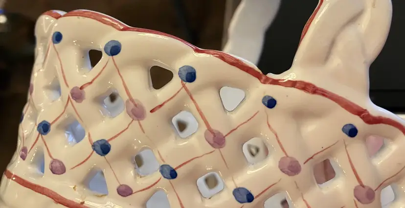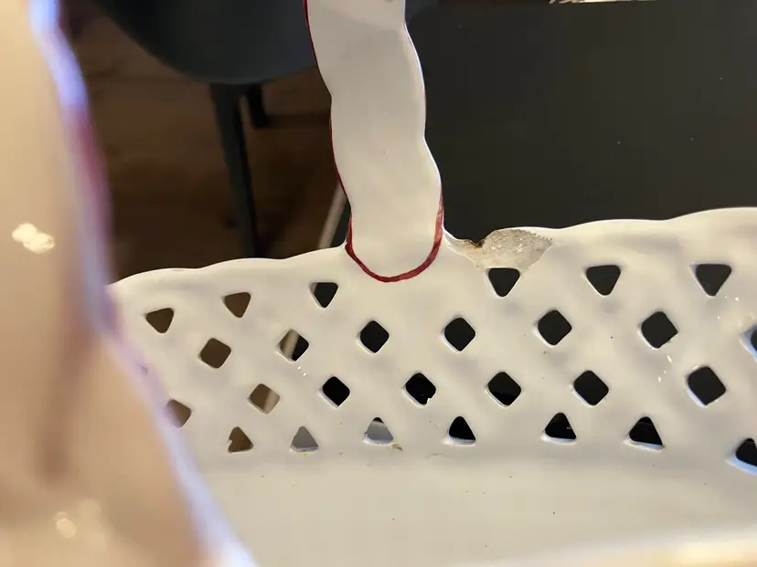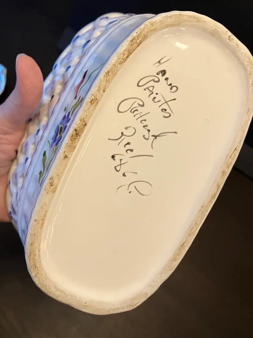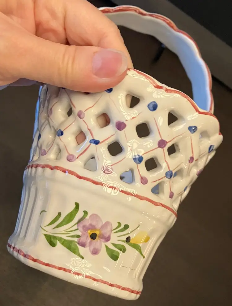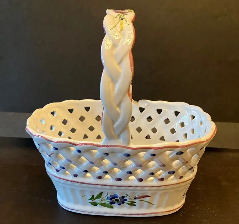 White glazed with florals basket weave vase container. There is a chip off on the inside of the rim area near the handle which has caused a sharp area on the rim (see the images). Made in Portugal. Measurements: 7 1/2" long, 4 3/4" wide, 8" tall with the handle and 4" tall without the handle. Weighs 1 lb, 2 oz before packaging.