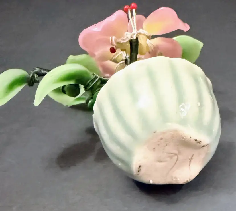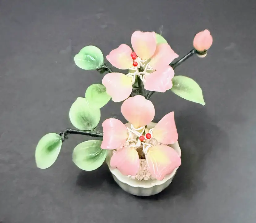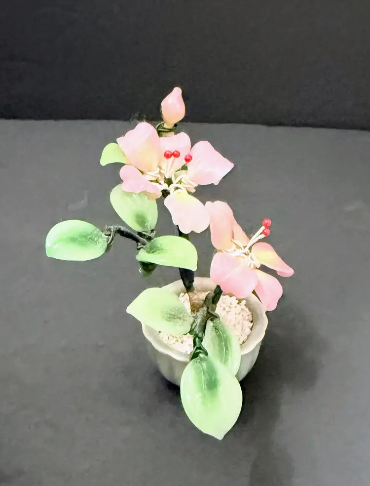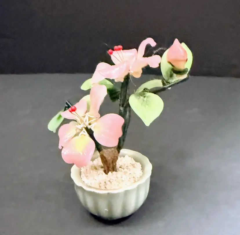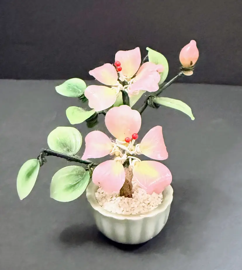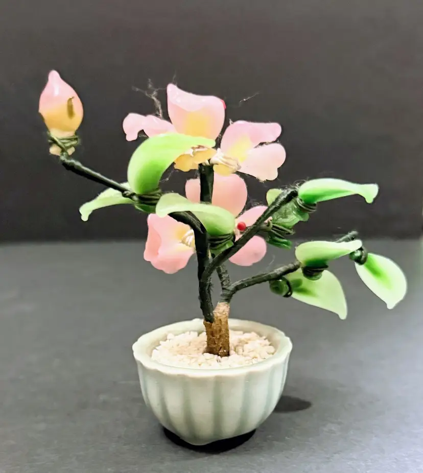 This product is a vintage Chinese antique jade bonsai tree with a small celadon green pot, featuring a pink flower design. Handmade in Japan, this unique piece showcases the intricate craftsmanship of Chinese culture. With a provenance and ownership history not available, this jade tree is a collector's item that embodies traditional Asian aesthetics. Personalized and authentic, this bonsai tree adds a touch of elegance and history to any space.