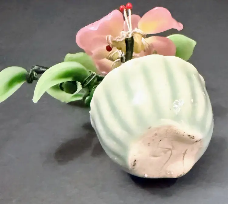 VTG CHINESE ANTIQUE JADE BONSAI TREE PINK FLOWER SMALL CELADON GREEN POT