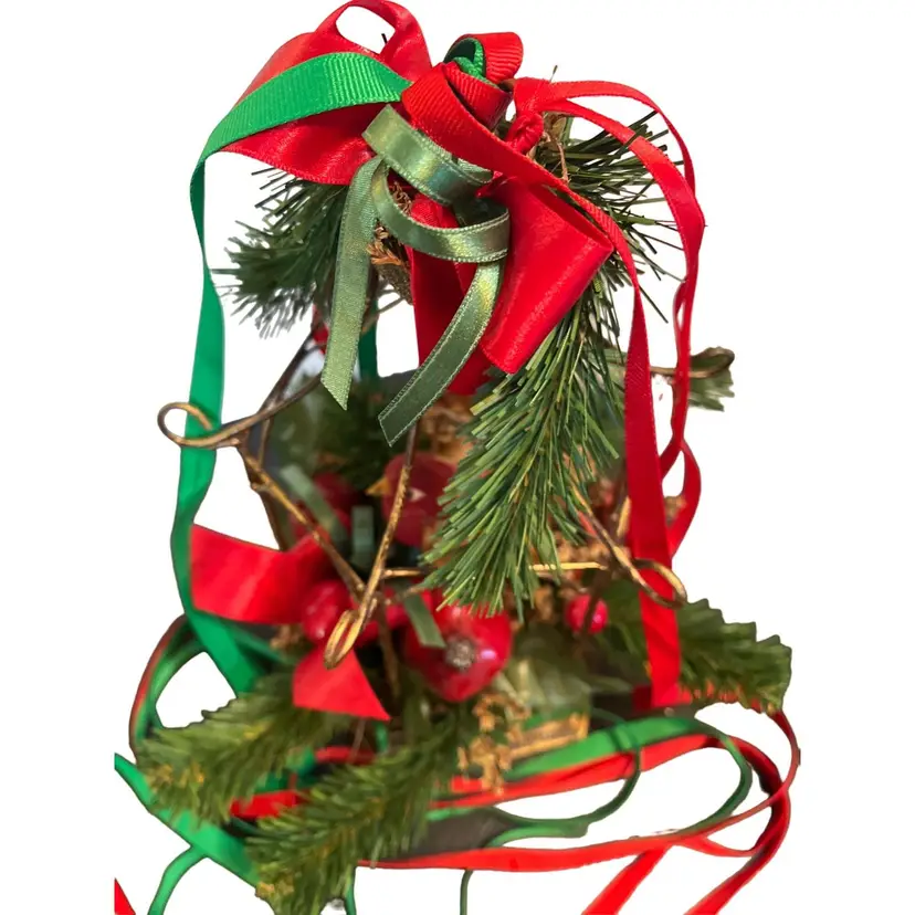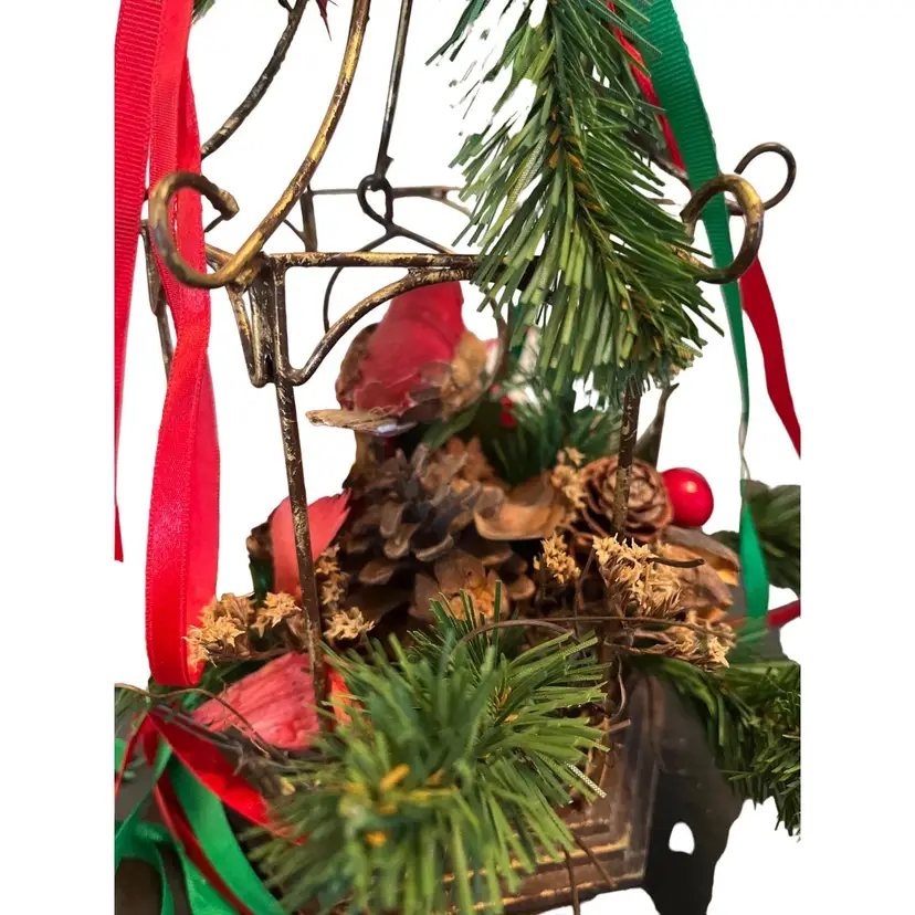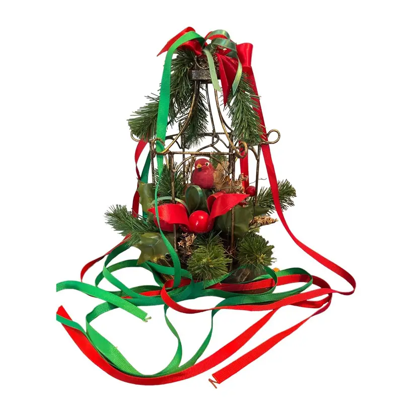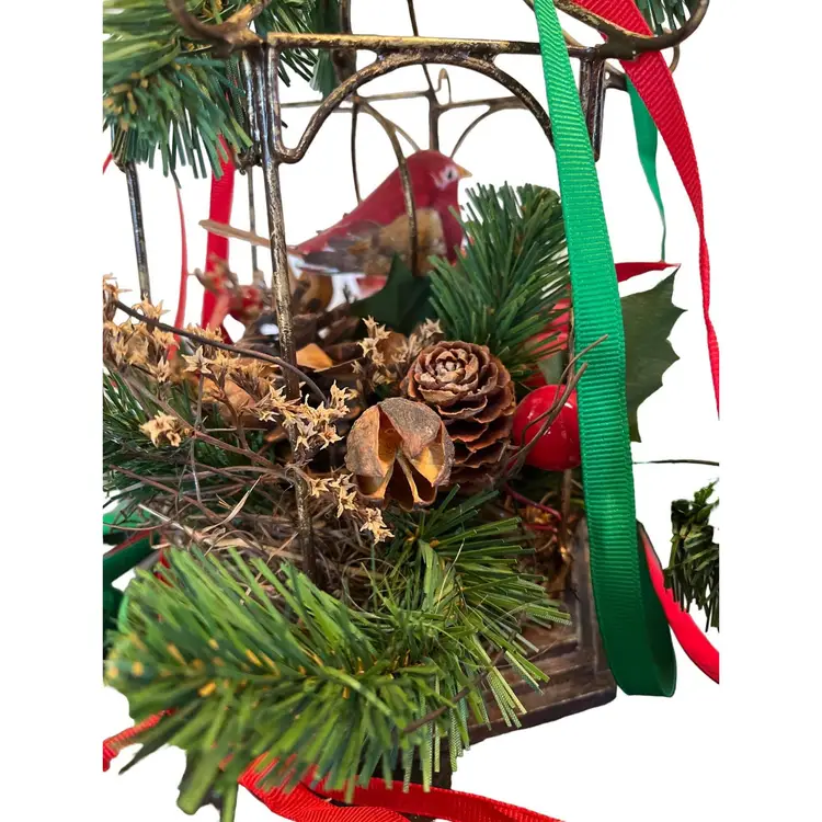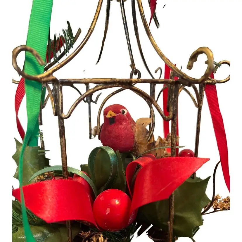 Vtg Christmas MCM Cardinal Metal Bird Cage Hanging Holly Ribbon 10.5" Tall