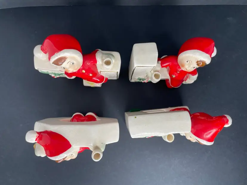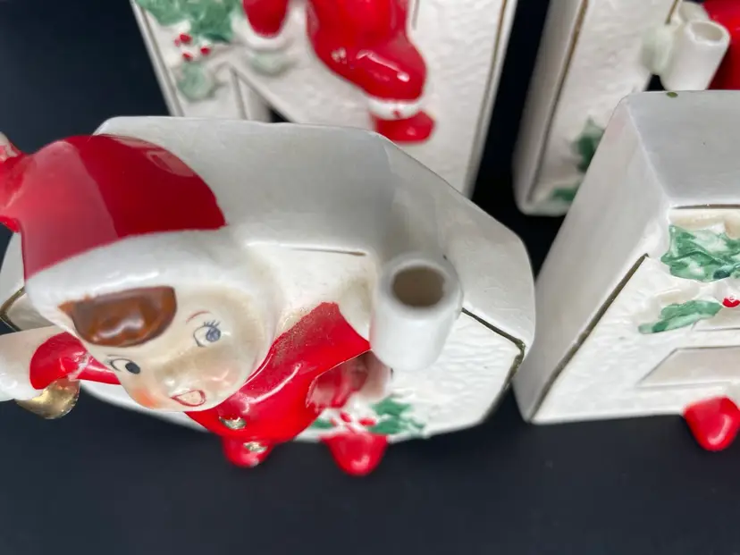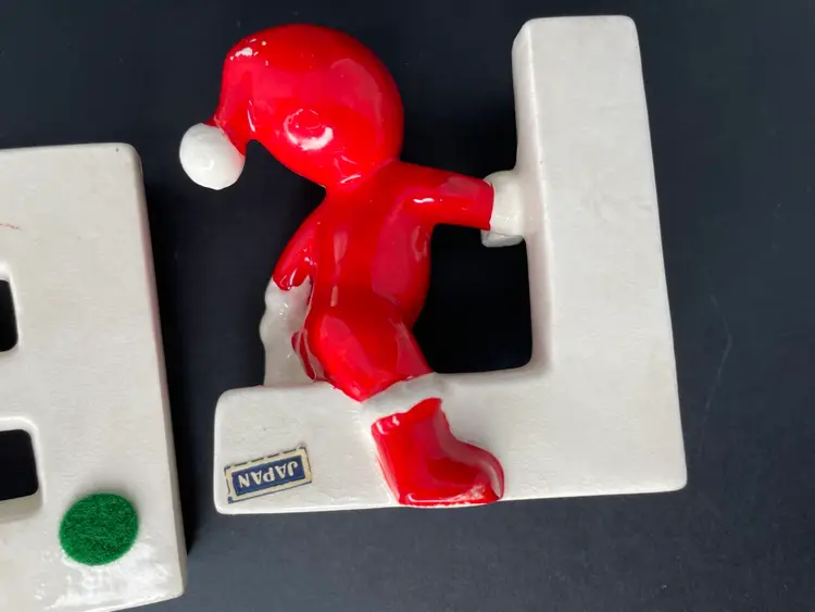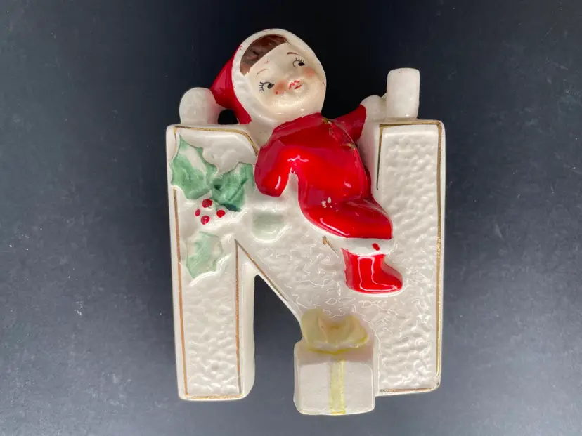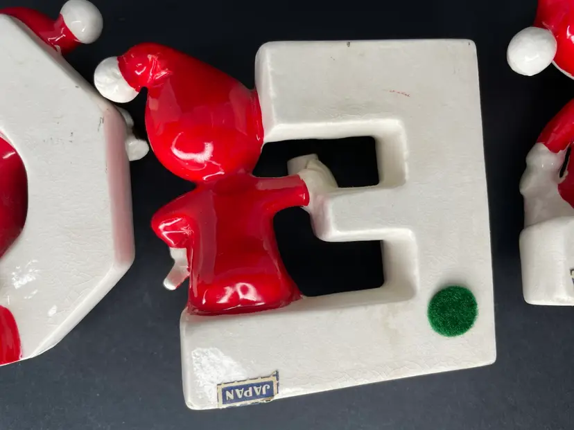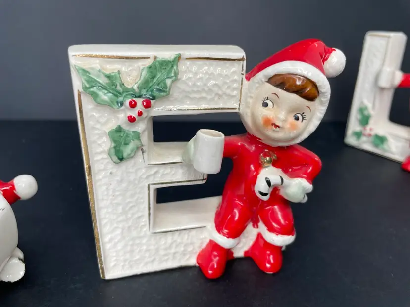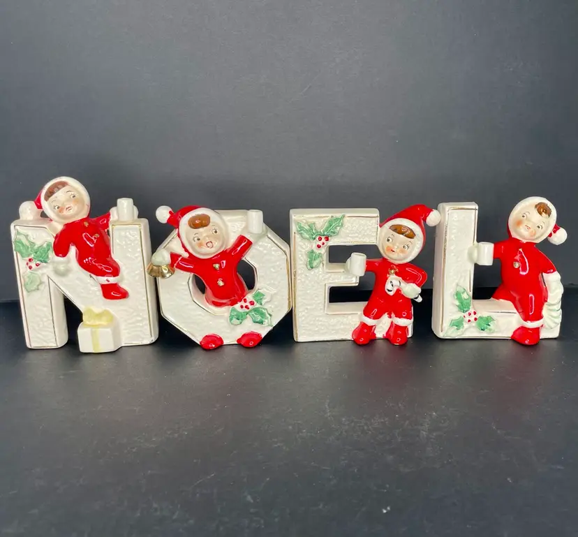 Add some vintage charm to your Christmas decor with this adorable set of hand-painted ceramic figurines. Featuring the letters "NOEL" and adorable elves, these cute figurines are perfect for adding a touch of whimsy to your holiday decorations. Made in Japan in the 1950s, this original set includes four medium-sized figurines measuring 3.5 inches in height and 3 inches in length each, with a glossy finish and colorful details.