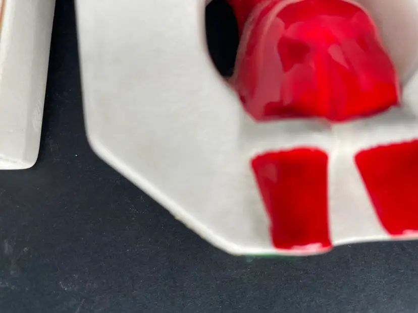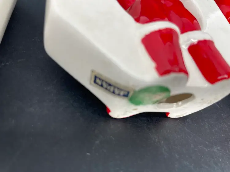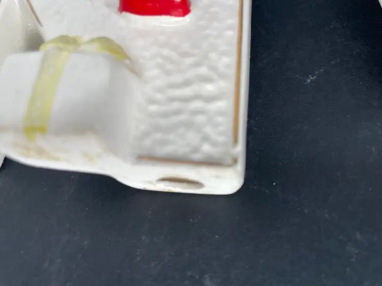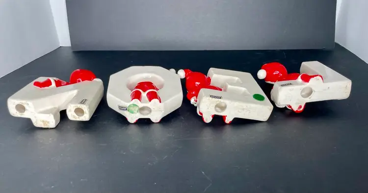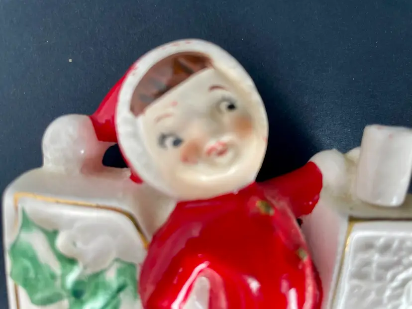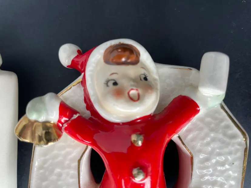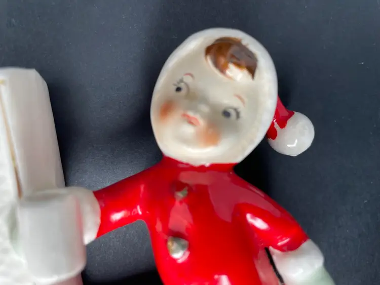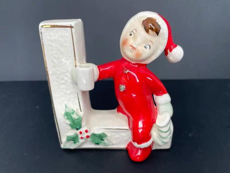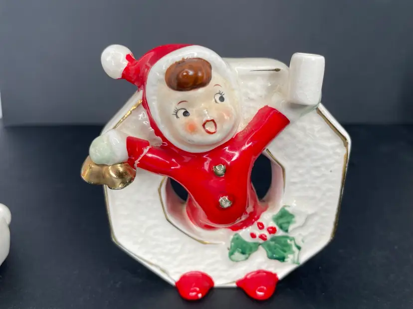 Add some vintage charm to your Christmas decor with this adorable set of hand-painted ceramic figurines. Featuring the letters "NOEL" and adorable elves, these cute figurines are perfect for adding a touch of whimsy to your holiday decorations. Made in Japan in the 1950s, this original set includes four medium-sized figurines measuring 3.5 inches in height and 3 inches in length each, with a glossy finish and colorful details.