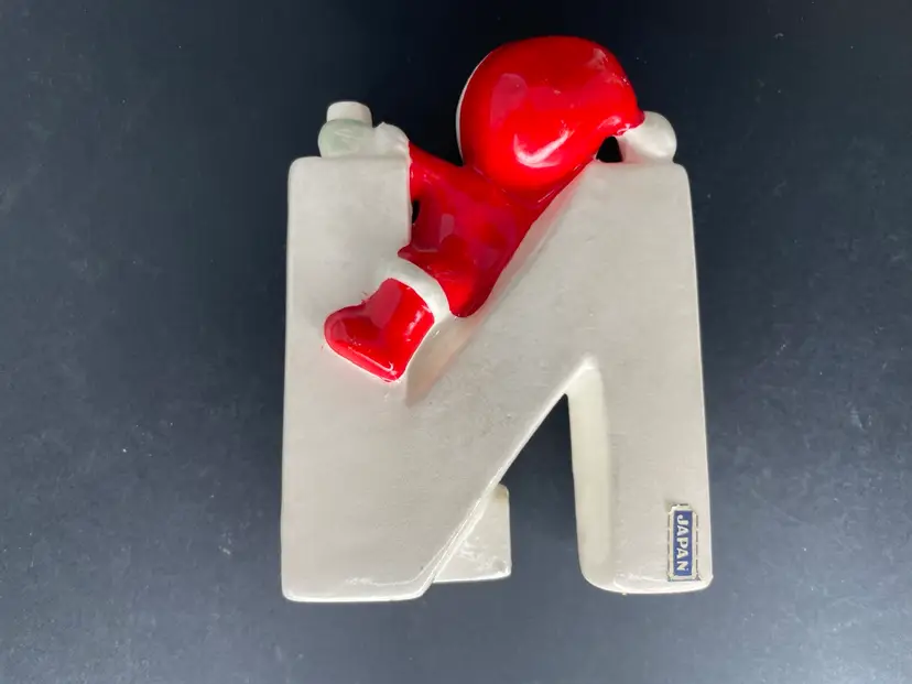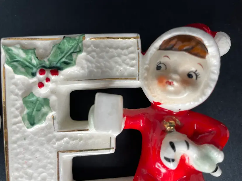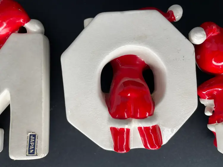 Each letter can hold a tiny candle. All have Japan stickers. Some have green felt dots for protection. Small flaw on bottom of N, not a chip. Crazing throughout. Some overpaint. Very nice condition.