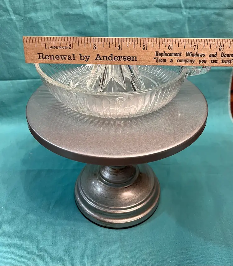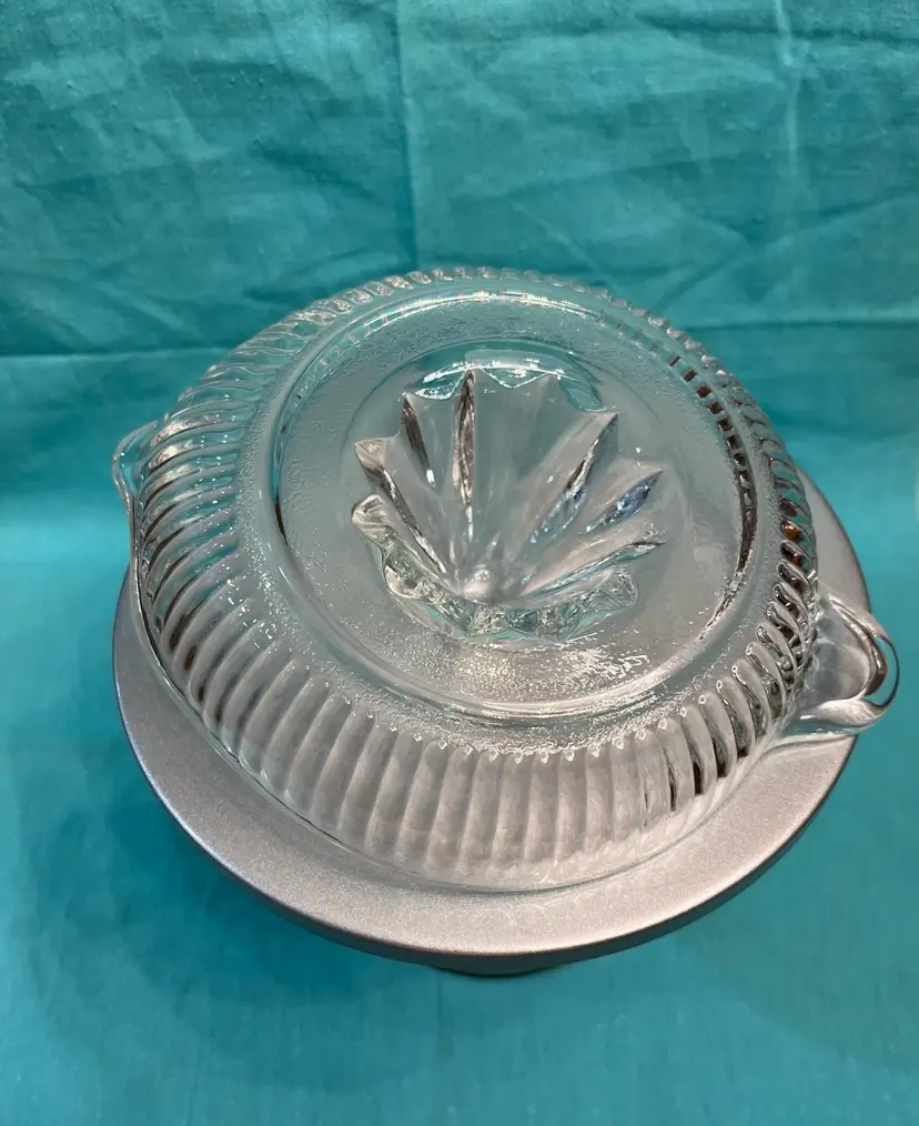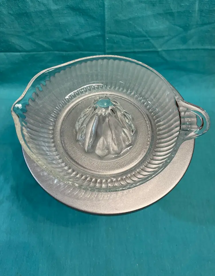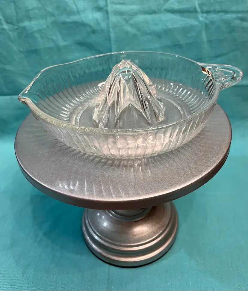 #842 VTG Clear Glass Citrus Reamer Juicer measures 1.75 on the outside x 8” (from spout to end of handle) In excellent condition.